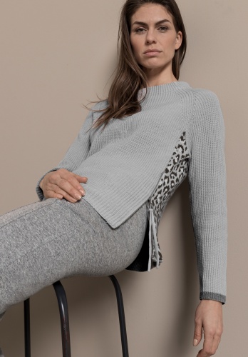 На сайте указаны российские размеры. Свитер крупной вязки с животным принтом сбоку. Высококачественная хлопковая смесь для удобной посадки. Боковая молния и контрастный низ рукавов. Круглый вырез, прямой крой, слегка удлиненная спинка. Длина джемпера в 44 размере - 62 см.