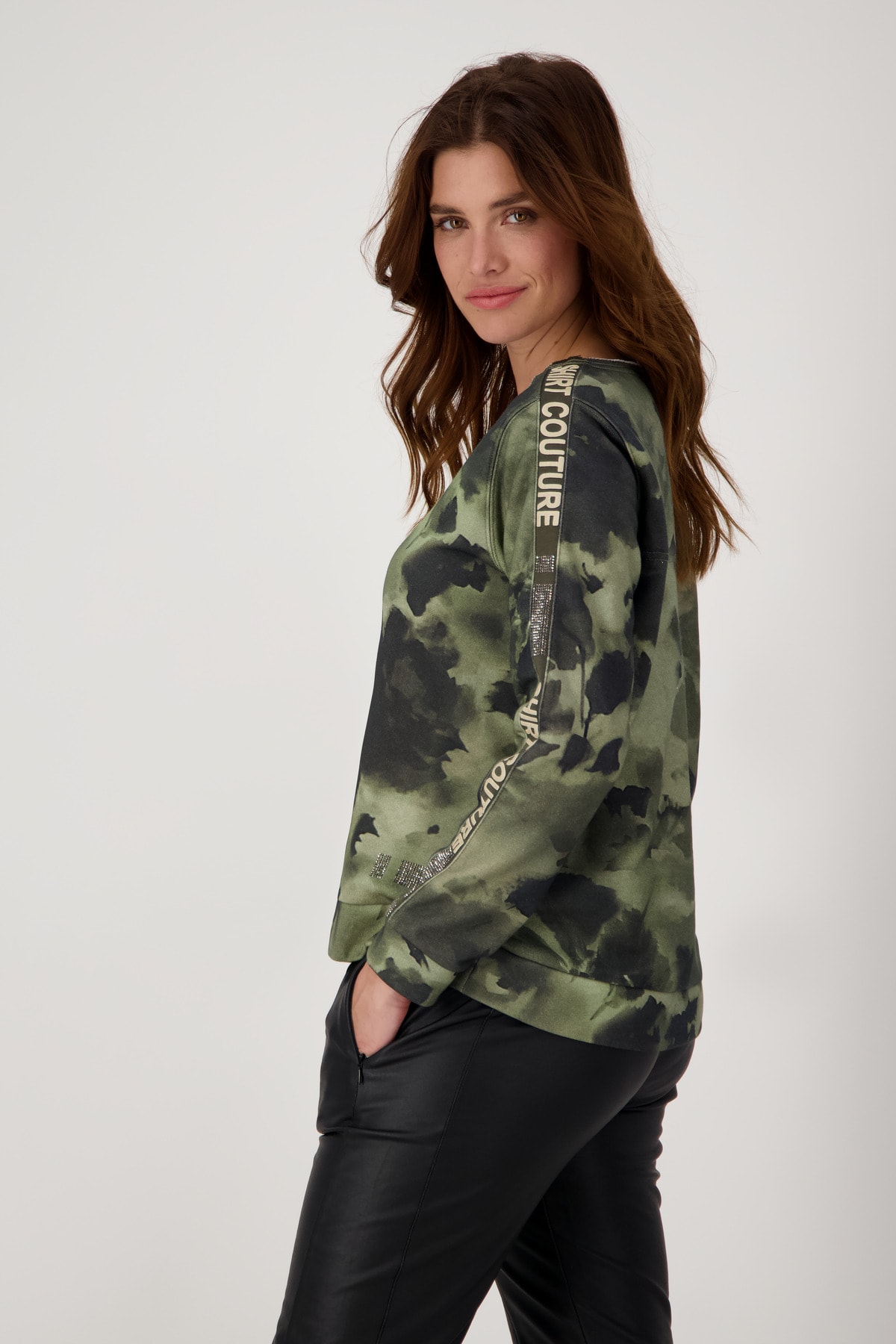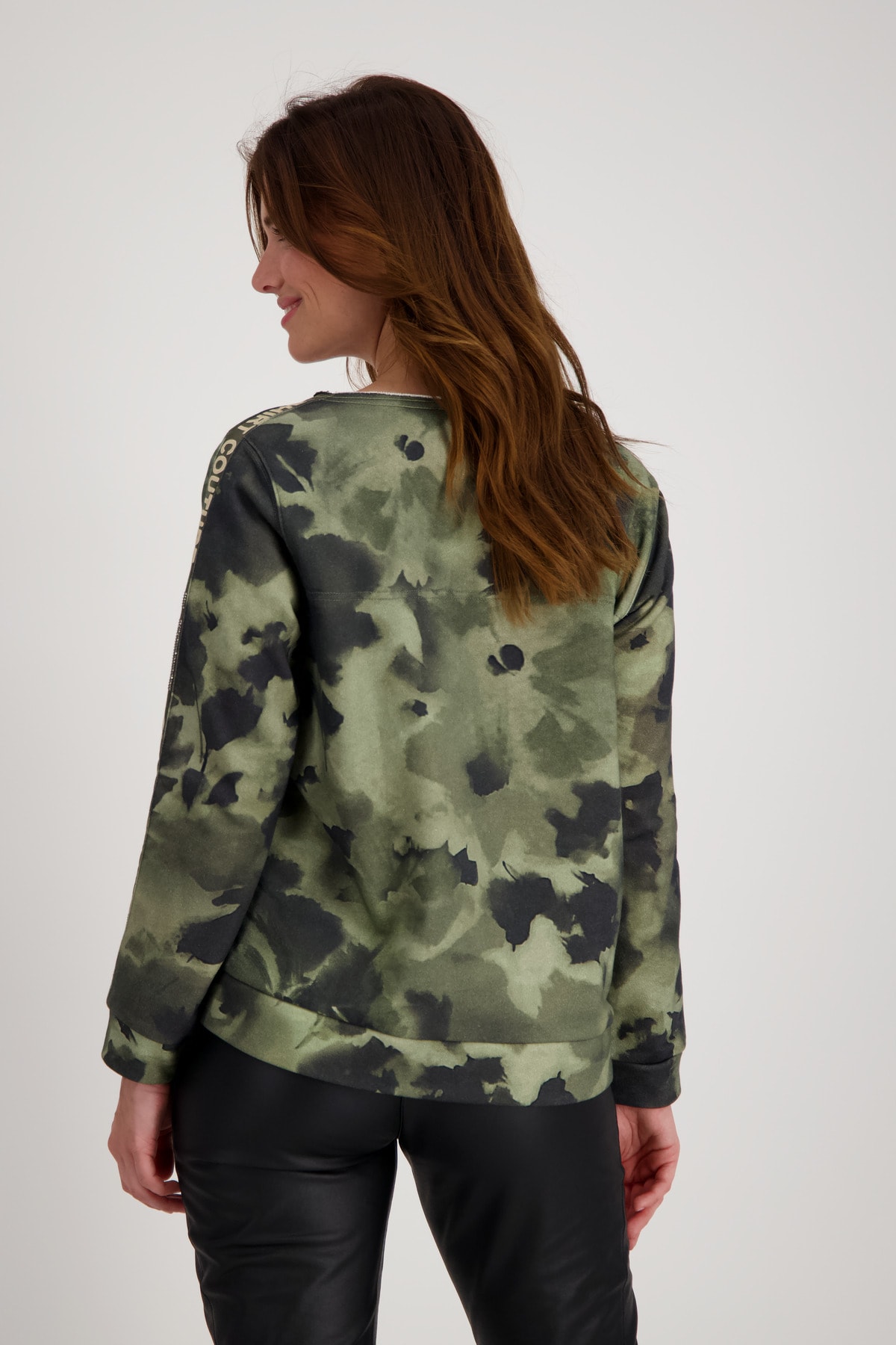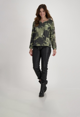 На сайте указаны российские размеры. Толстовка с круглым вырезом с принтом под батик и стразами. Модель с двусторонней молнией легко расстегивается и закрывается, а передняя часть модели с воротником-стойкой дополнена двумя прорезными карманами на молнии и прорезным карманом на уровне груди. Подол легко регулируется благодаря кулиске с резинками и стопорами шнура. Модель ростом 175 см. Длина спины 44 размера 64 см, а по переду - 62 см.