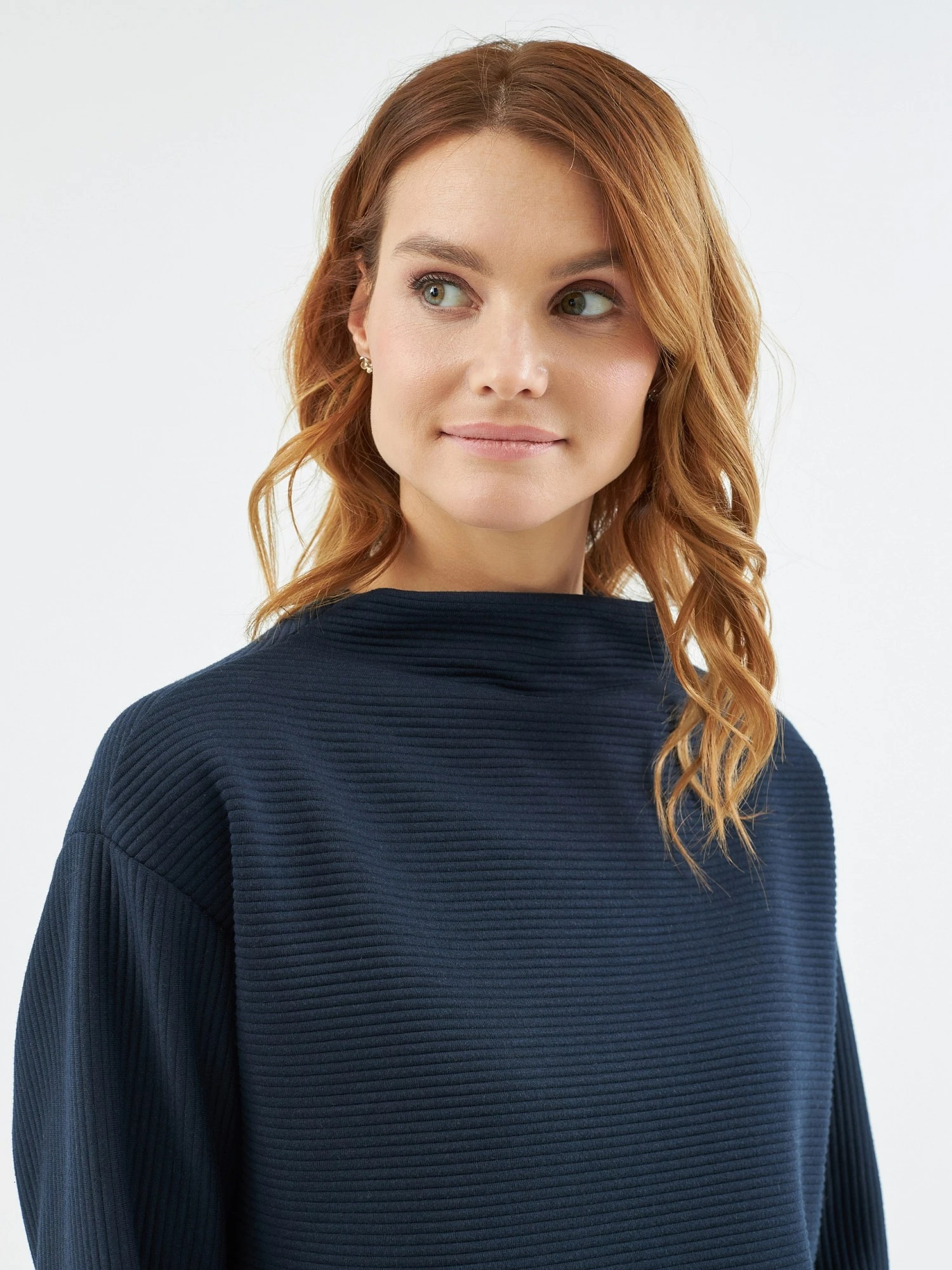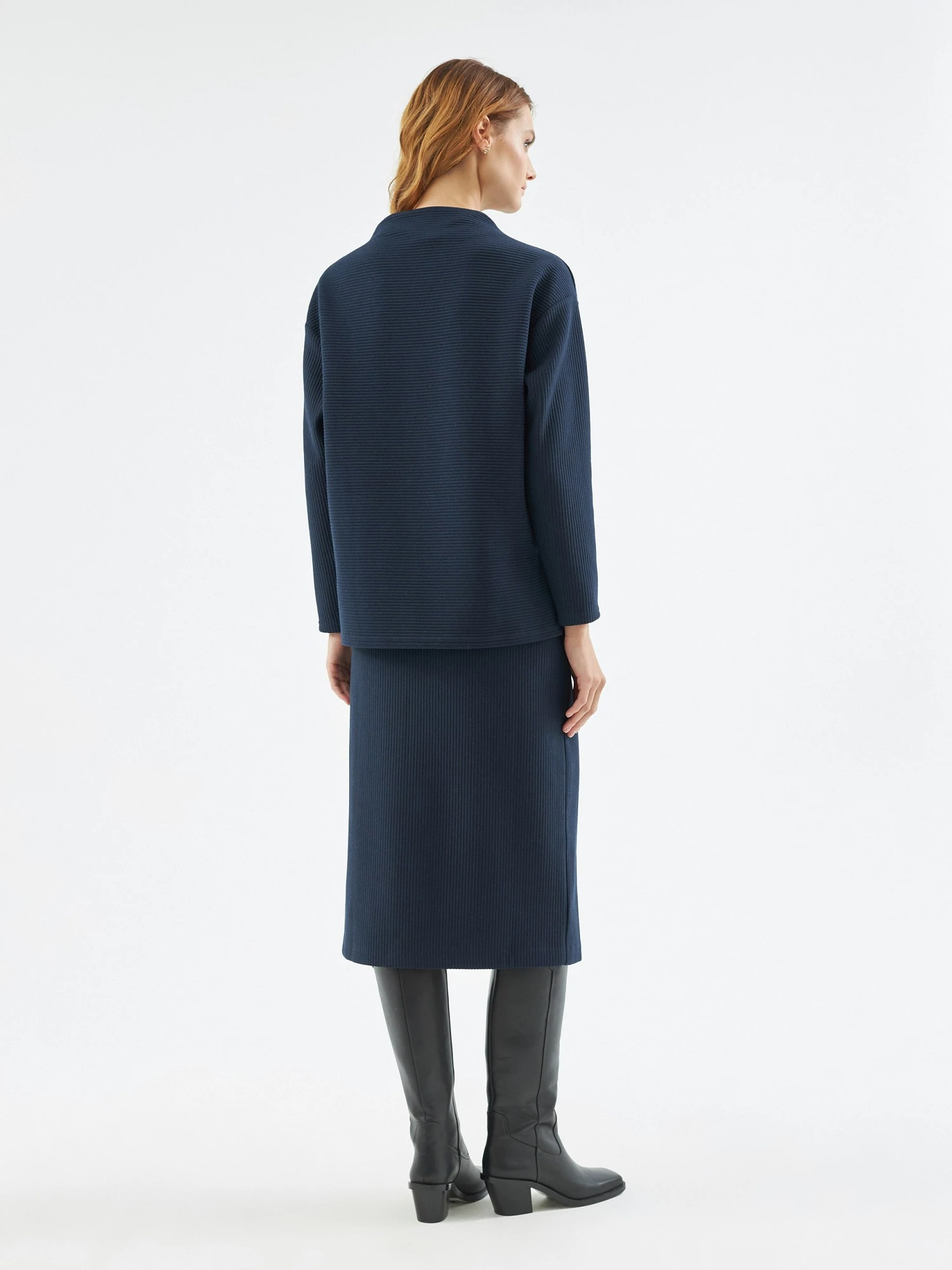 На сайте указаны российские размеры. Джемпер прямого силуэта из фактурного трикотажа тёмно-синего цвета, со спущенным плечом, рукавом полной длины и цельнокроеным воротником-стойка. Рост модели на фото - 175 см.