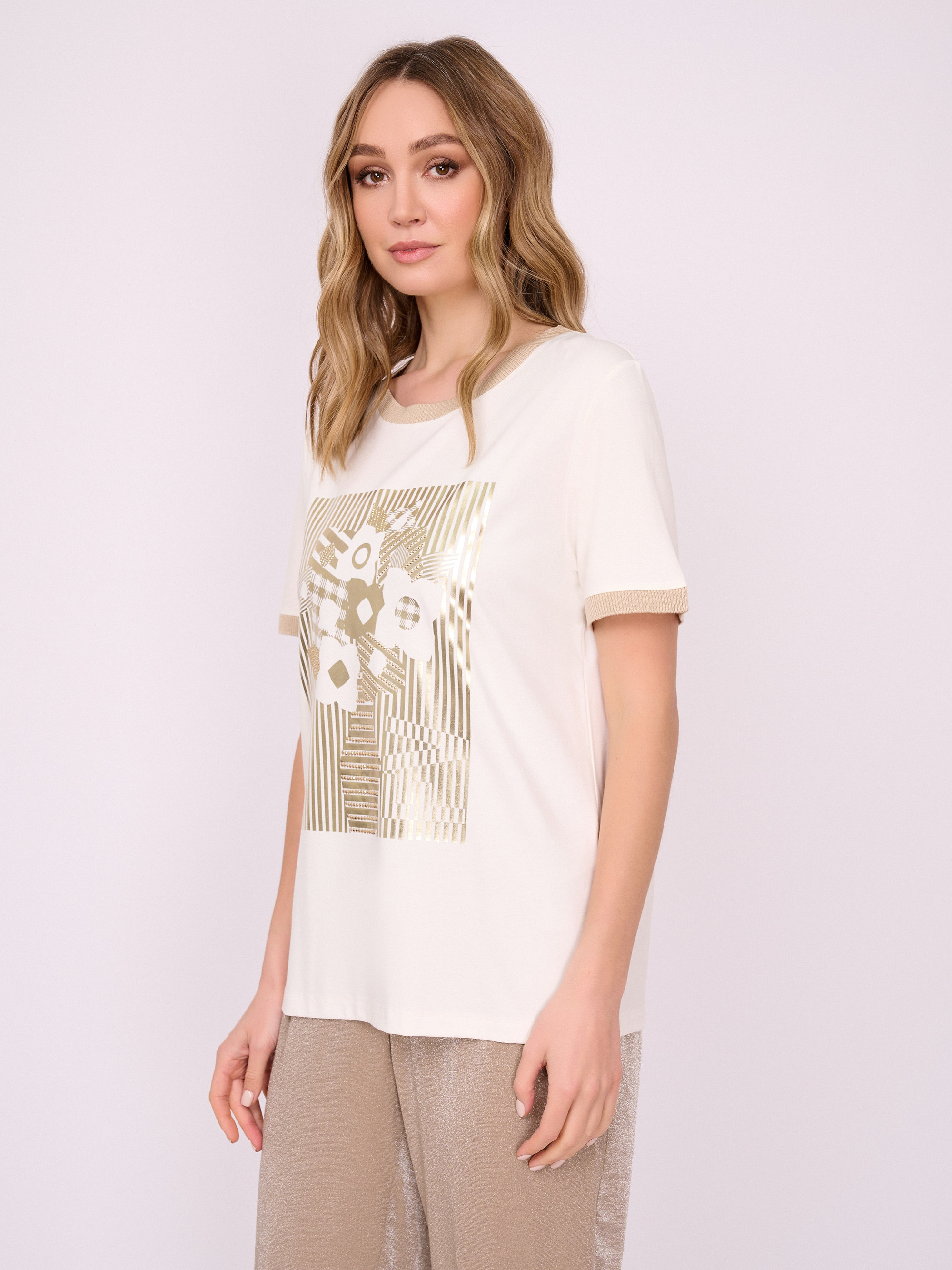 На сайте указаны российские размеры. Трикотажный прямой светло-бежевый джемпер с круглым вырезом, с коротким рукавом, с золотым абстрактным рисунком, со стразами. Длина по спинке: 60 см. Рост модели: 175 см.