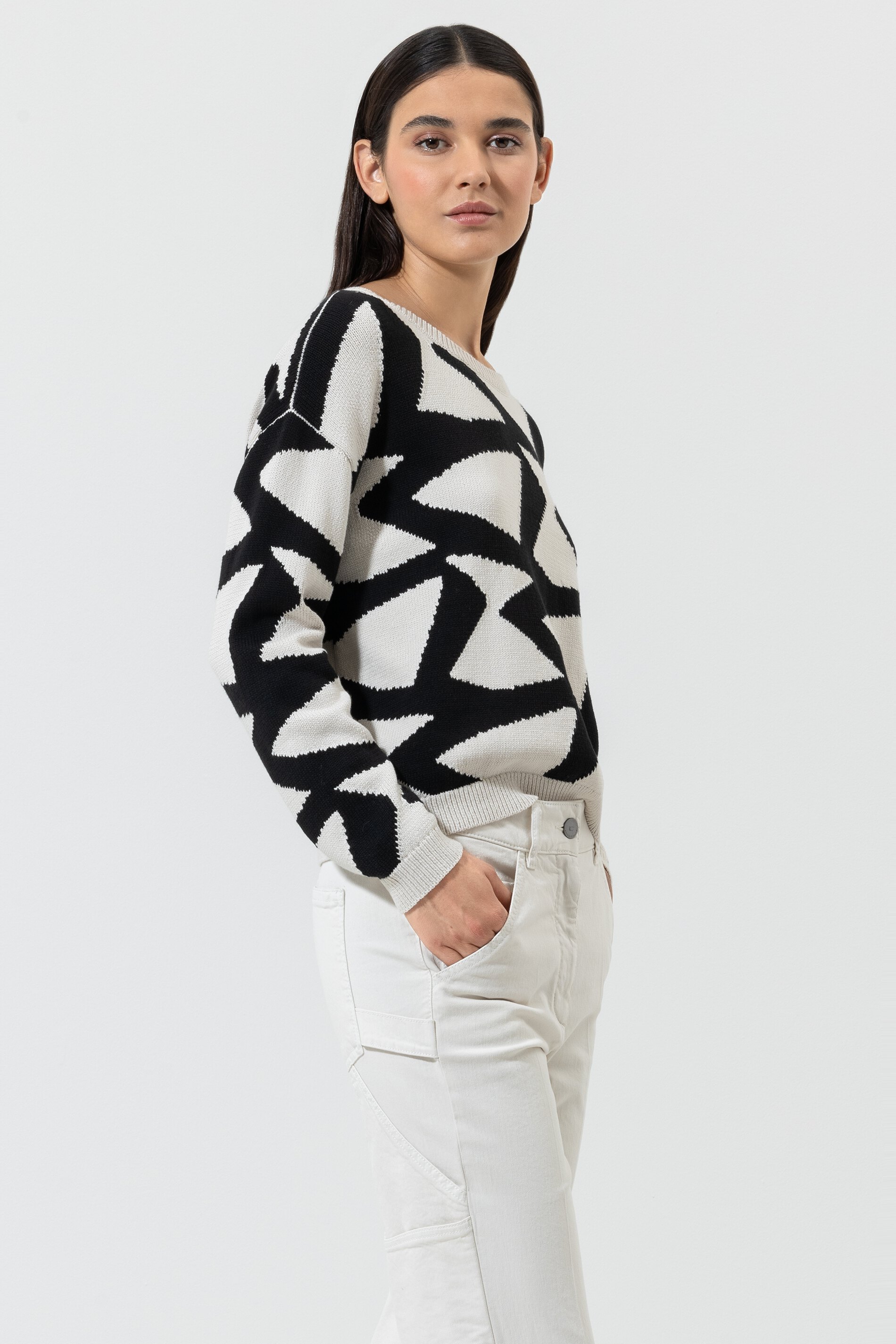 На сайте указаны российские размеры. Укороченный пуловер с круглым вырезом горловины в рубчик, манжетами и нижней каймой. Крупные узоры интарсии добавлены в легкую переплетенную хлопковую пряжу. Рост модели 178 см