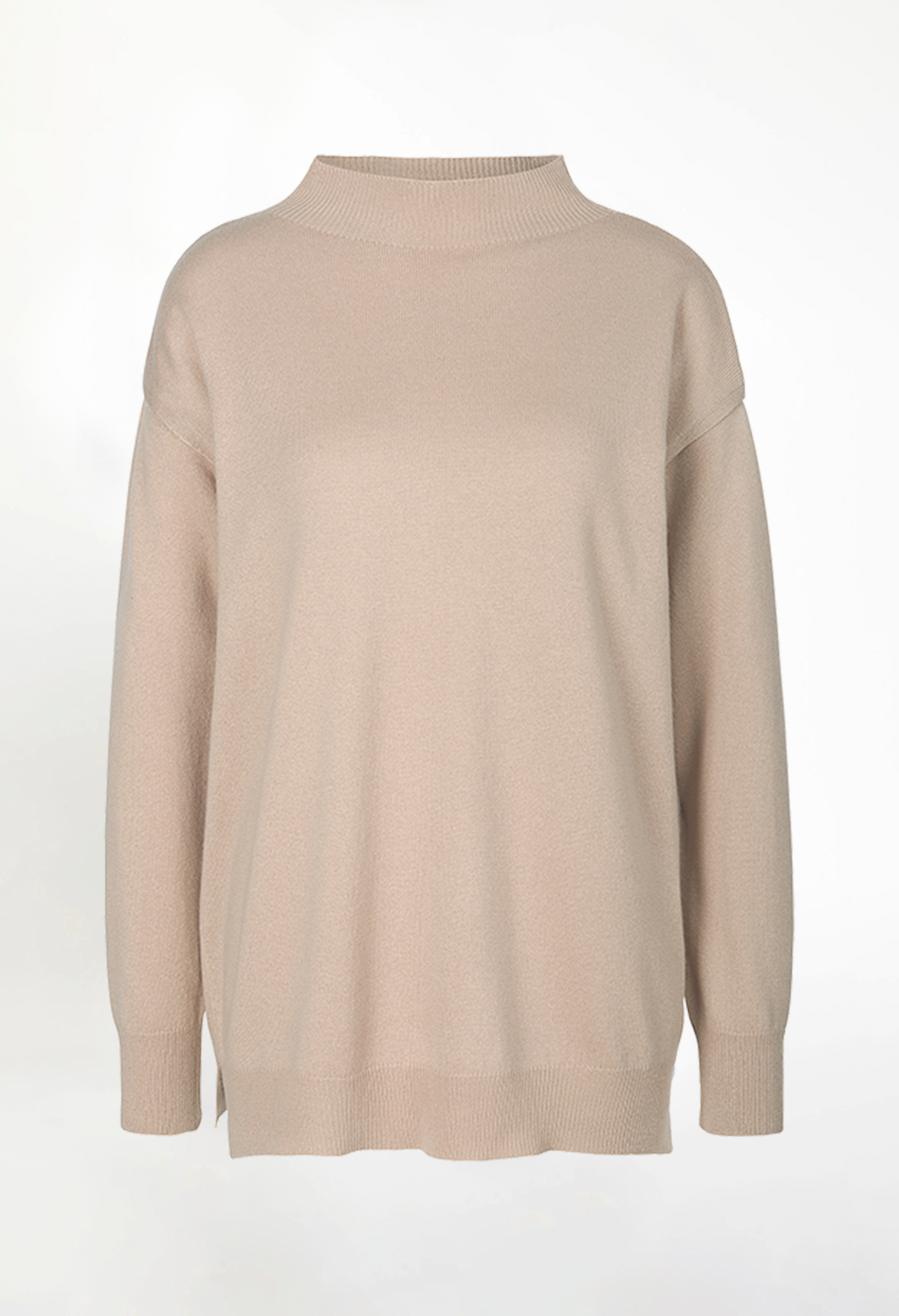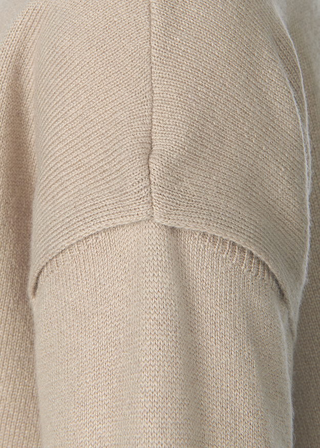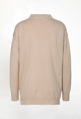 На сайте указаны российские размеры. Удобный свитер свободного кроя с воротником-стойкой использована высококачественная пряжа из мягкого кашемира, блестящего шелка и влагорегулирующей мериносовой шерсти. Модной деталью являются открытые плечи, из которых рукава кажутся плавно выступающими. Дизайн завершают манжеты и небольшие боковые разрезы по низу. Модель ростом 180 см.