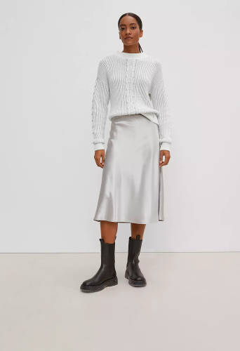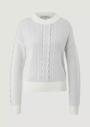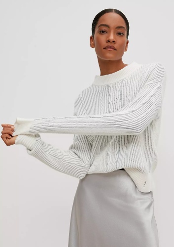 На сайте указаны российские размеры. Вязаный джемпер из смесовой шерсти. Длинные рукава, заниженная линия плеча. Детали: блестящая пряжа, узор спицами. Длина спины 57 см в размере 42 Рост модели 178 см.