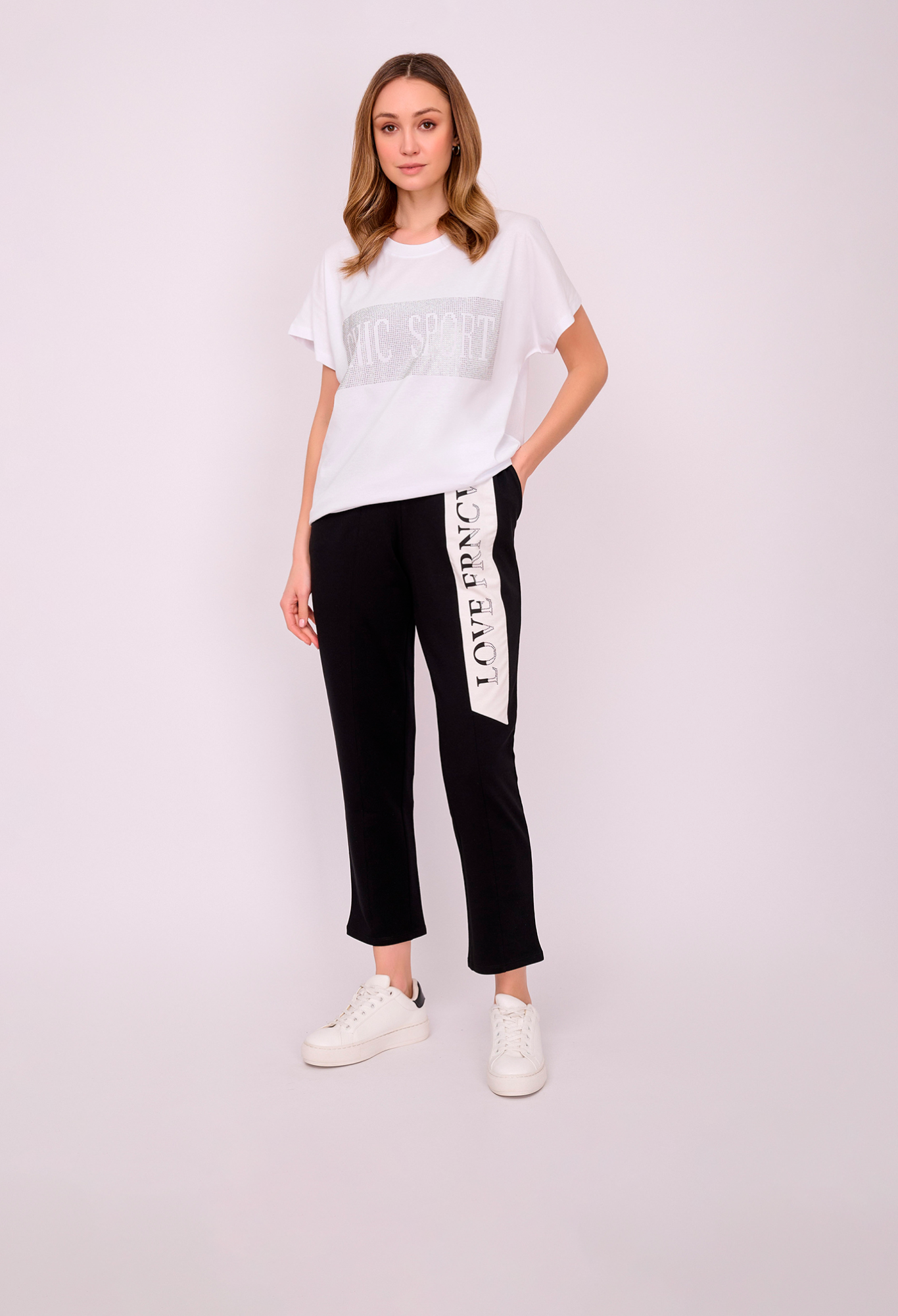 На сайте указаны российские размеры. Трикотажная футболка свободного покроя с короткими цельнокроеными рукавами, украшенная надписью со стразами. Длина по спинке: 63 см. Рост модели 175 см.