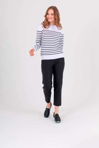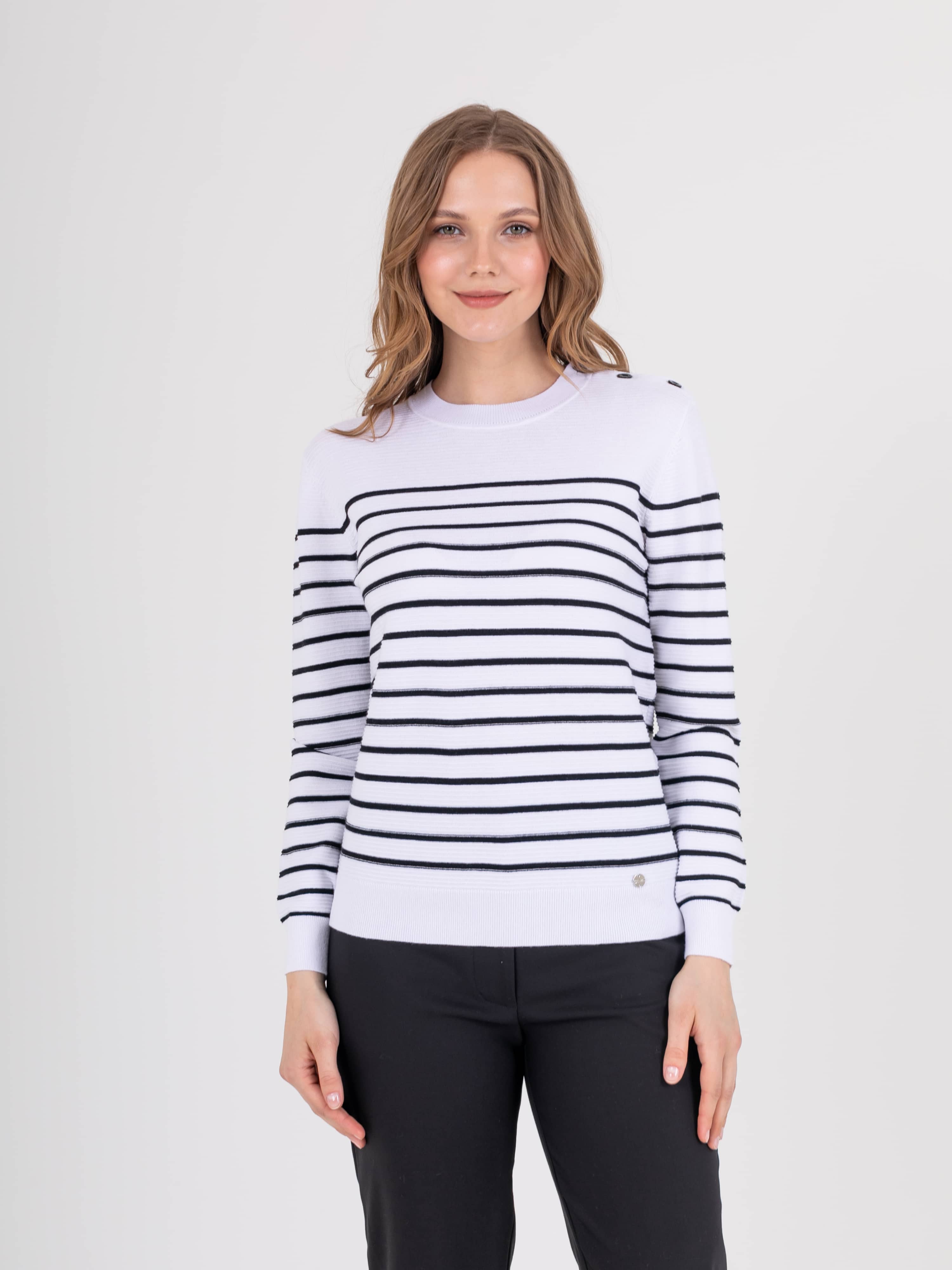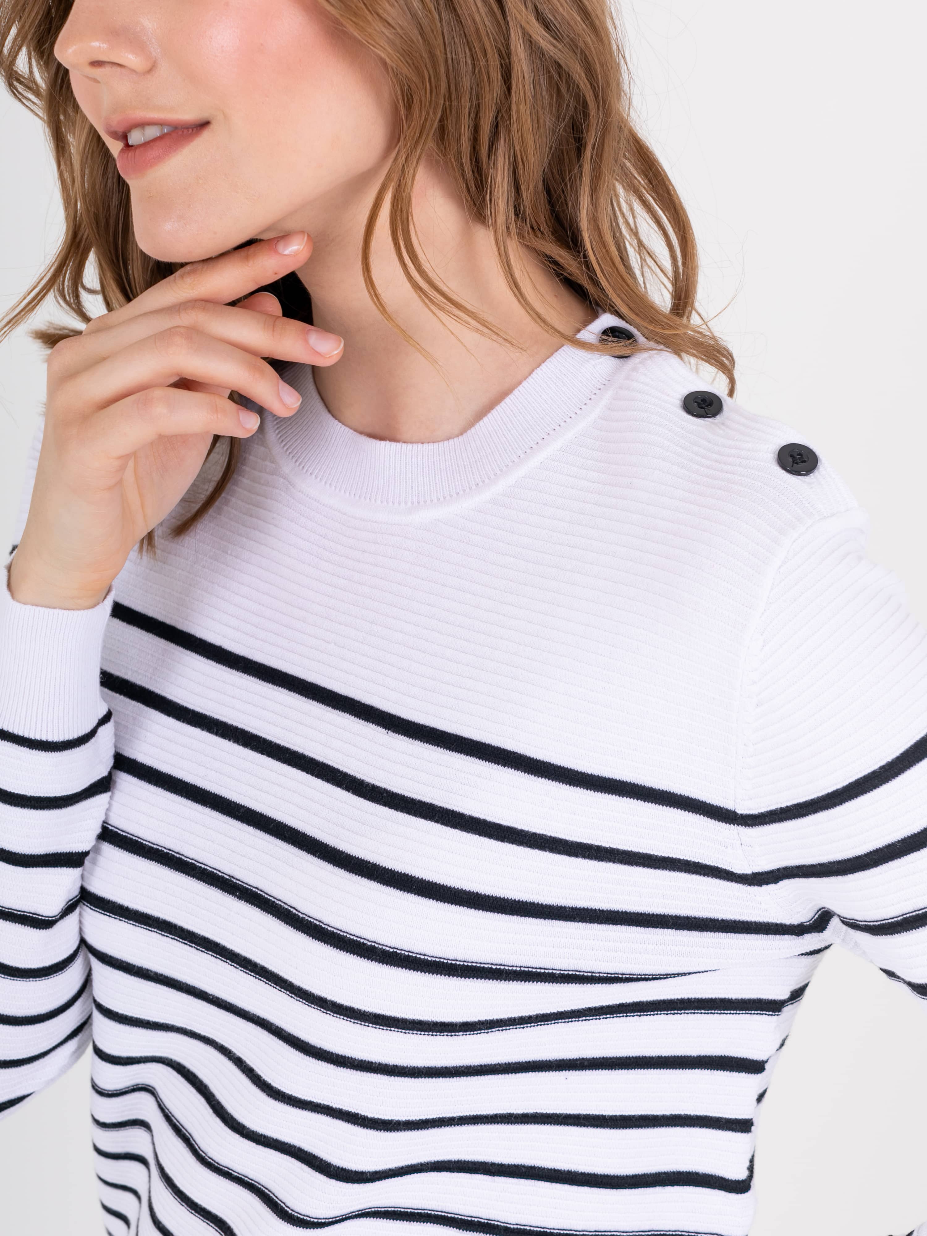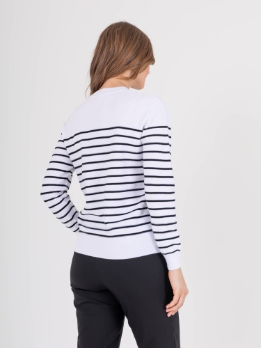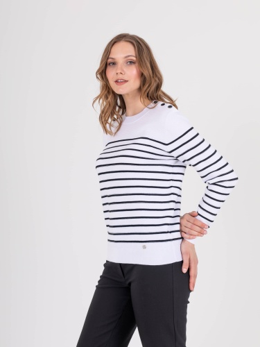 Джемпер средней длины прямого силуэта из легкого хлопка с добавлением акрила, дизайнерская особенность модели – рисунок в полоску. Перед и спинка по низу обработаны манжетой. Длинные втачные рукава с манжетами, на левом плече планка с 3 пуговицами. Круглый вырез горловины.