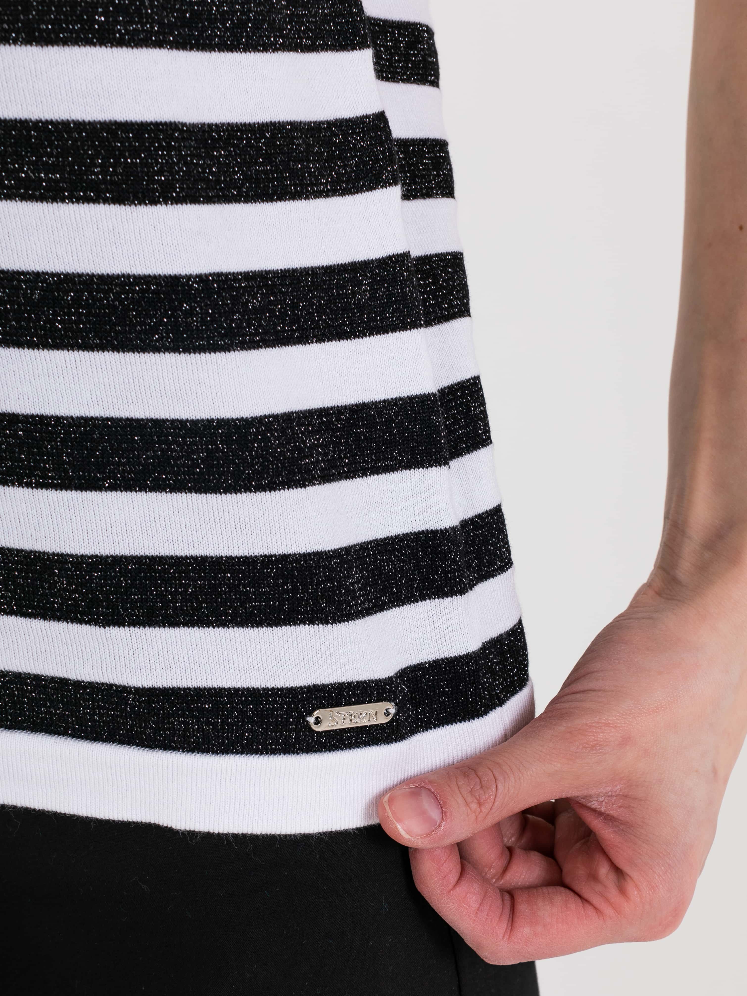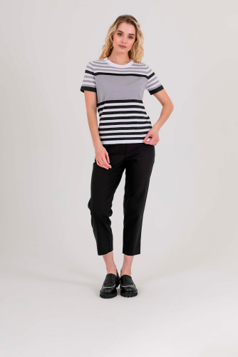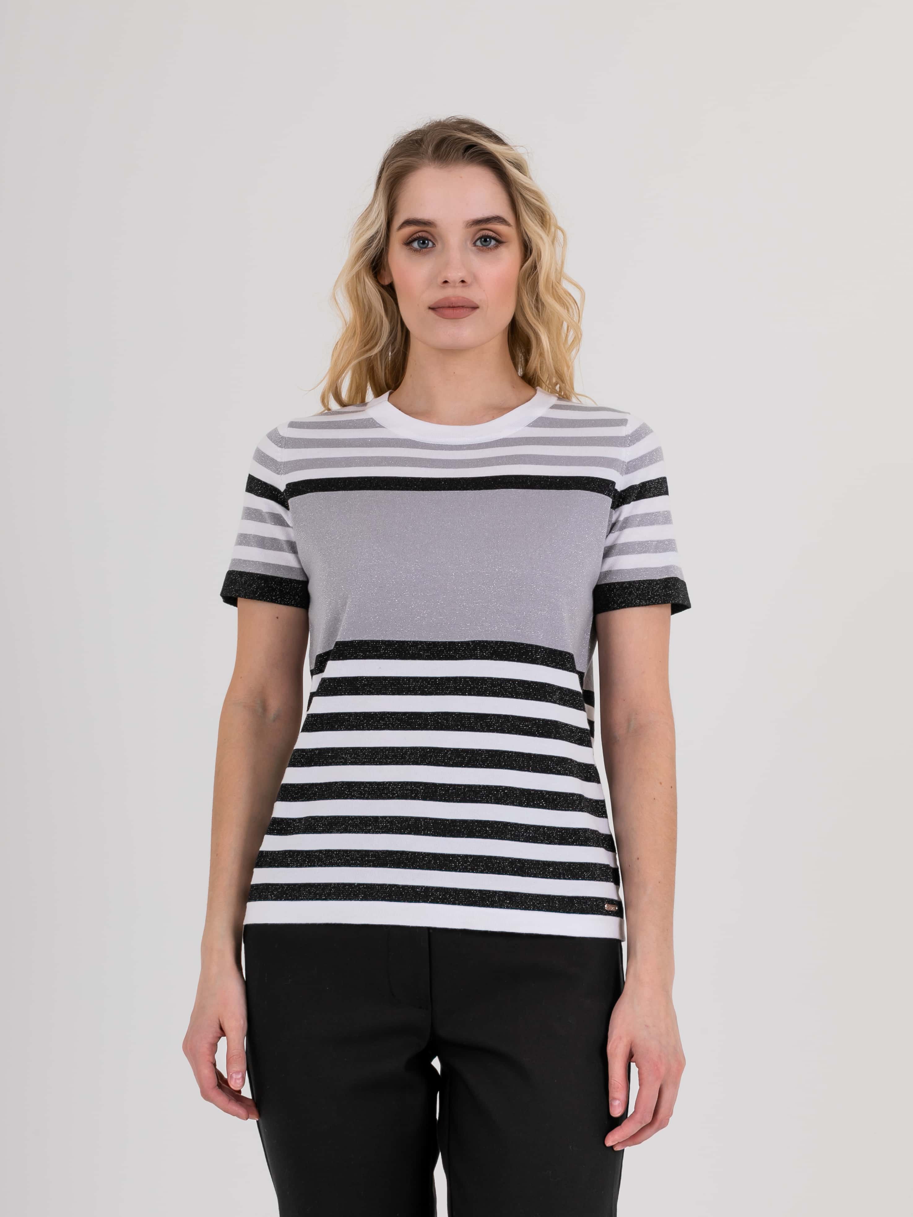 Футболка средней длины прямого силуэта из мягкой вискозы с добавлением легкого хлопка и люрекса, дизайнерская особенность модели – рисунок в полоску. Укороченные втачные рукава. Круглый вырез горловины.