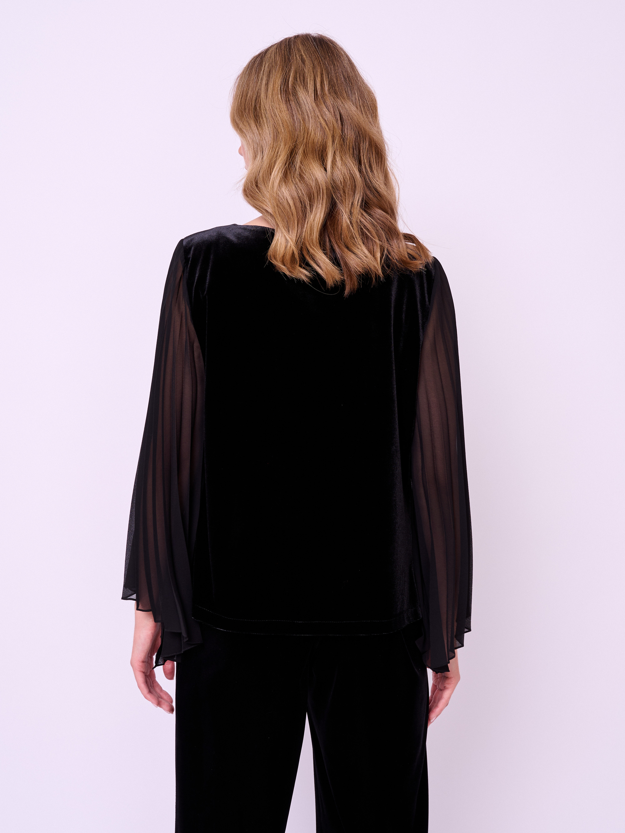 Комбинированная блуза из бархатного трикотажа с плиссированными рукавами асимметричного кроя из шифона, округлой горловиной и боковыми разрезами. Длина по спинке: 56 см.