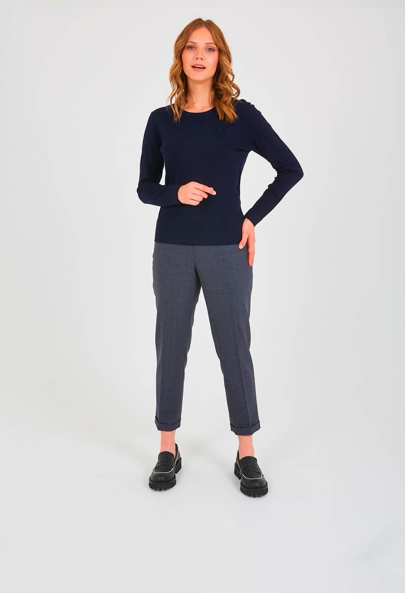 Джемпер средней длины полуприлегающего силуэта из мягкой вискозы с добавлением нейлона, дизайнерская особенность модели – небольшие нашивки по переду и спинке. Перед и спинка по низу обработаны манжетой. Длинные втачные рукава с манжетами. Круглый вырез горловины.