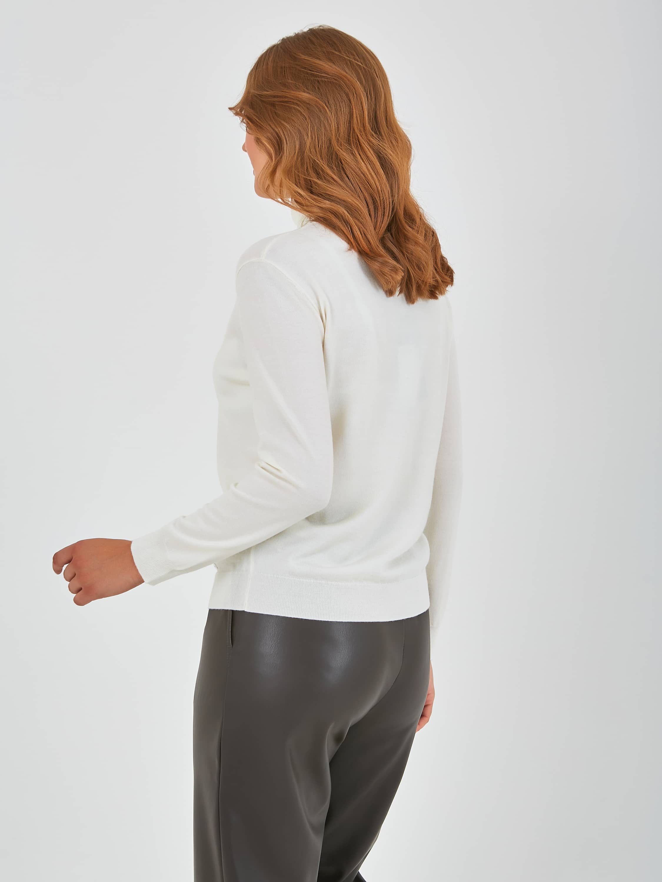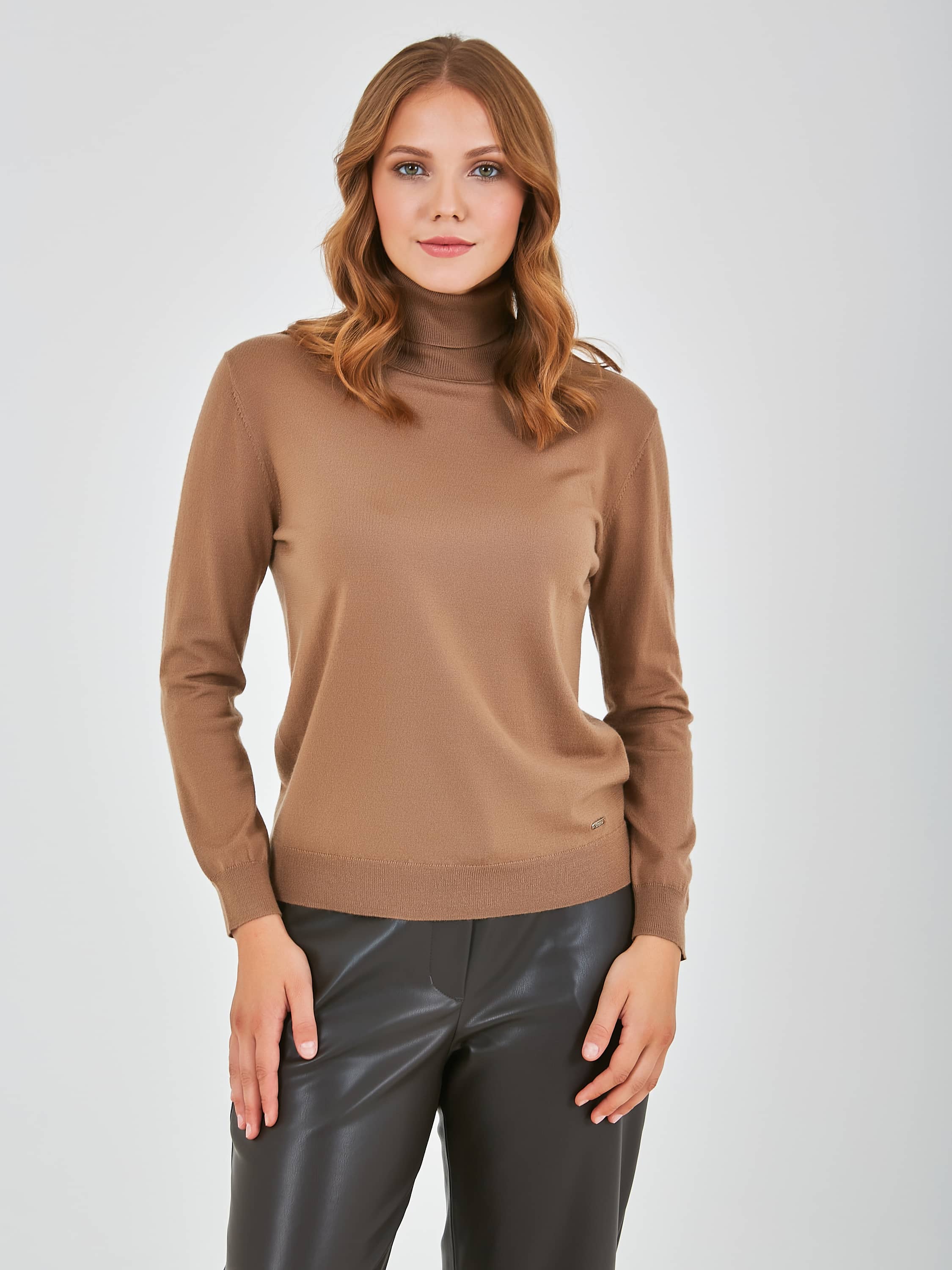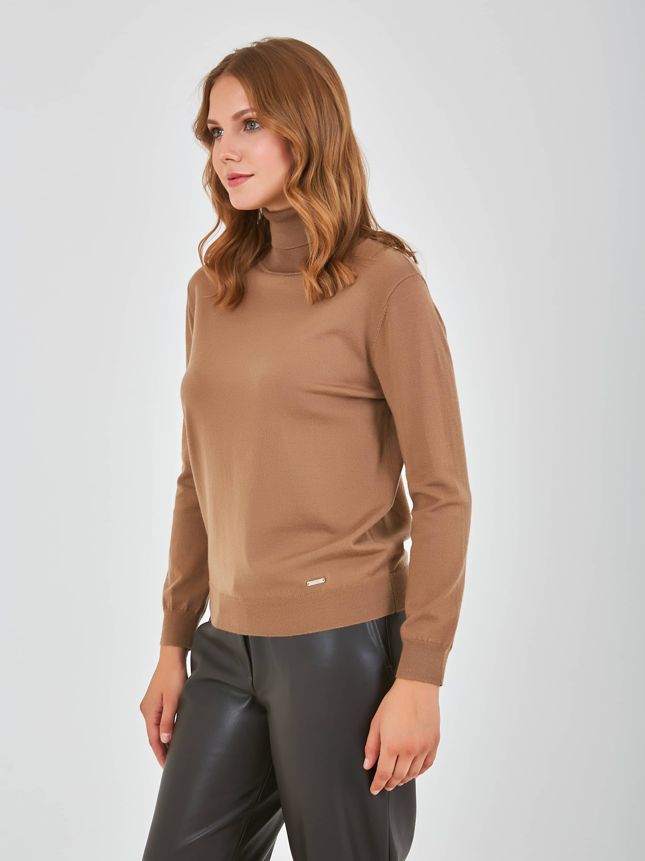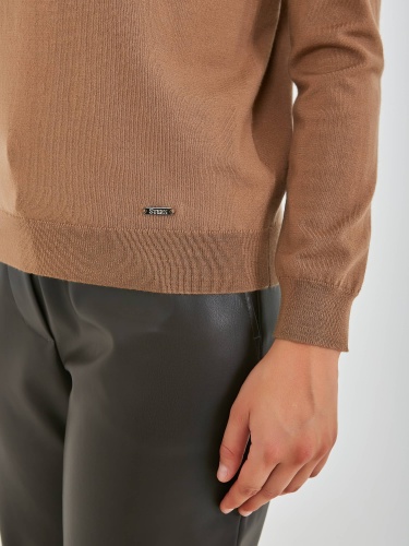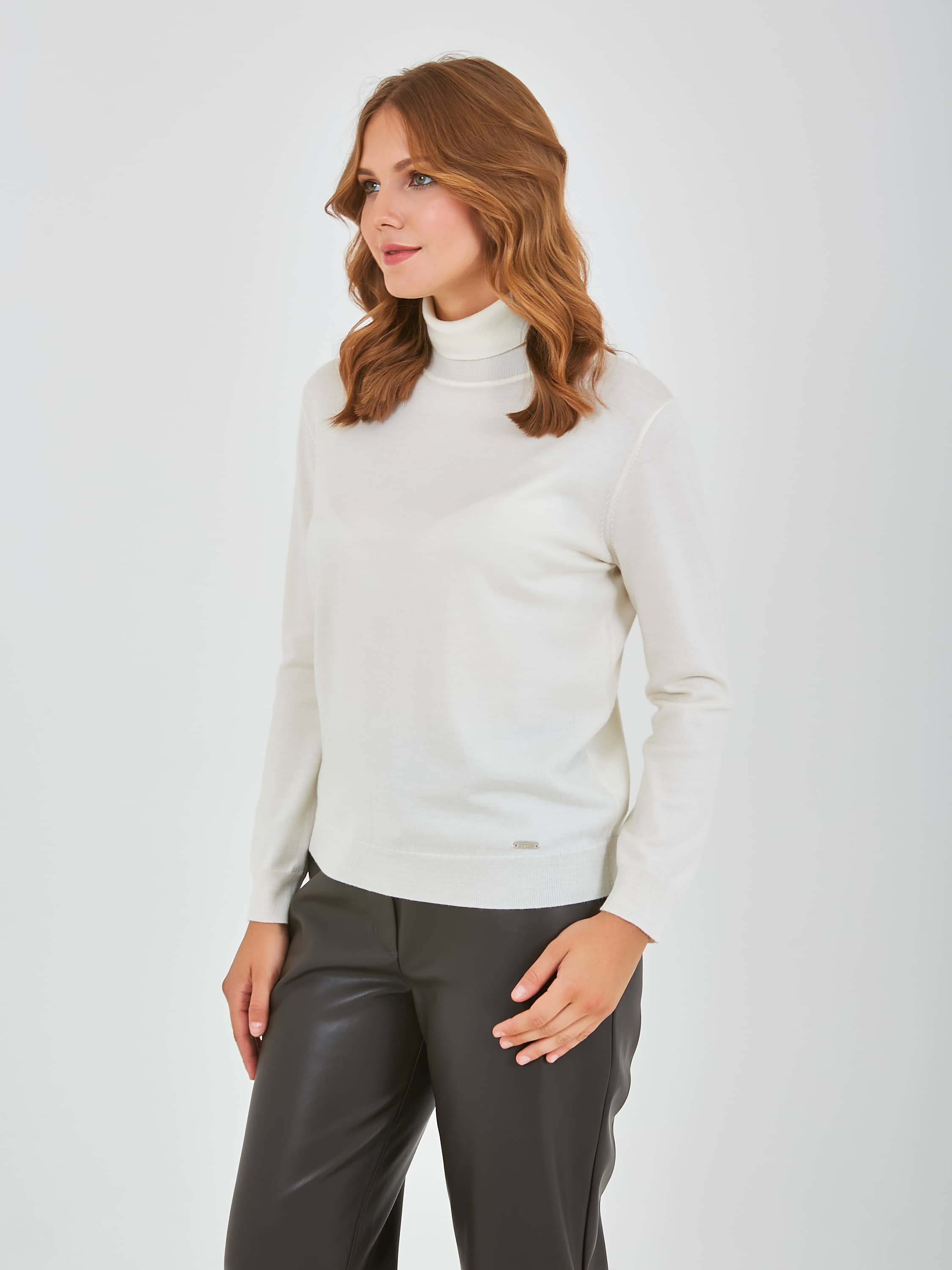 Джемпер средней длины прямого силуэта из акрила с добавлением тенсела и мягкой шерсти. Перед и спинка по низу обработаны манжетой. Длинные втачные рукава с манжетами. Воротник «гольф».