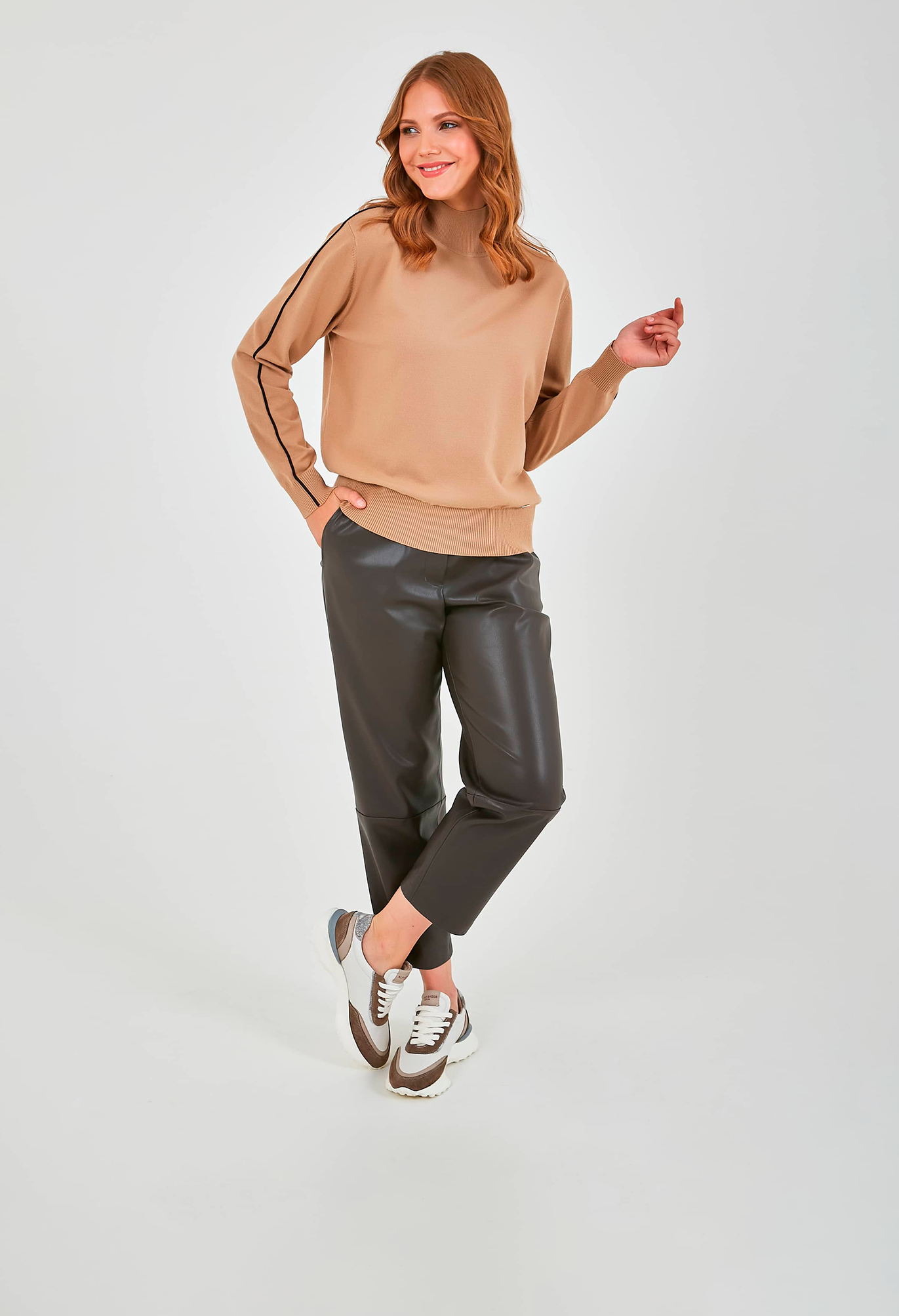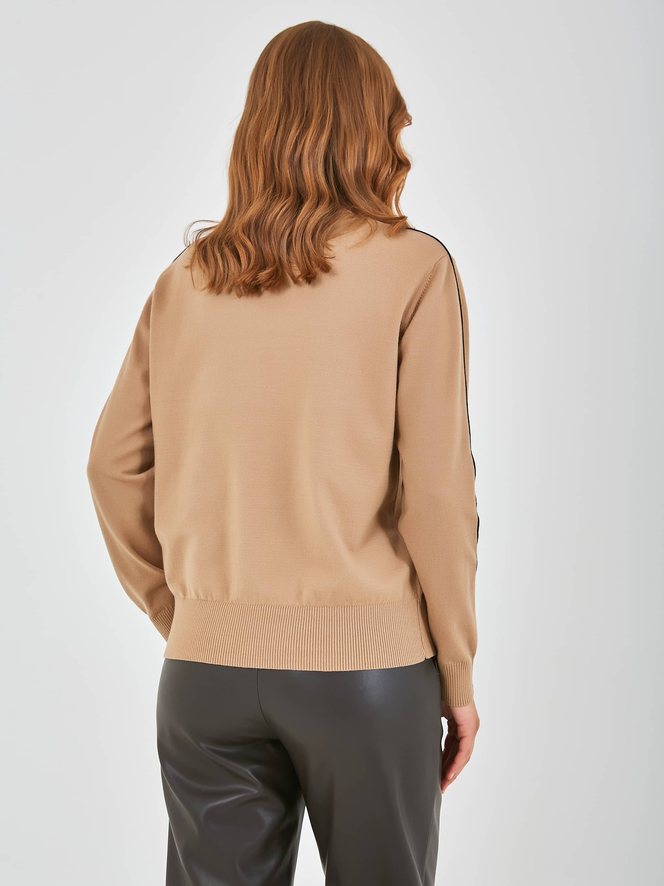 Джемпер средней длины прямого силуэта из легкого хлопка с добавлением вискозы, акрила и полиэстера, дизайнерская особенность модели - контрастный кант по всей длине рукава. Перед и спинка по низу обработаны манжетой. Длинные втачные рукава с манжетами. Воротник «хомут».
