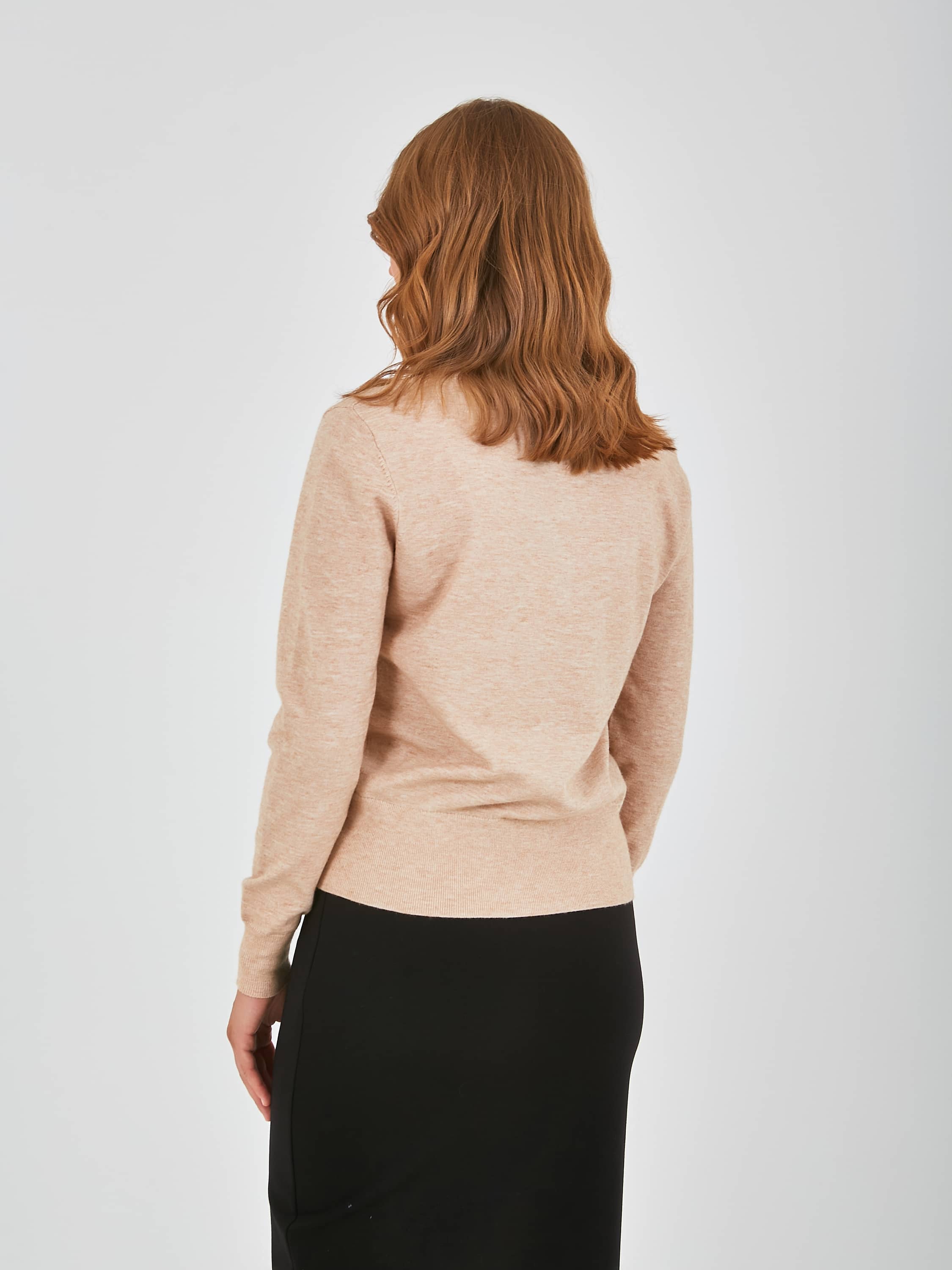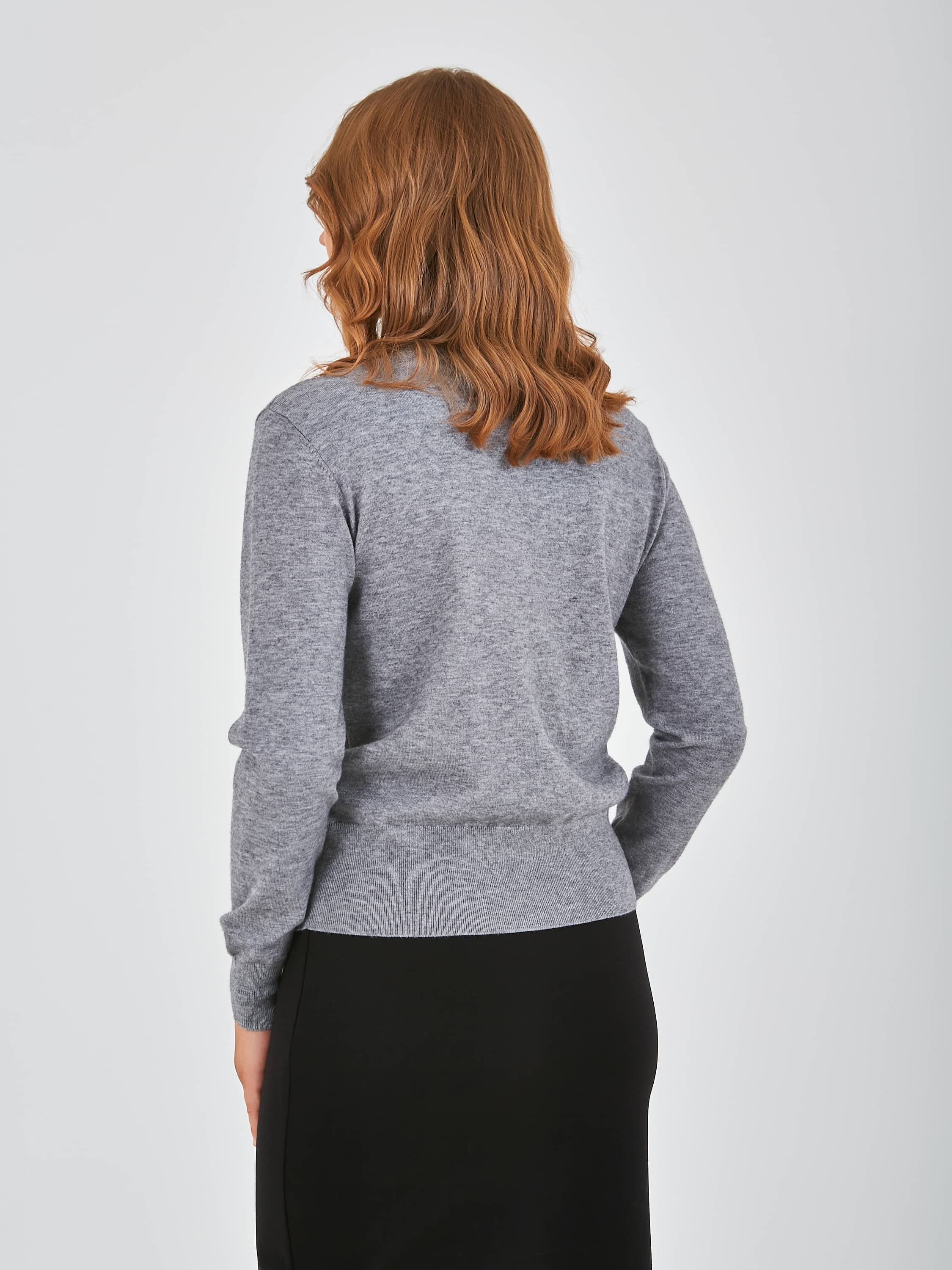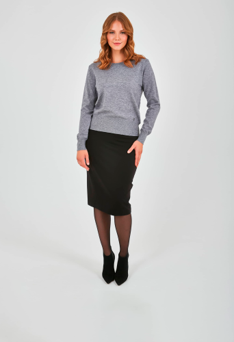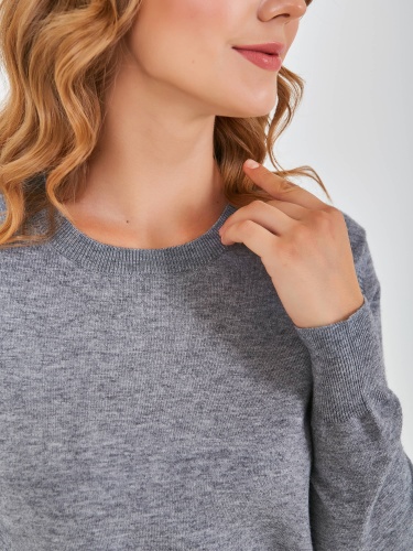 Джемпер средней длины прямого силуэта из мягкой вискозы с добавлением полиэстера и нейлона. Перед и спинка по низу обработаны манжетой. Длинные втачные рукава с манжетами. Круглый вырез горловины.