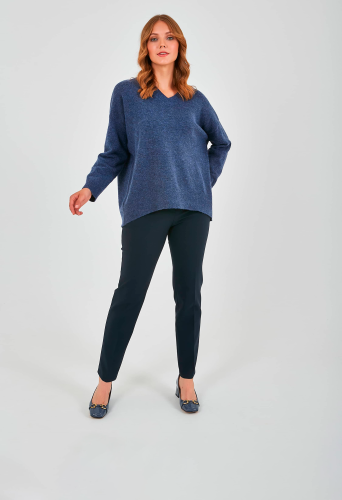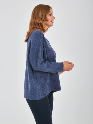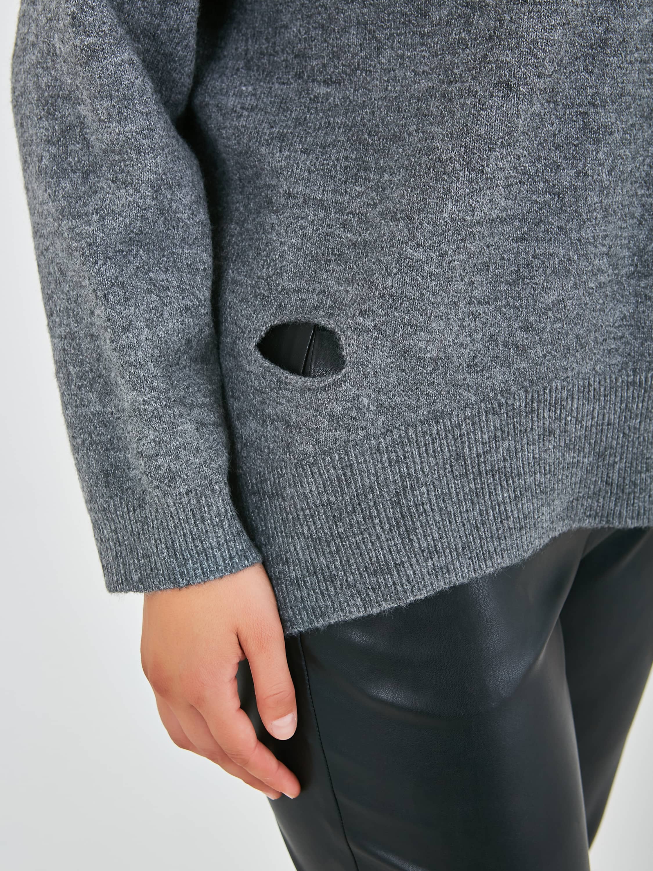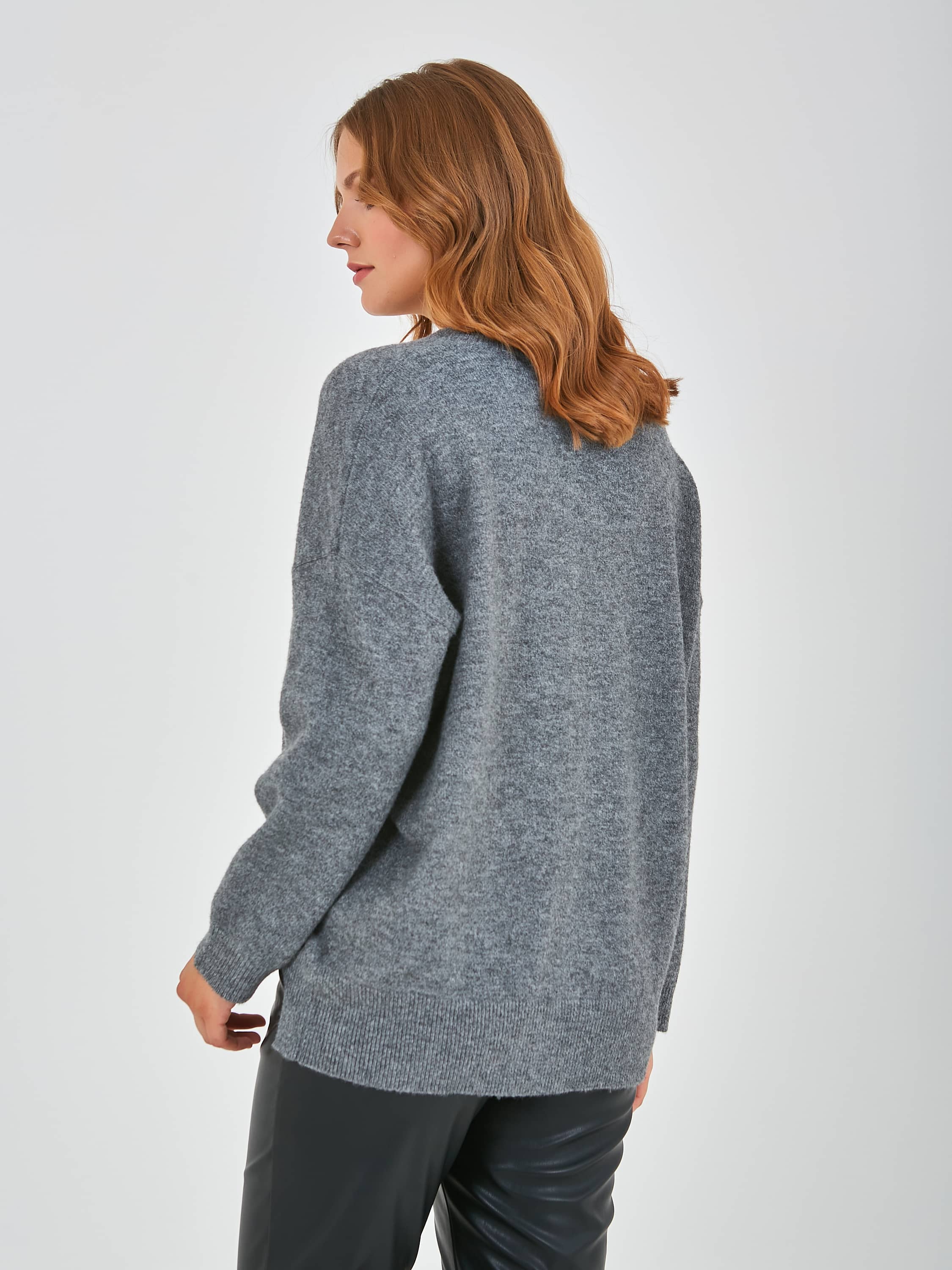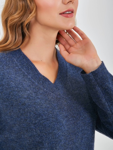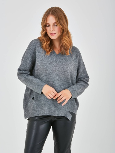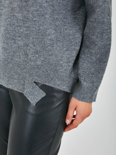 Джемпер средней длины прямого оверсайз силуэта из полиэстера, акрила, с добавлением мягкой шерсти с добавлением нейлона и акрила, дизайнерская особенность модели - эффект "драной" одежды. Перед и спинка по низу обработаны манжетой. Длинные втачные рукава со спущенной линией плеча и манжетами. V-образный вырез горловины.