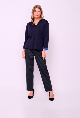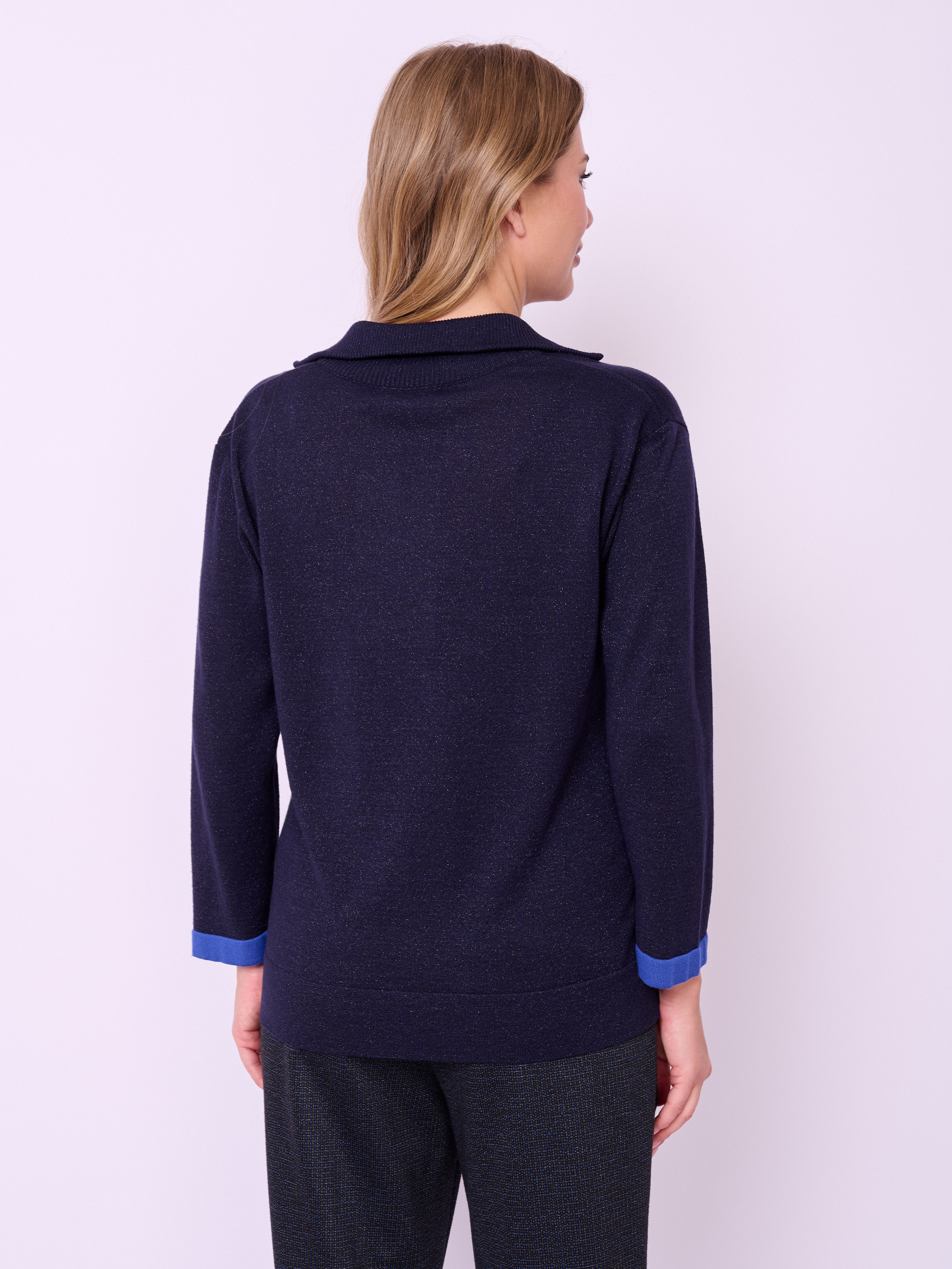 Трикотажный джемпер прямого покроя из вискозной пряжи с добавлением люрекса с отложным воротником и боковыми разрезами. Длина по спинке: 60 см.
