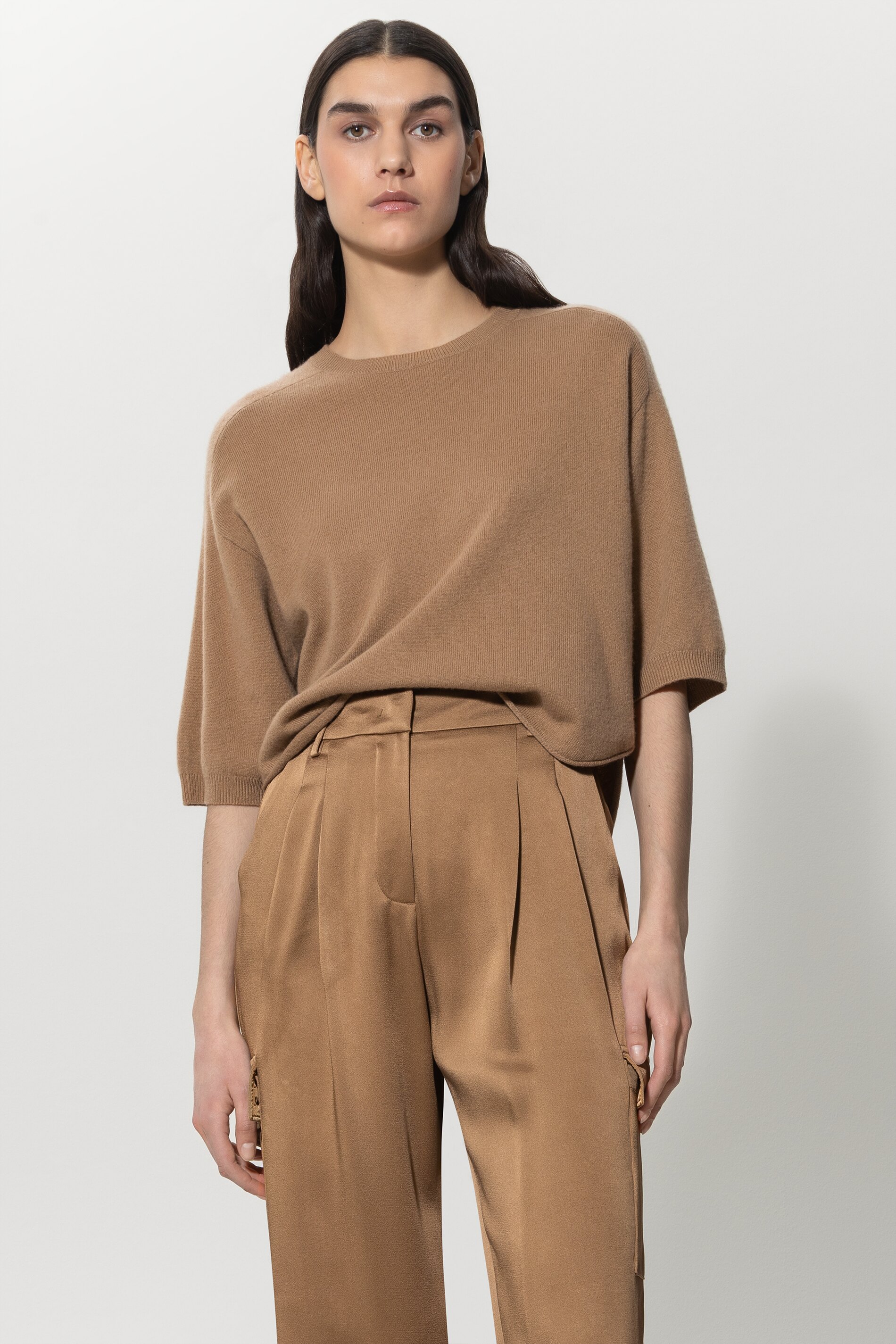 Трикотажный джемпер с рукавами средней длины из роскошного смесового кашемира. Изысканный дизайн швов и закругленный низ придают этому джемперу элегантный и эффектный вид.