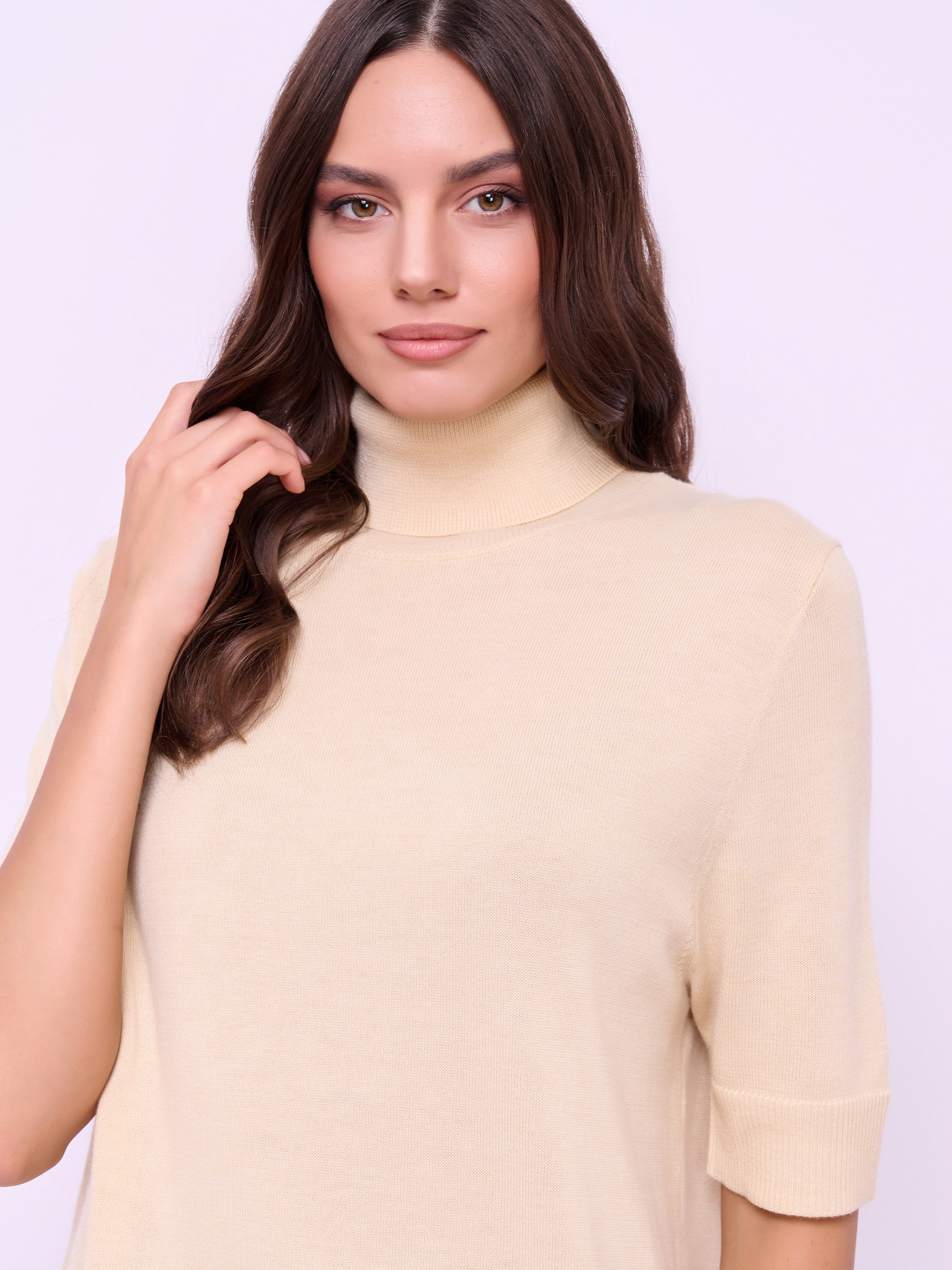 Детали: мягкая пряжа, вырез горловины воронка, рукава 1/2, покрой прямой, без рисунка. Длина по спинке: 67 см.