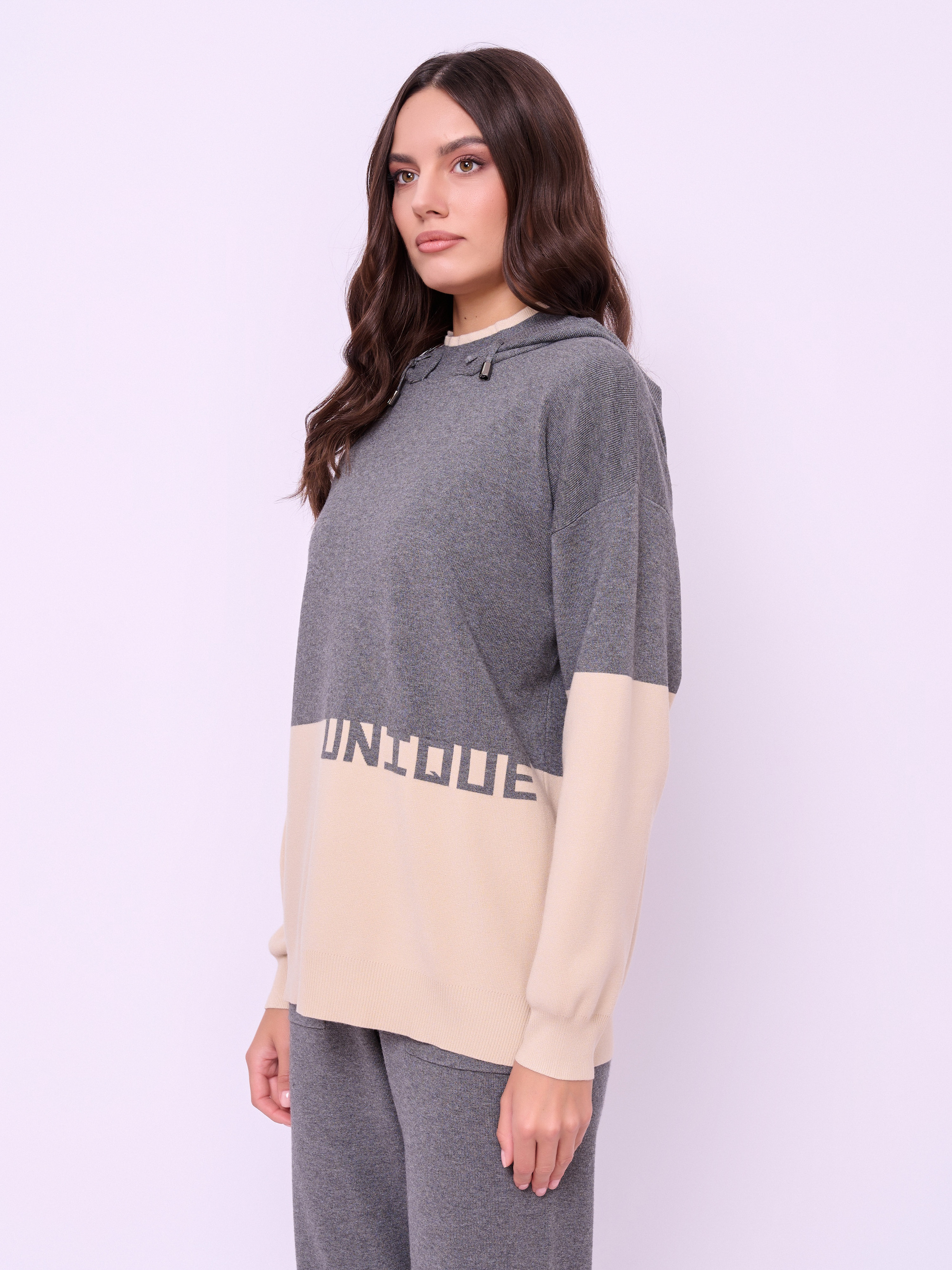 Детали: вырез горловины воротник-капюшон на кулиске, рукава длинные, покрой прямой, рисунок цветные блоки, с надписью, боковые разрезы. Длина по спинке: 66 см.