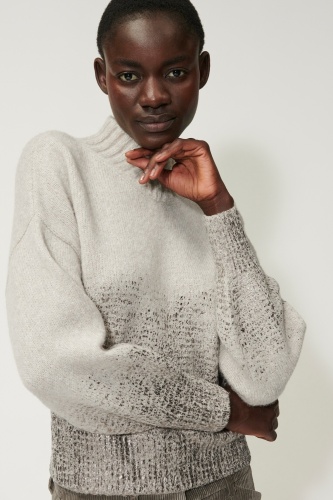 Легкий вязаный пуловер из высококачественной итальянской смесовой шерсти с эффектом меланжа и стильным принтом из металлизированной фольги. Пуловер имеет свободный крой, короткий воротник в рубчик и небольшой V-образный вырез.