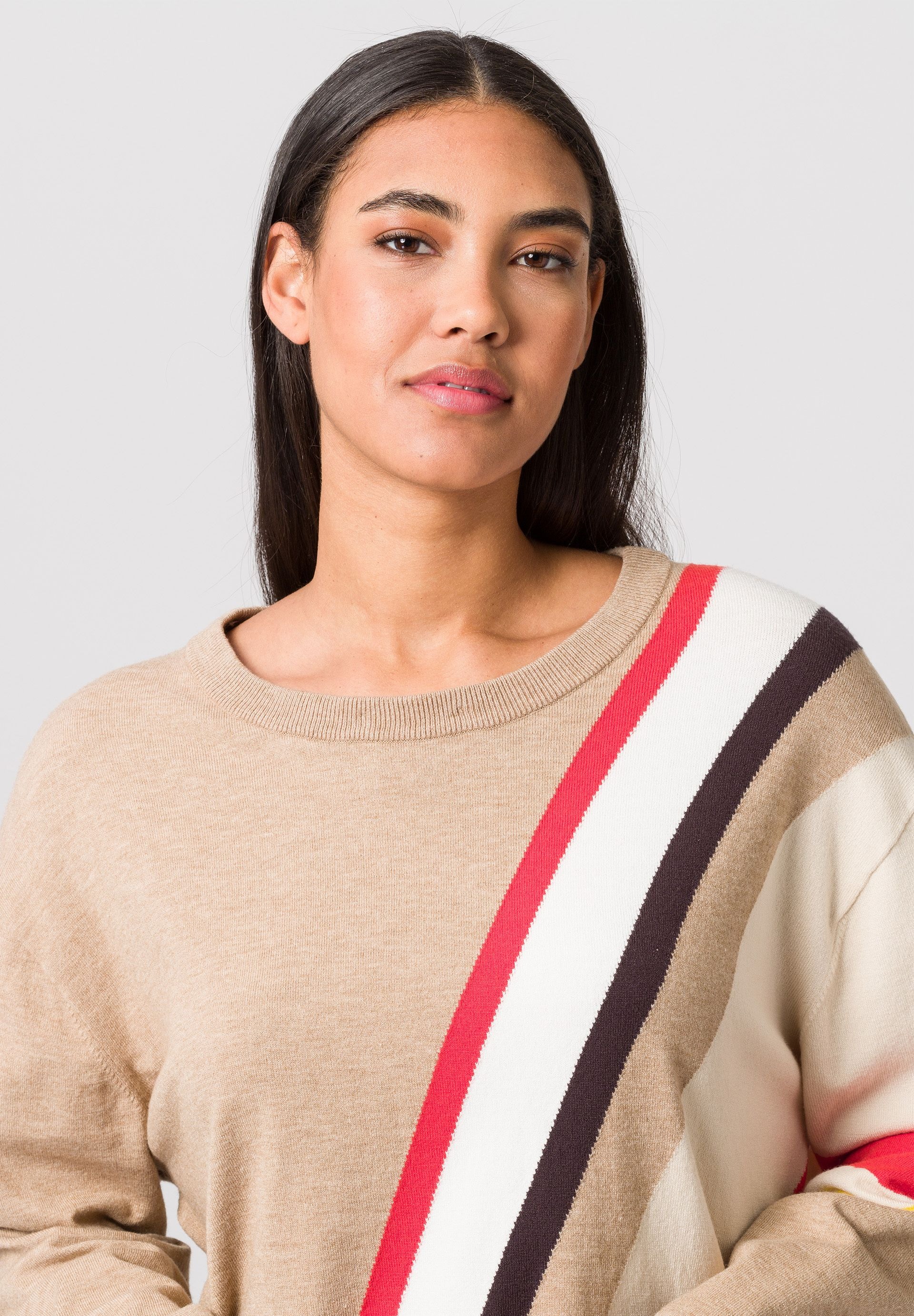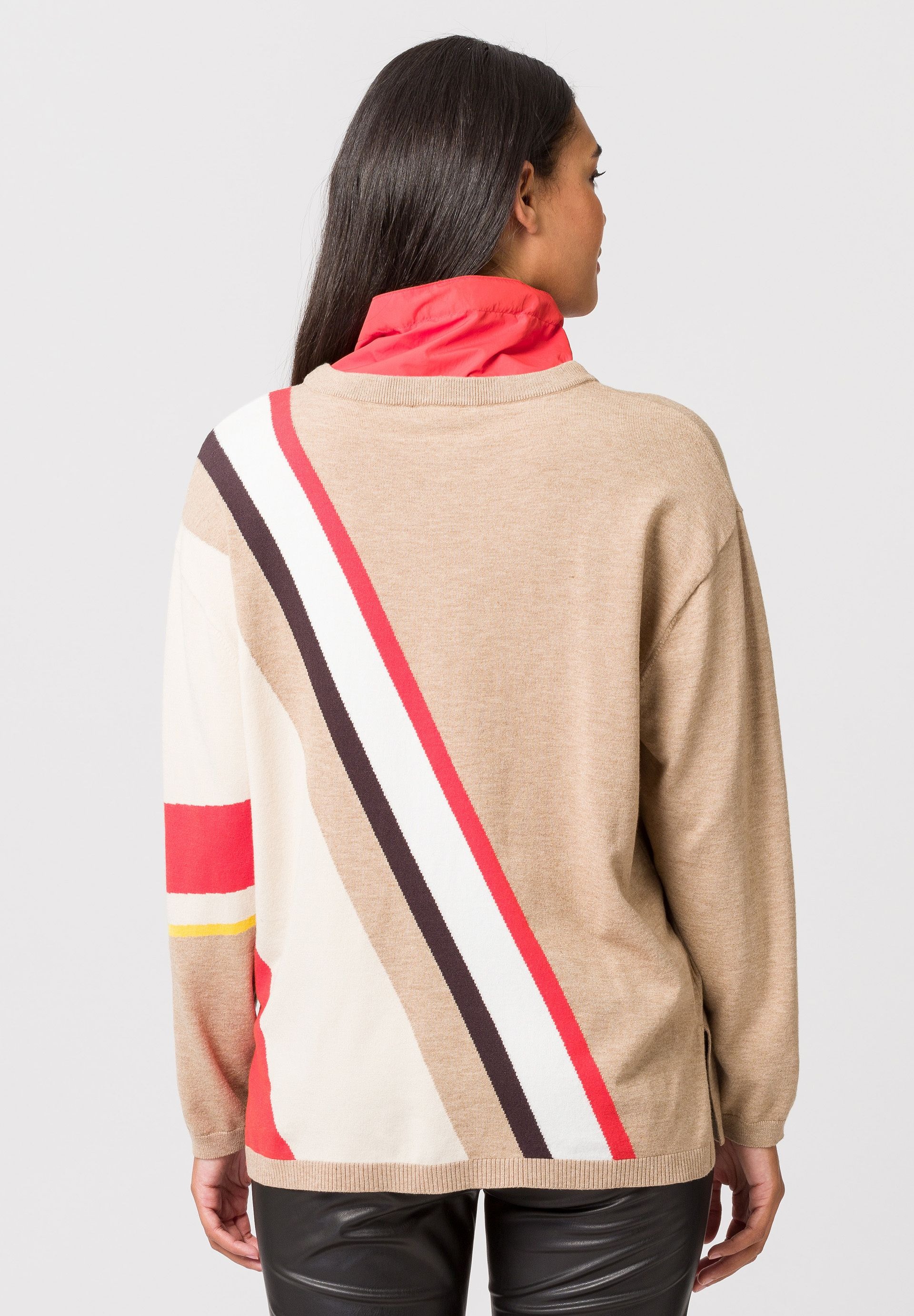 Вязаный женский свитер с вырезом в многослойном виде. Облегающий фигуру свитер из легкой, тонкой вязки с высоким содержанием вискозы. Сплошной узор в гармоничной цветовой гамме определенно заслуживает внимания. Воротник-стойка контрастного цвета с застежкой-молнией и атласными лентами с принтом создает эффектный многослойный образ. Вязаный свитер – это модно и необычно.