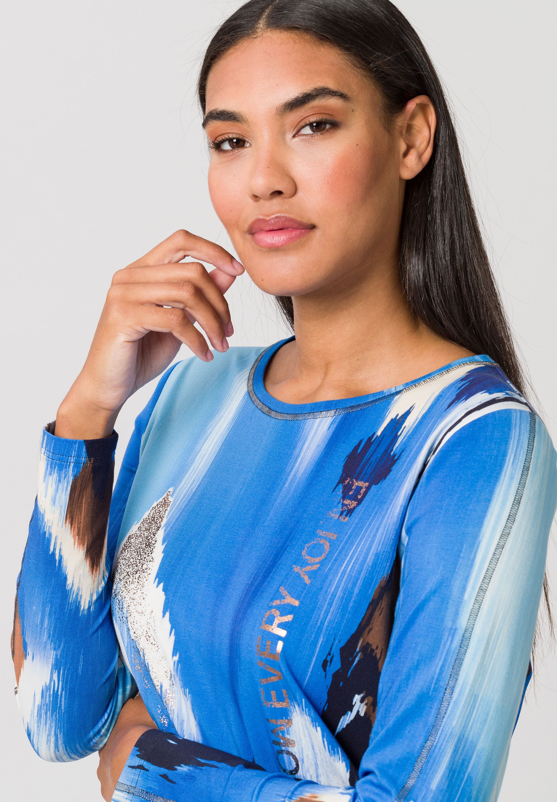 Базовый джемпер с рисунком. Освежающий эффект принта по всей поверхности и металлических деталей покоряет модные сердца и делает эту базовую модель с круглым вырезом незаменимой вещью для спортивного и шикарного повседневного гардероба.