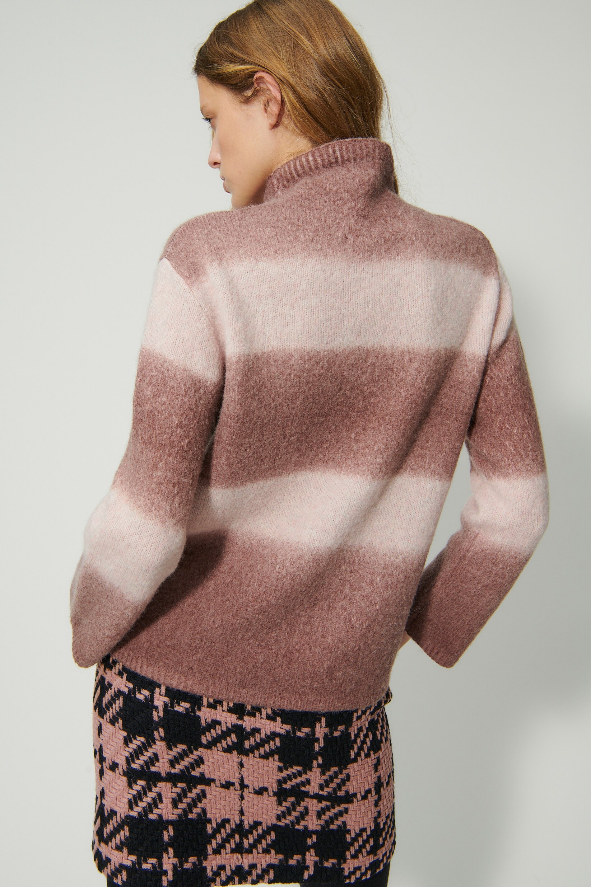 Вязаный пуловер с имитацией водолазки и полосатым узором. Высококачественная итальянская смесь шерсти с меланжевым эффектом подчеркивает приятный характер этого пуловера.