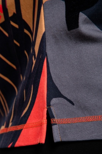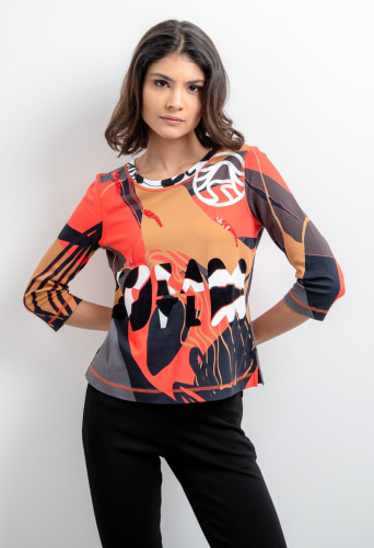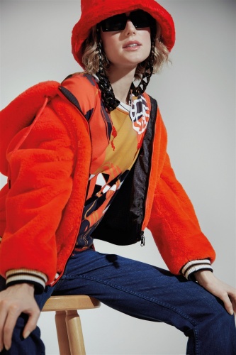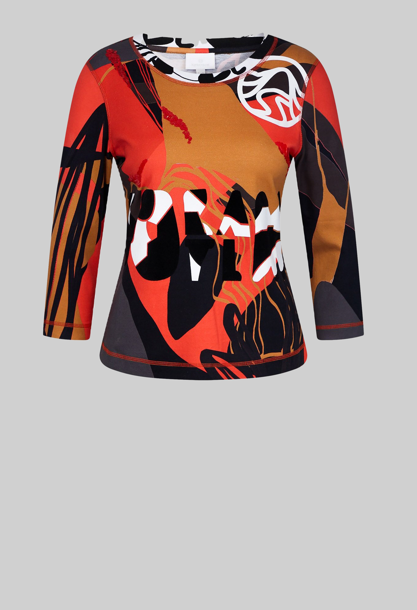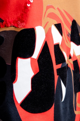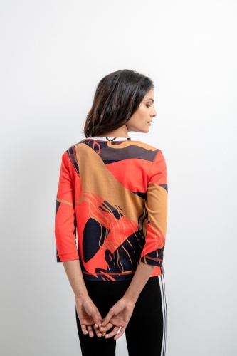 Джемпер с принтом по всей поверхности свободного кроя. Круглый вырез дополнен ребристой манжетой с принтом. Также имеется модная надпись Sportalm спереди, а левое плечо украшено логотипом Sportalm, выполненным из сочетания глянцевого и флока. Контрастные декоративные швы придают джемперу спортивный вид. В боковом шве имеются небольшие разрезы.