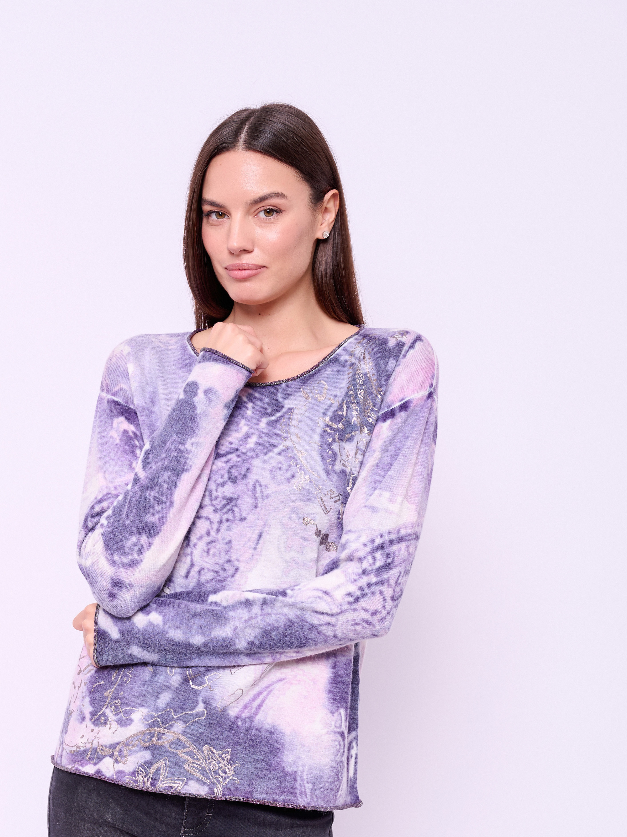Детали: вырез горловины округлый, рукава длинные, покрой прямой, рисунок абстракция, серебристый принт. Длина по спинке: 58 см.