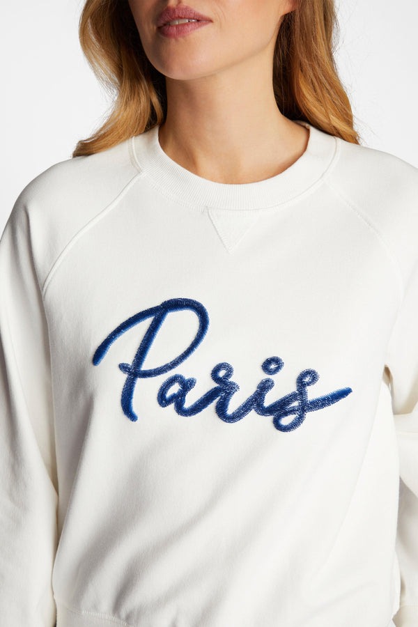 Толстовка изготовлена из удобного органического хлопка и имеет ребристый пояс с рюшами и аппликацию «Париж». Широкий силуэт дополнен рукавами реглан. Длина для размера 42: 54 см. Окружность груди для размера 42: 102 см.
