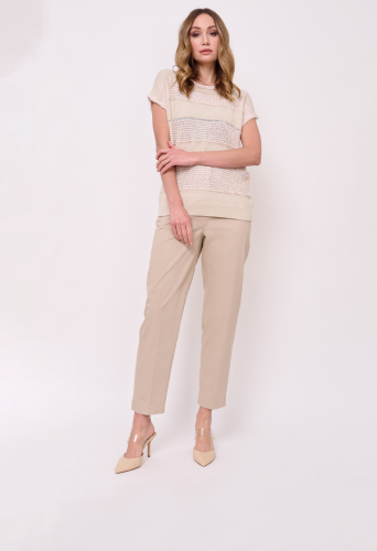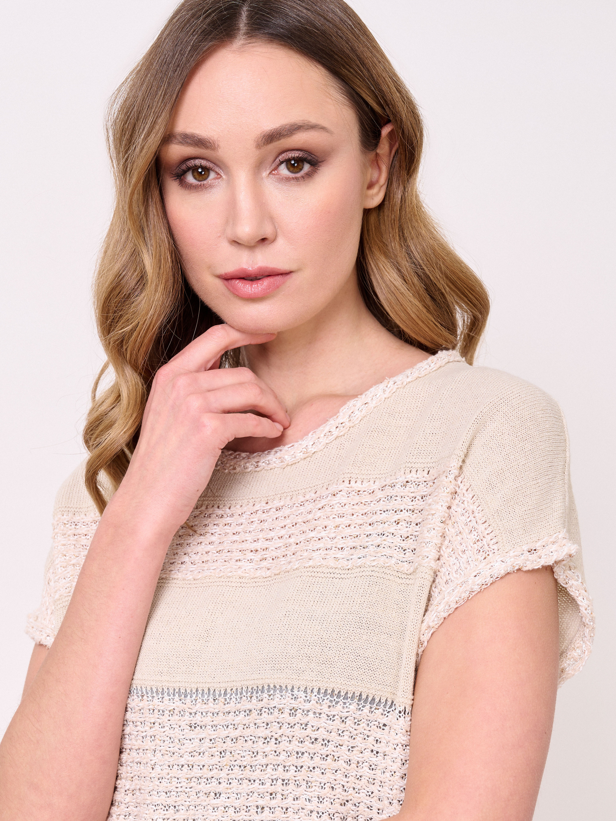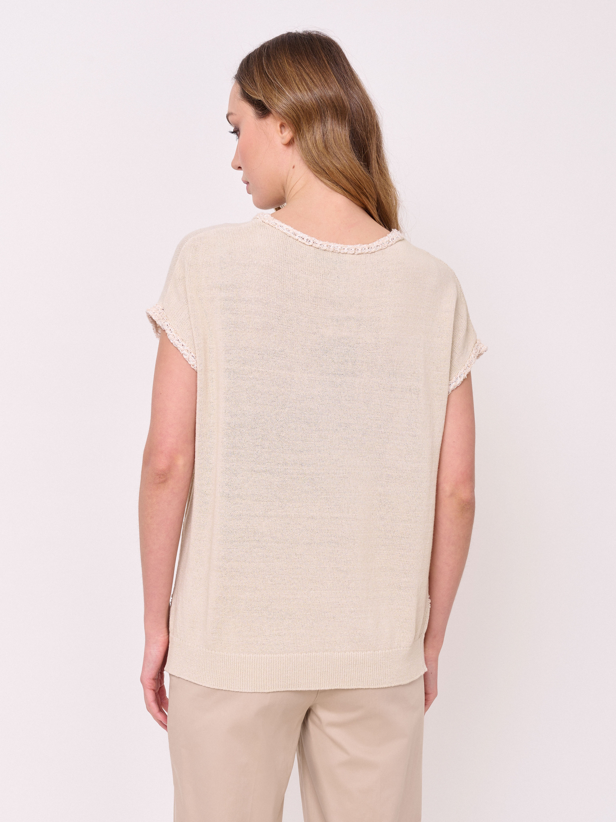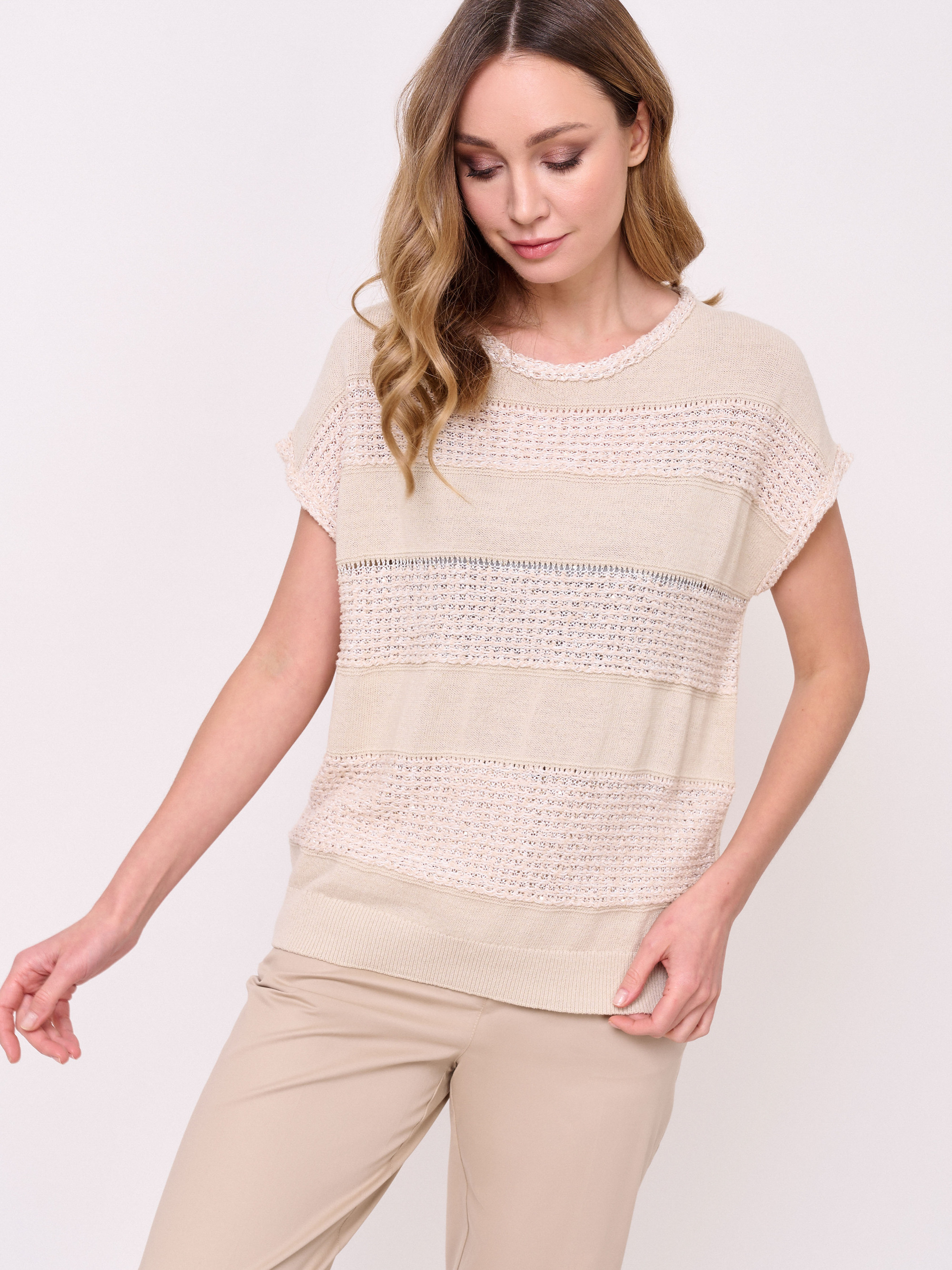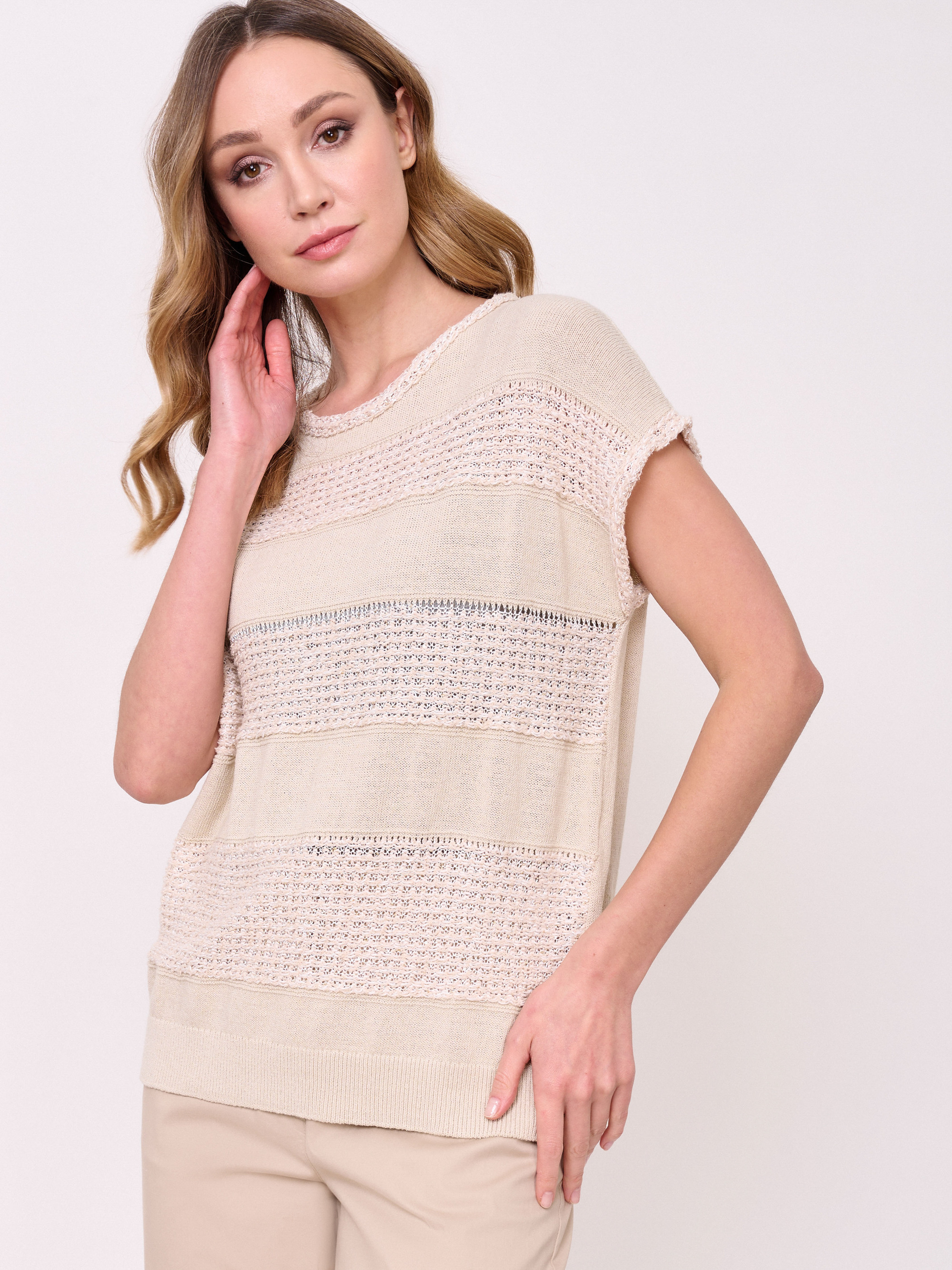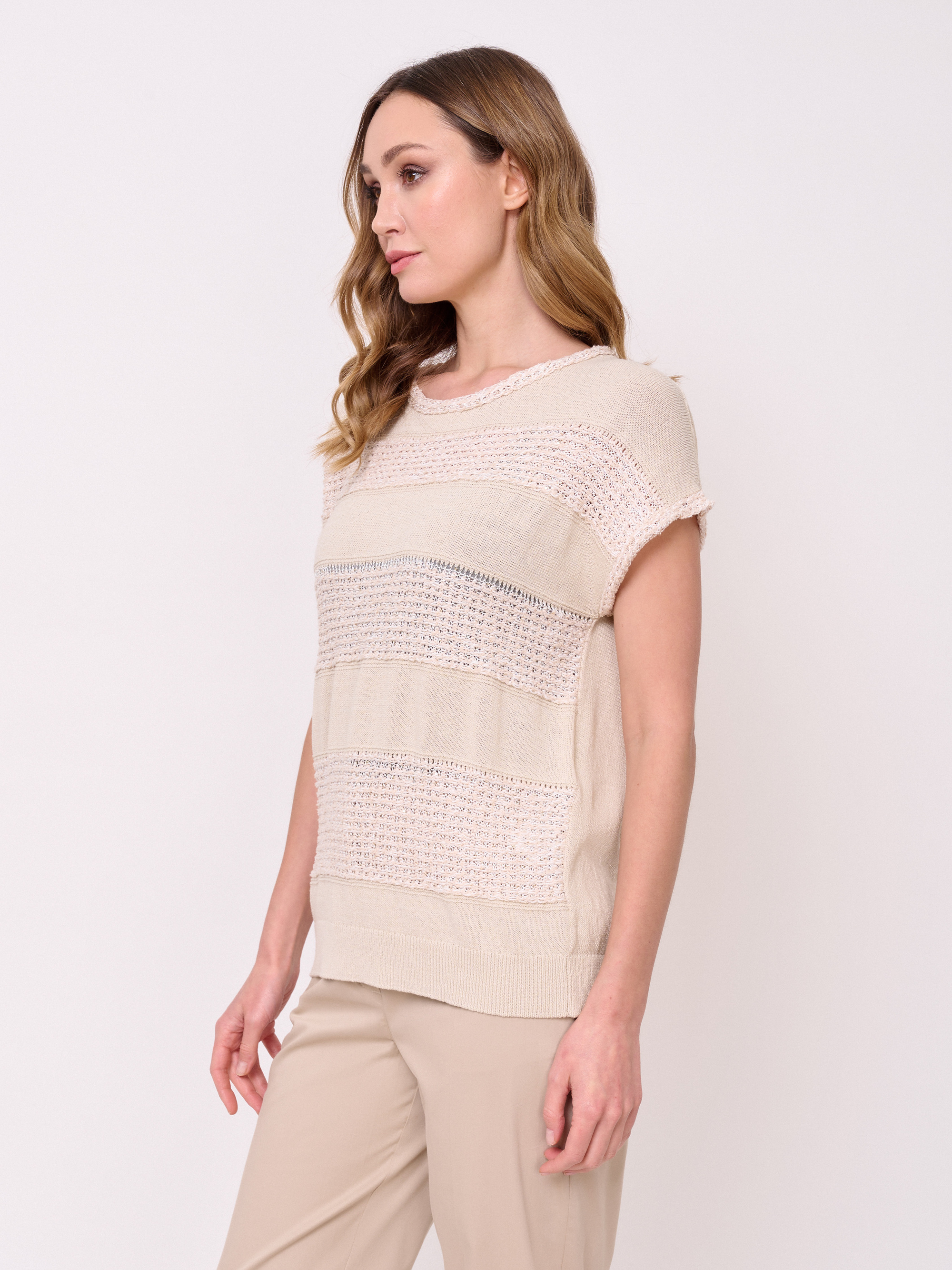 Хлопок и лен, вырез горловины округлый, рукава короткие спущенные, покрой прямой, рисунок фактурный, с добавлением люрекса. Длина по спинке: 58 см.