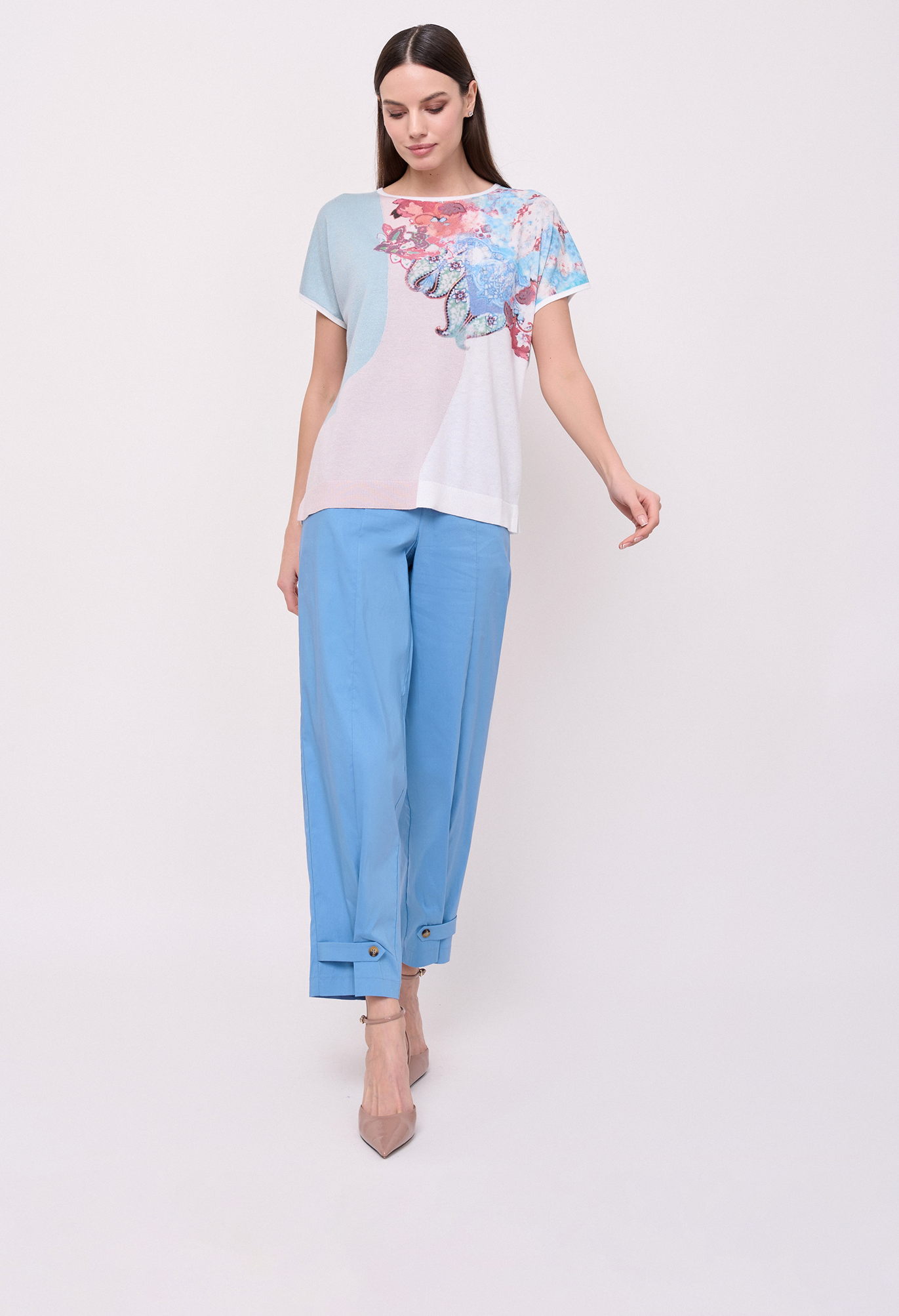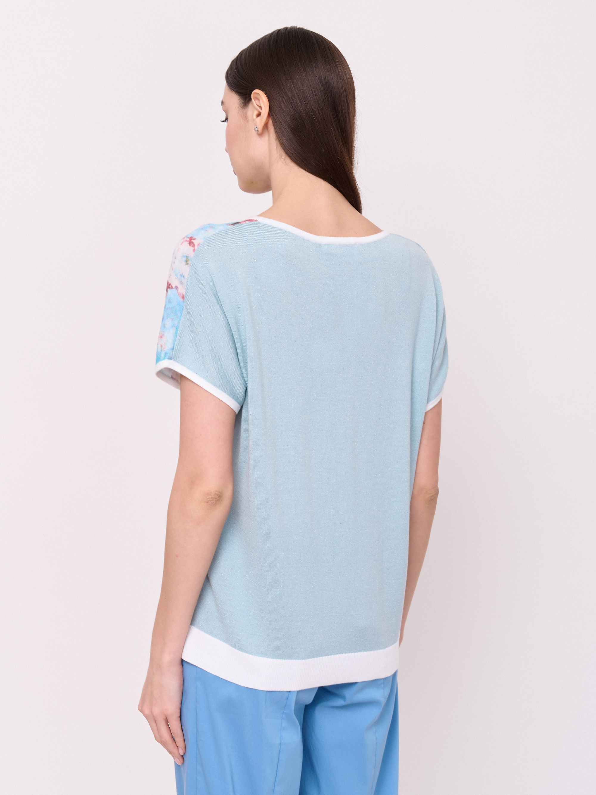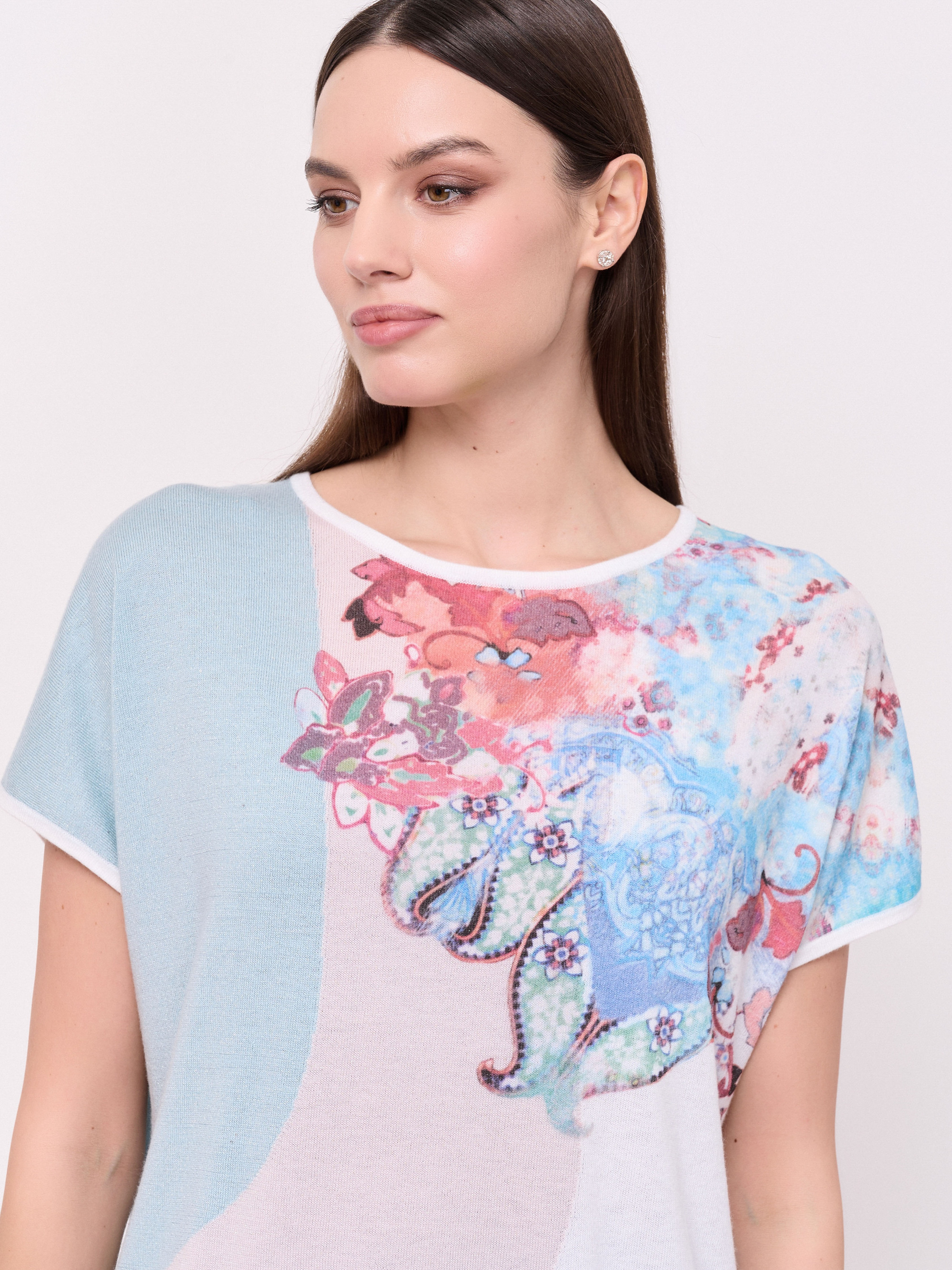 Детали: вырез горловины округлый, рукава короткие, покрой прямой, рисунок пэйсли, боковые разрезы, пайетки. Длина по спинке: 60 см.