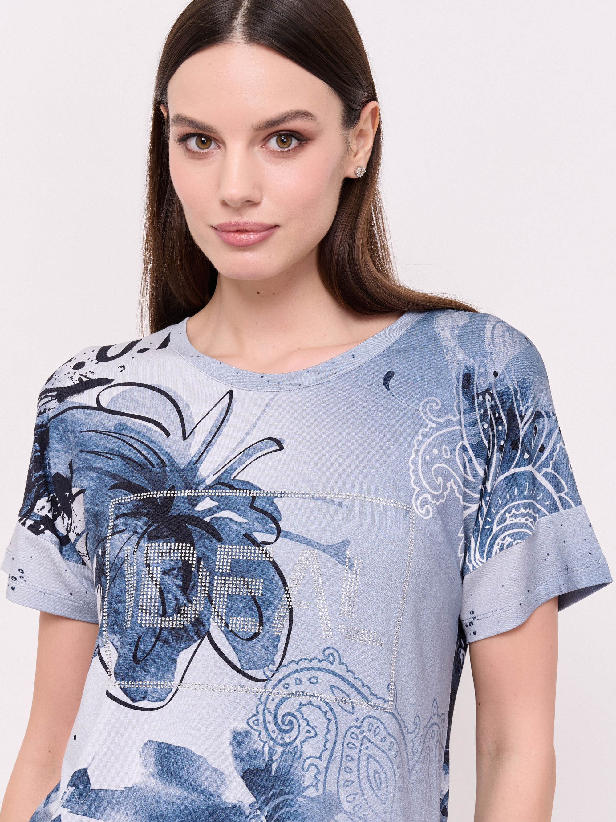 Детали: вырез горловины округлый, рукава короткие, покрой прямой, рисунок цветы и растения, стразы, боковые разрезы. Длина по спинке: 60 см.