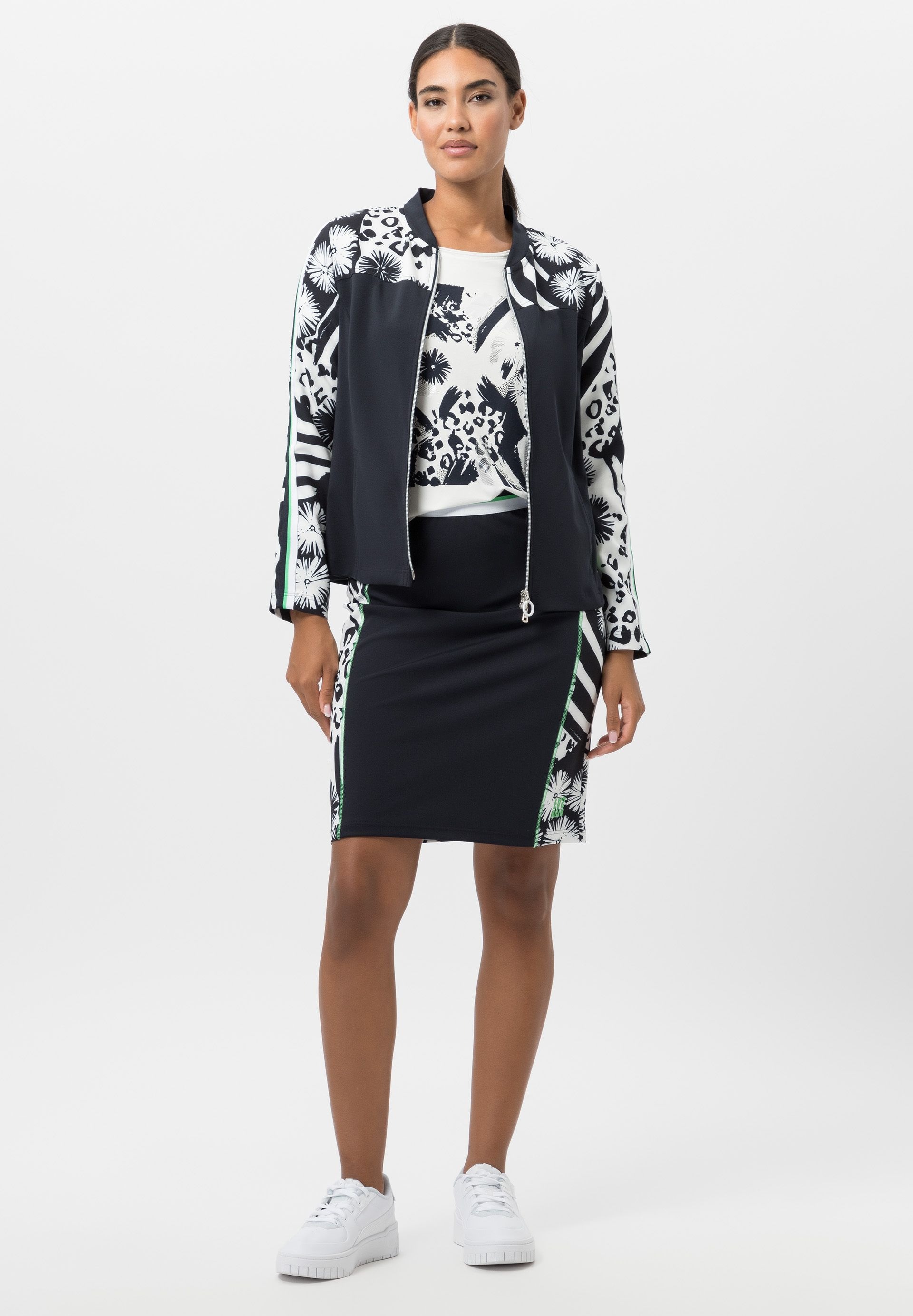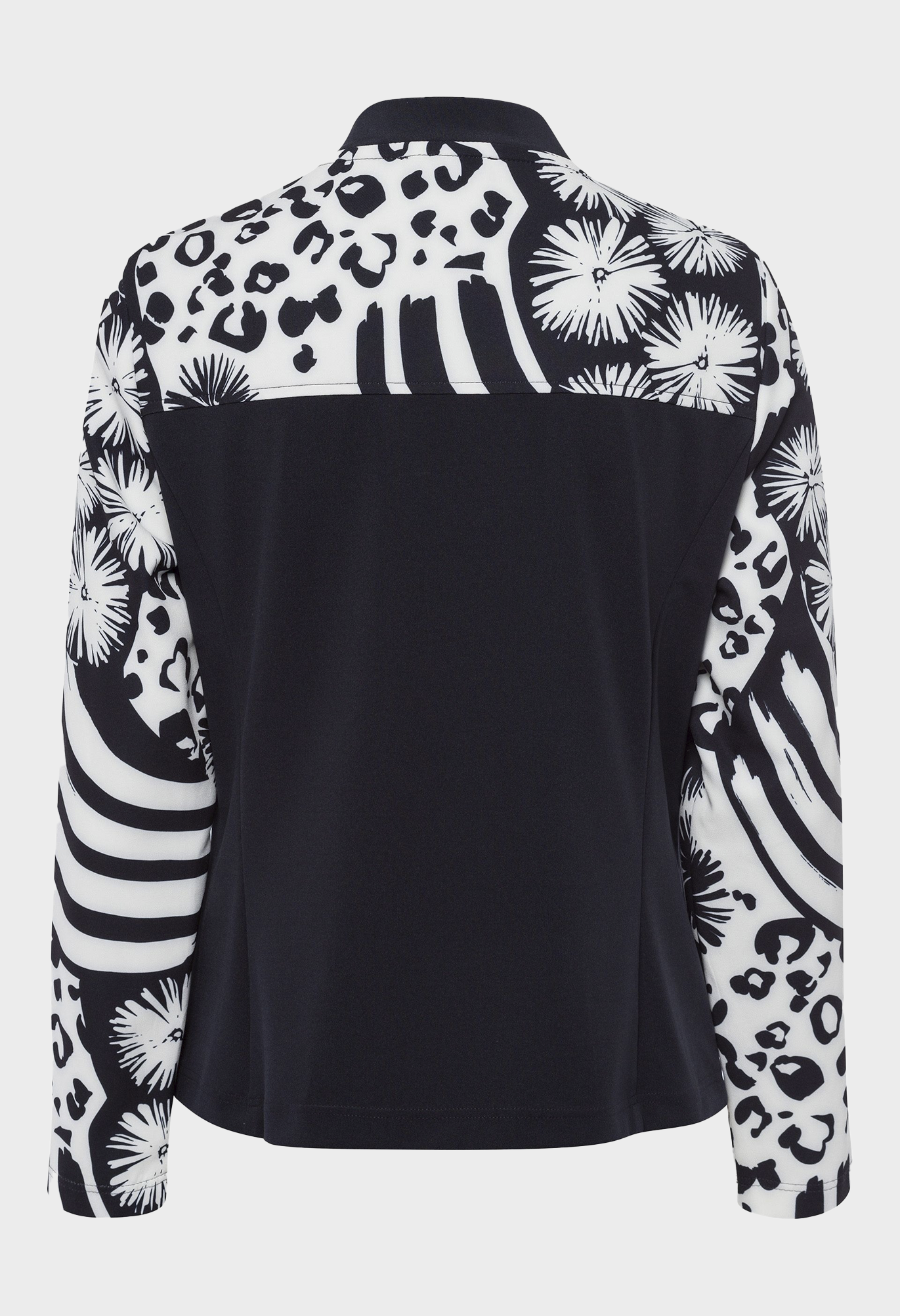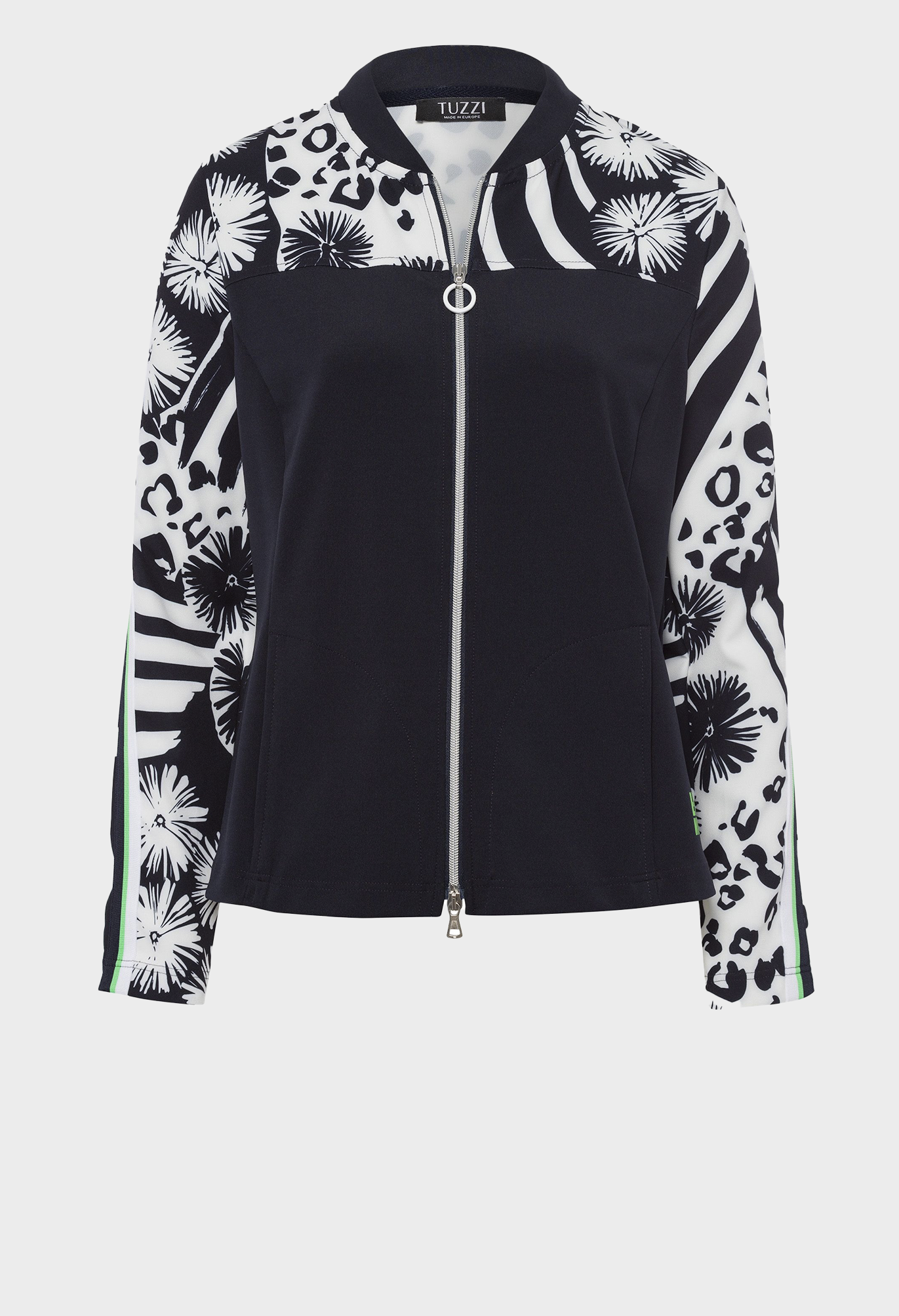 Легкая женская куртка с цветочным узором. С окончанием холодного сезона наступает весна, множество новых тенденций. Такая легкая куртка с модным рисунком определенно одна из них. Эффектный принт подчеркнут однотонными вставками и контрастными полосками на рукавах. Прямой крой и эластичная ткань обеспечивают свободу движений. Благодаря двусторонней молнии и боковым карманам куртка не только стильная, но и практичная. Длина в 42 размере - 58 см.