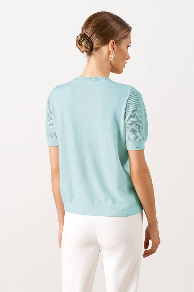 Вязаный джемпер свободного силуэта. Округлый вырез горловины. Рукава и верх джемпера с ажурным плетением в стиле «Кроше». Горловина, рукава и низ джемпера на вывязанной резинке.