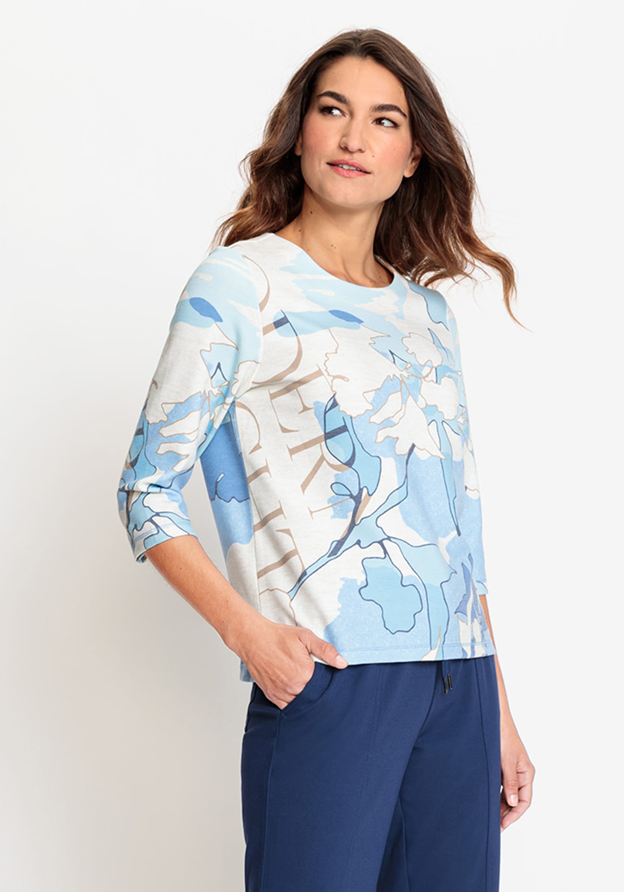 Супермягкий джемпер сочетает в себе абстрактный принт в спокойных оттенках синего с элементами дизайна нейтрального типографского принта. Имеет круглый вырез горловины и разрезы по бокам внизу. Модель Henny имеет прямой крой и слегка прилегает к телу.