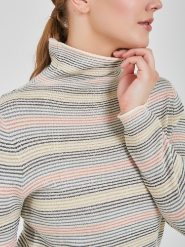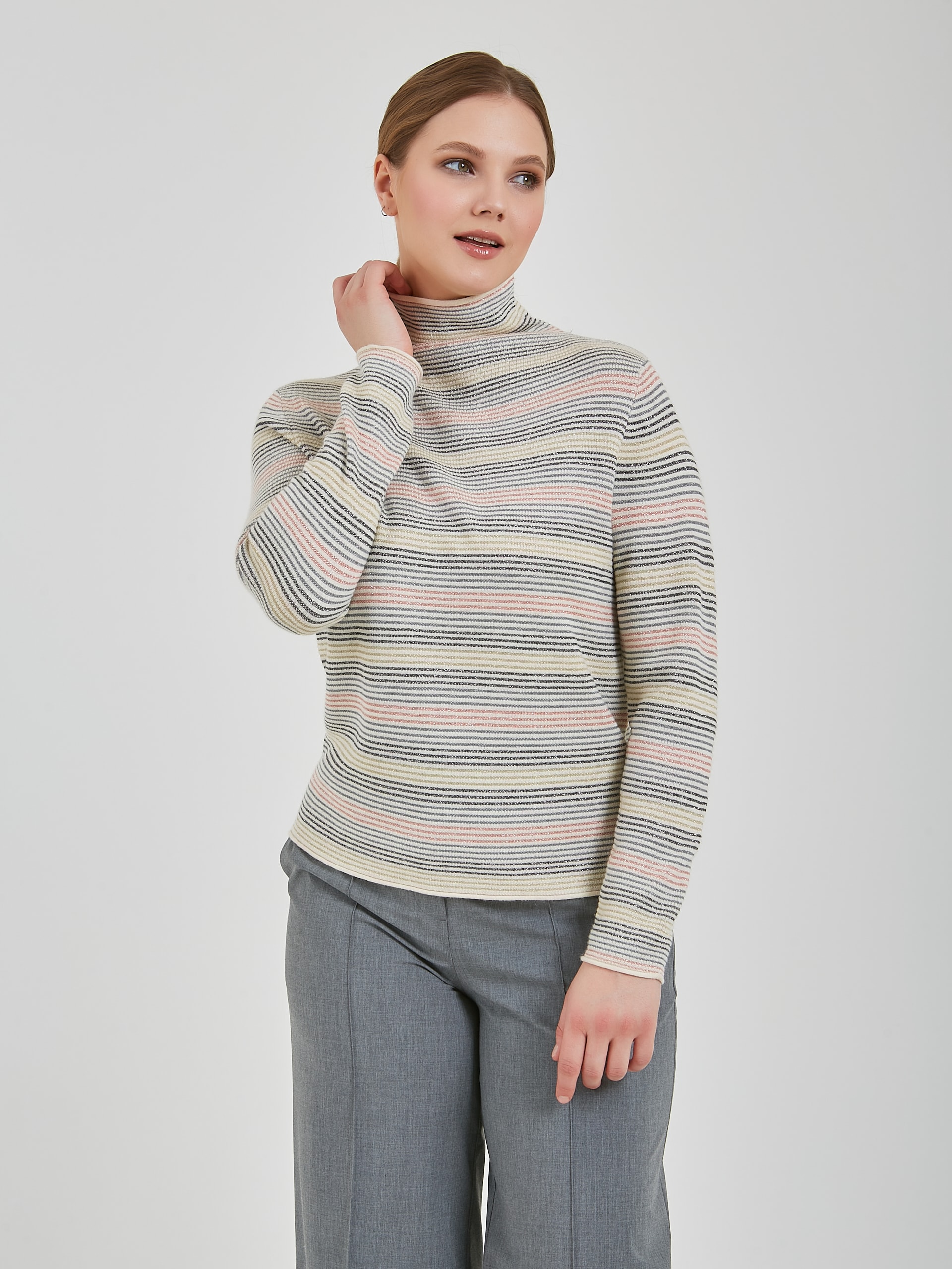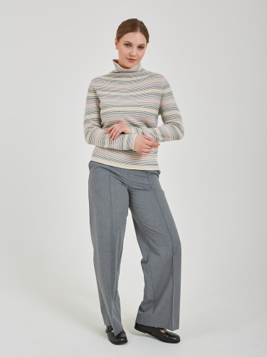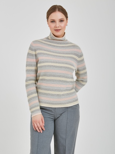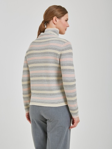 Универсальный джемпер с тонкими горизонтальными полосами в розовом, голубом и серебристом оттенках. Модель свободного силуэта с мягким несдавливающим воротником. Осень-Зима'25/26. Капсула "Вишневый сад"