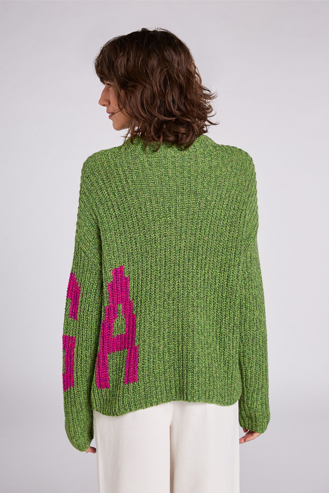 Свитер крупной вязки с оригинально расположенной вязаной надписью "МЕГА" - «ME» спереди, «G» на левой руке, «A» на спине. Стильное цветовое сочетание зеленого и фуксии. Свободный силуэт, короткий воротник-стойка. Длина 50 см для 42 российского размера. Рост модели 178 см, ее размер - 42.