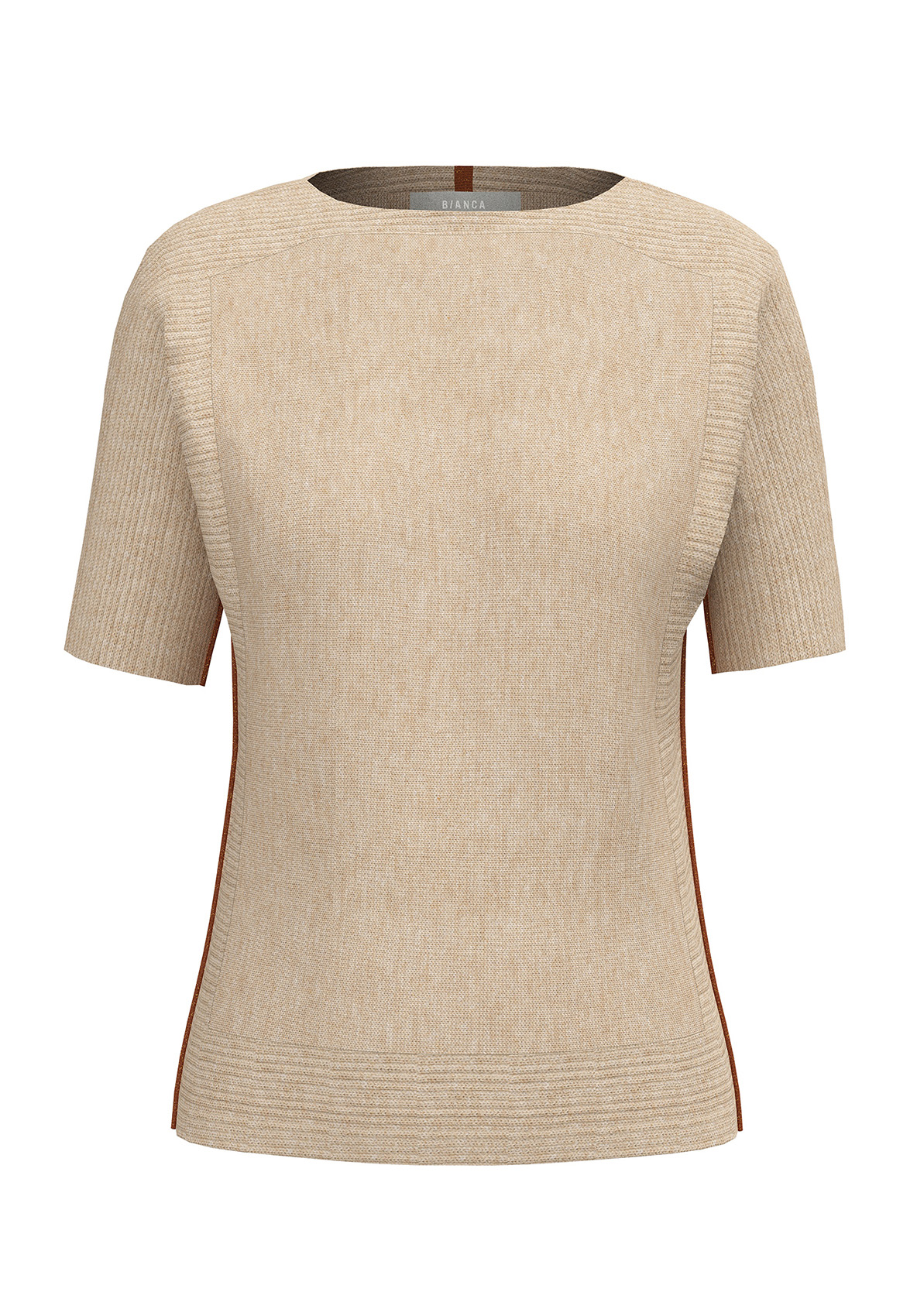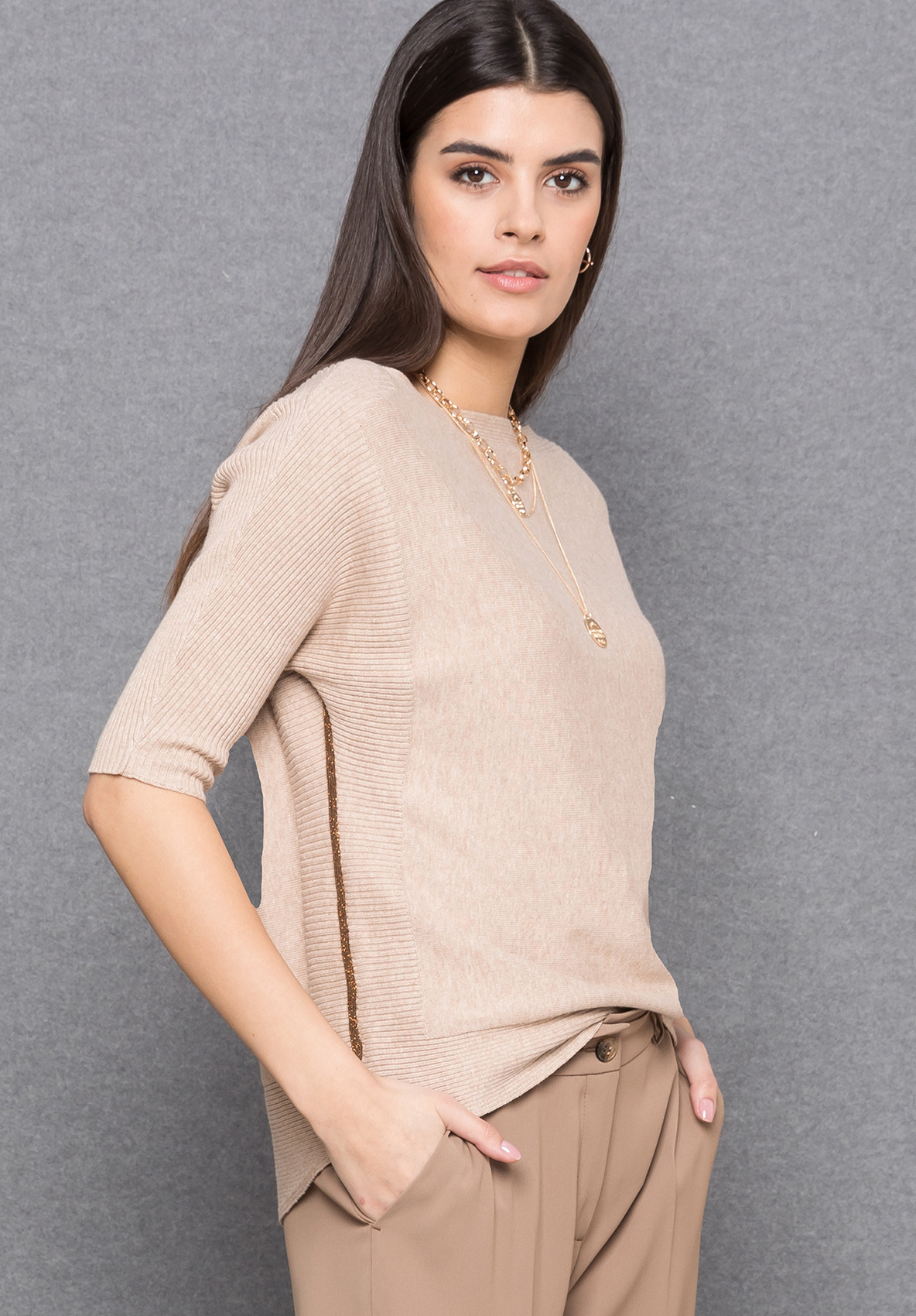 Этот джемпер - шикарный компаньон во множестве образов. Посадка по фигуре, вырез горловины "лодочка", рукава 1/2, закругленная спинка. Этот утонченный по дизайну джемпер имеет множество изысканных элементов. В полотне сочетаются различные типы машинной вязки, а по бокам изделия, на рукавах и на спинке располагаются лампасы, которые имеют ненавязчивый блеск благодаря нити люрекса. Приятный к телу материал из смеси хлопка и лиоцелла обеспечивает комфорт в ношении.