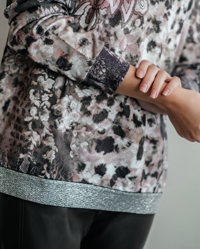 Сочетание анималистичного и цветочного дизайна для создания женственного и яркого образа. Состав из смесового хлопка обеспечит комфортное ношение. Украшение в виде декоративной ленты по низу изделия. Втачной рукав полной длины с манжетой.