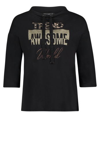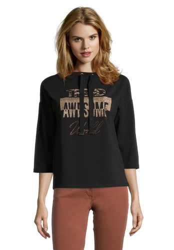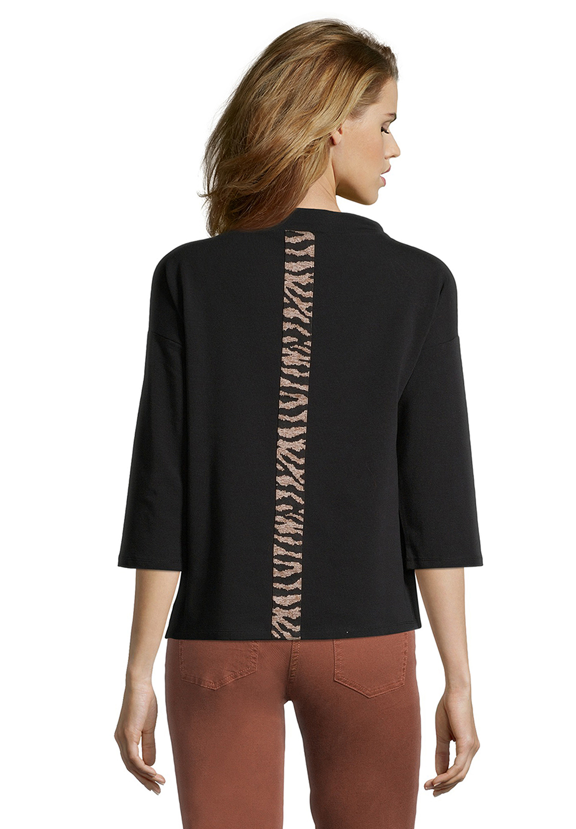 Джемпер прямого покроя. Рукава 3/4 со спущенным плечом, воротник с завязками. Перед изделия декорирован металлизированным принтом. Контрастная вставка с анималистическим принтом на спинке. Приятный эластичный материал из смеси хлопка и модала.