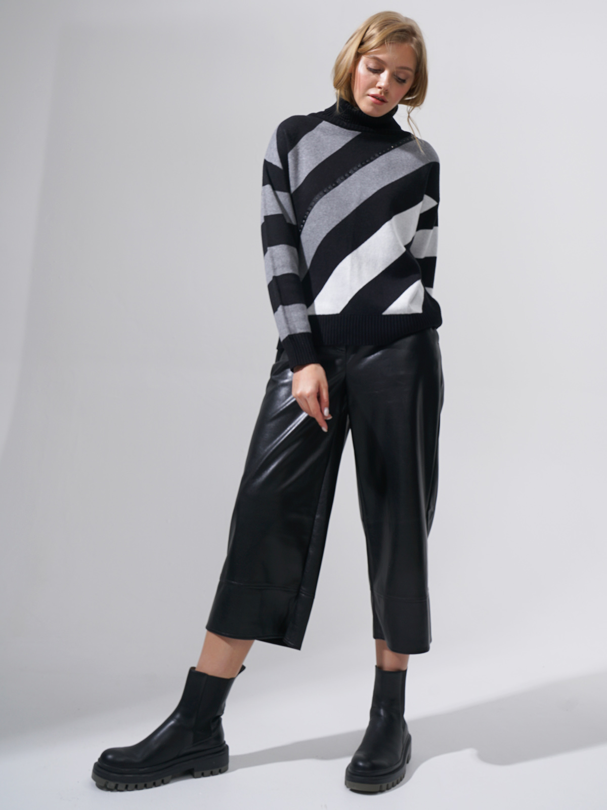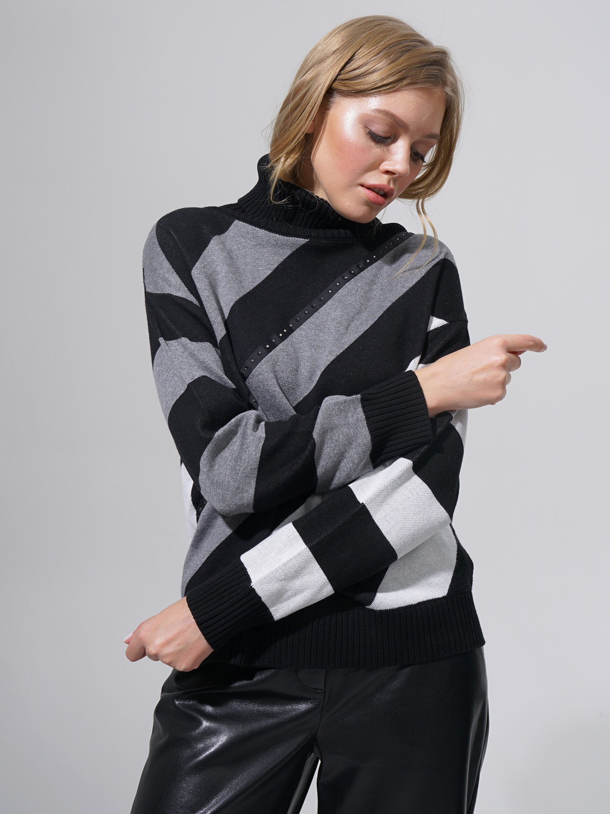 Теплый джемпер с широкими диагональными полосами. Базовое сочетание цветов разбавляется лаконичным декором в виде страз. Высокий воротник-стойка. Прямой крой подходит для любого типа фигуры.