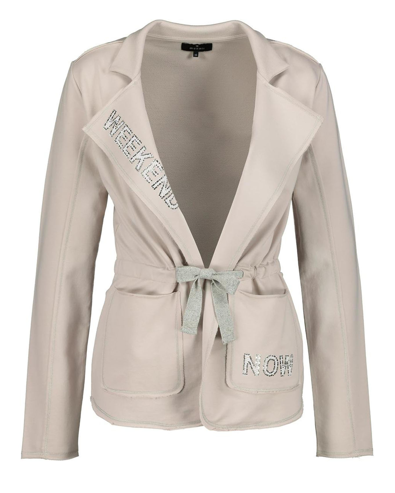 Кардиган песочного цвета. Отложной воротник, кулиска на талии, накладные карманы. Стальный декор из страз. Открытые срезы изделия создают демократичный образ.