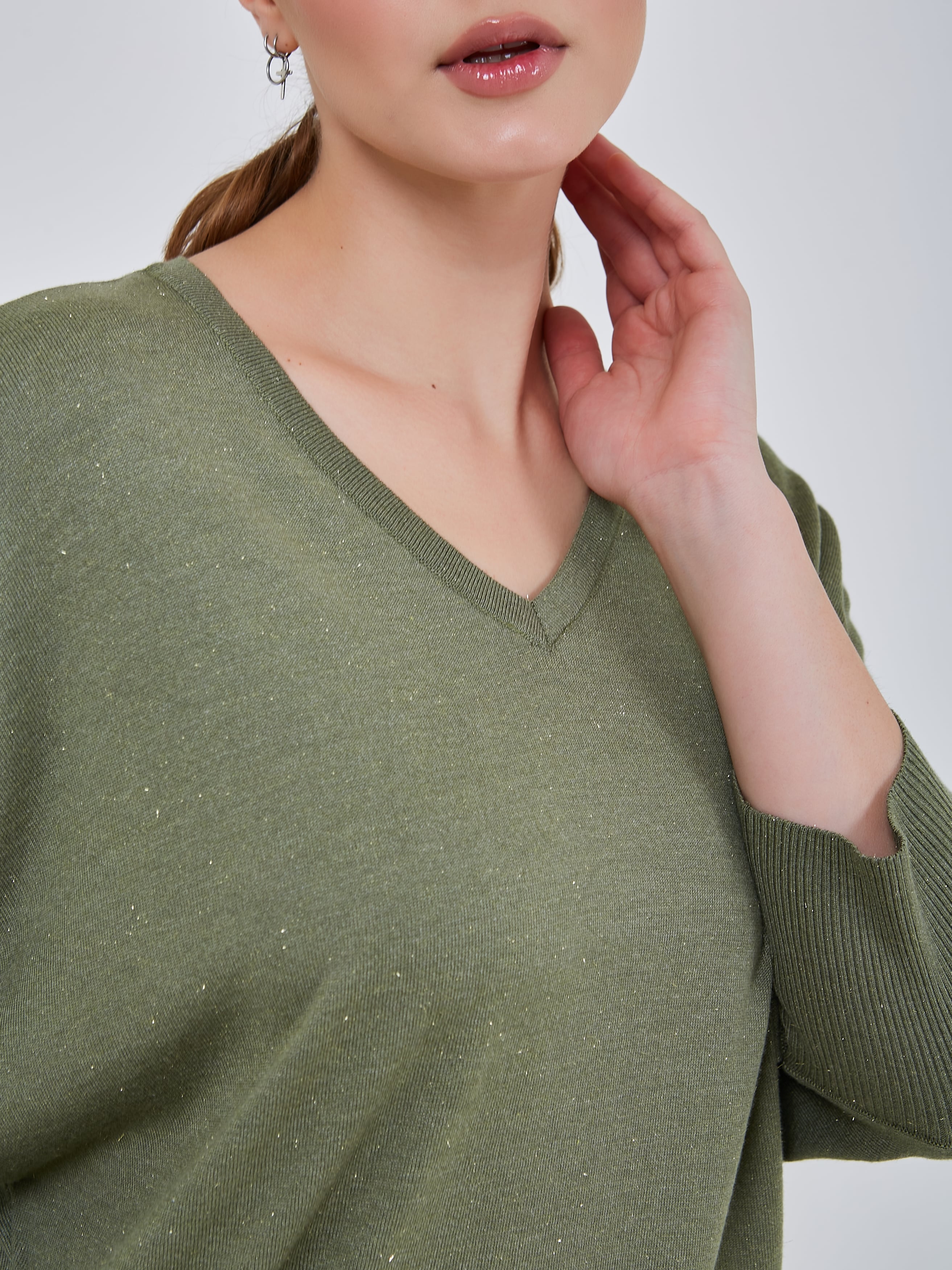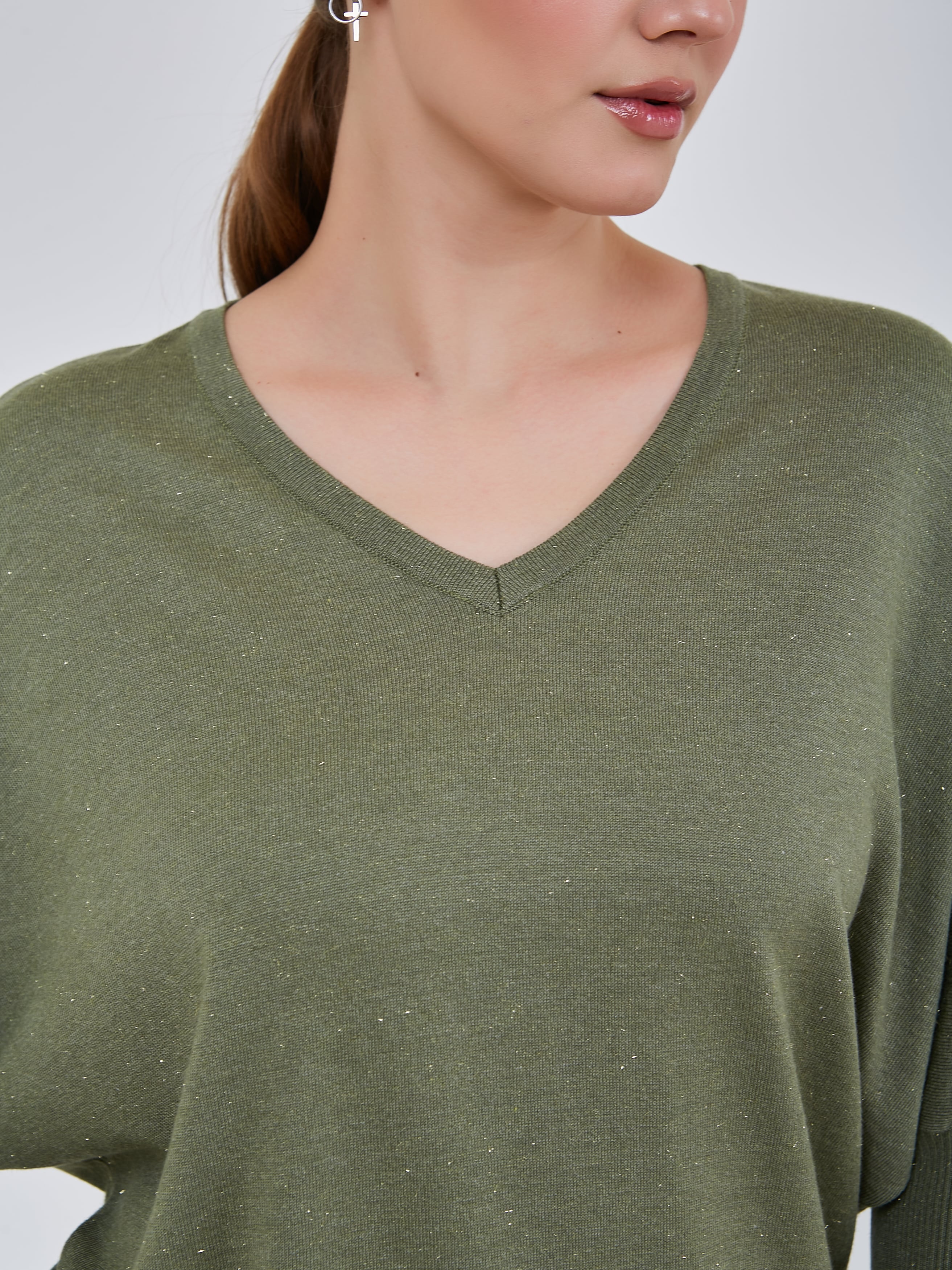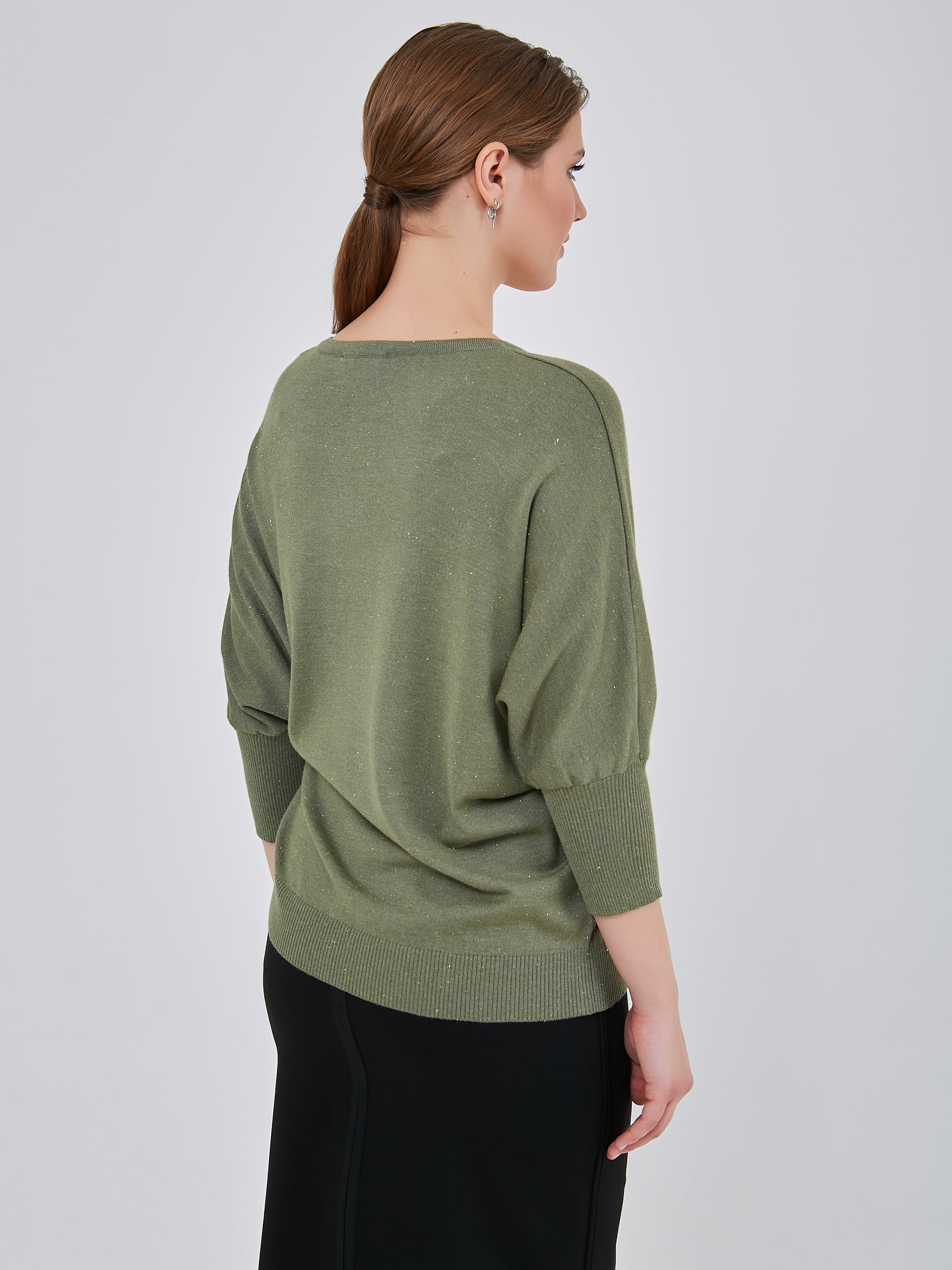 Джемпер насыщенного и мягкого оттенка "шалфей" с люрексным блеском и сглаженным треугольным вырезом горловины. Рукав - летучая мышь длиной 3/4. Осень-Зима'25/26. Капсула "Малахитовая шкатулка"