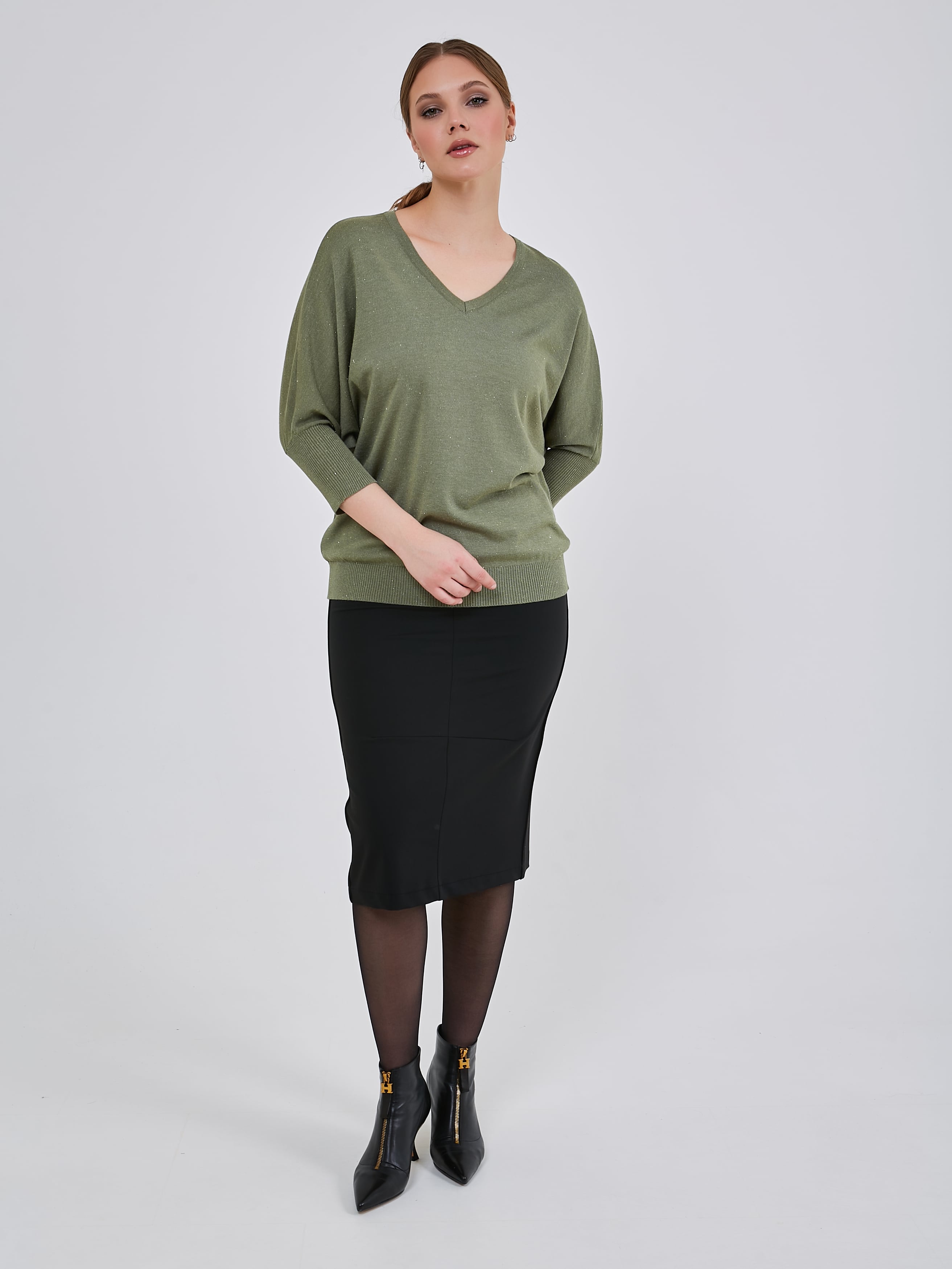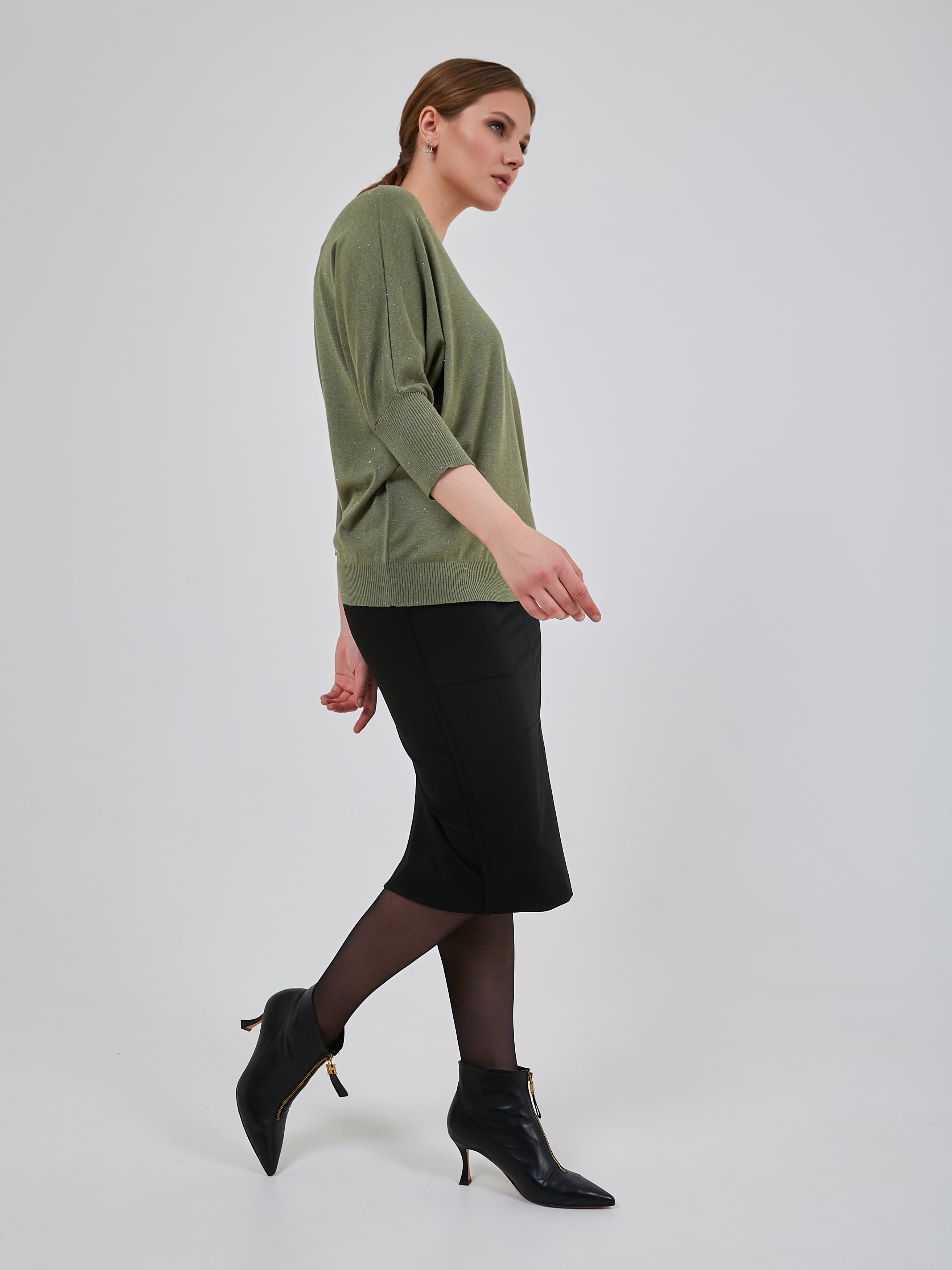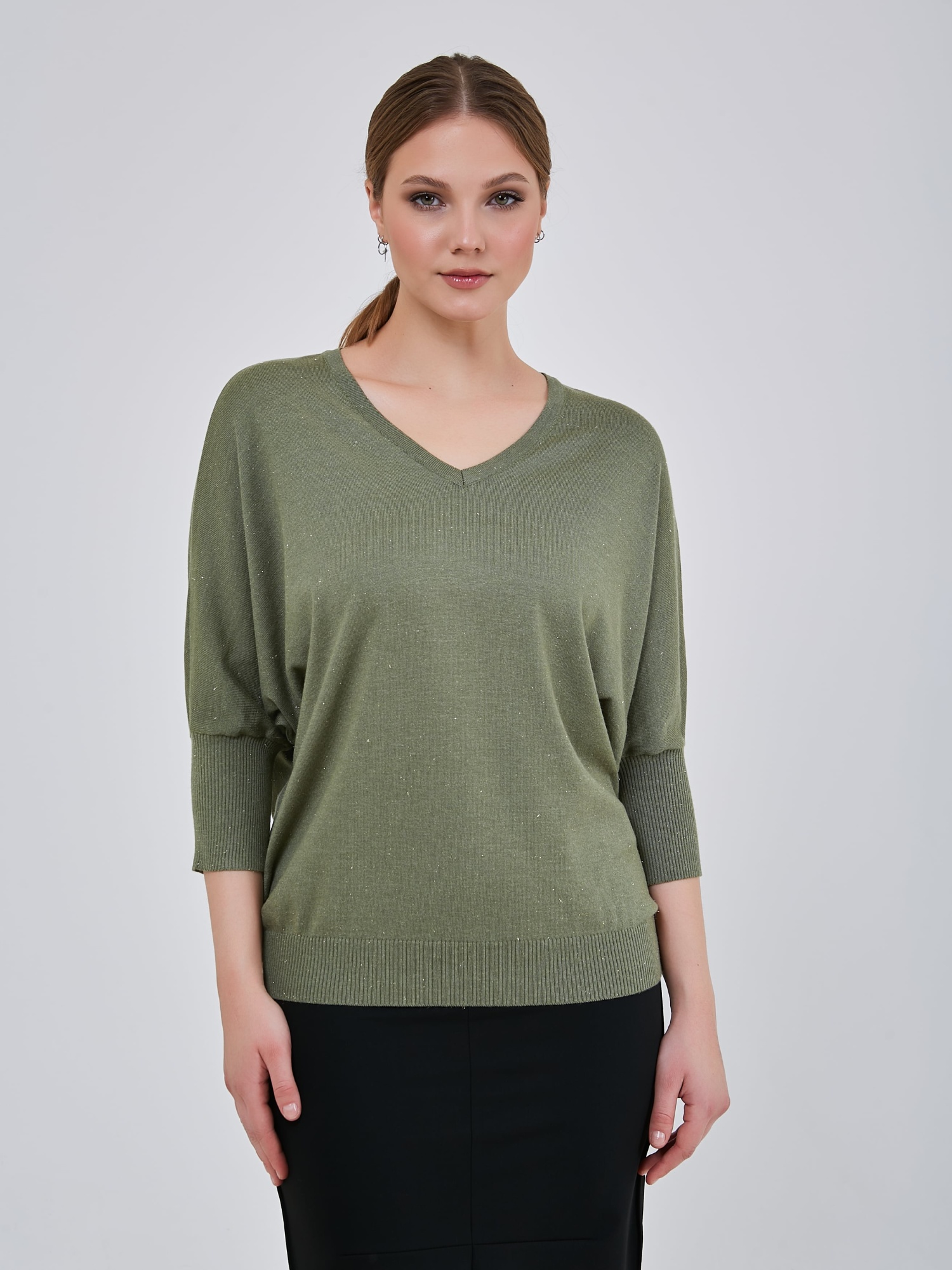 Джемпер насыщенного и мягкого оттенка "шалфей" с люрексным блеском и сглаженным треугольным вырезом горловины. Рукав - летучая мышь длиной 3/4. Осень-Зима'25/26. Капсула "Малахитовая шкатулка"