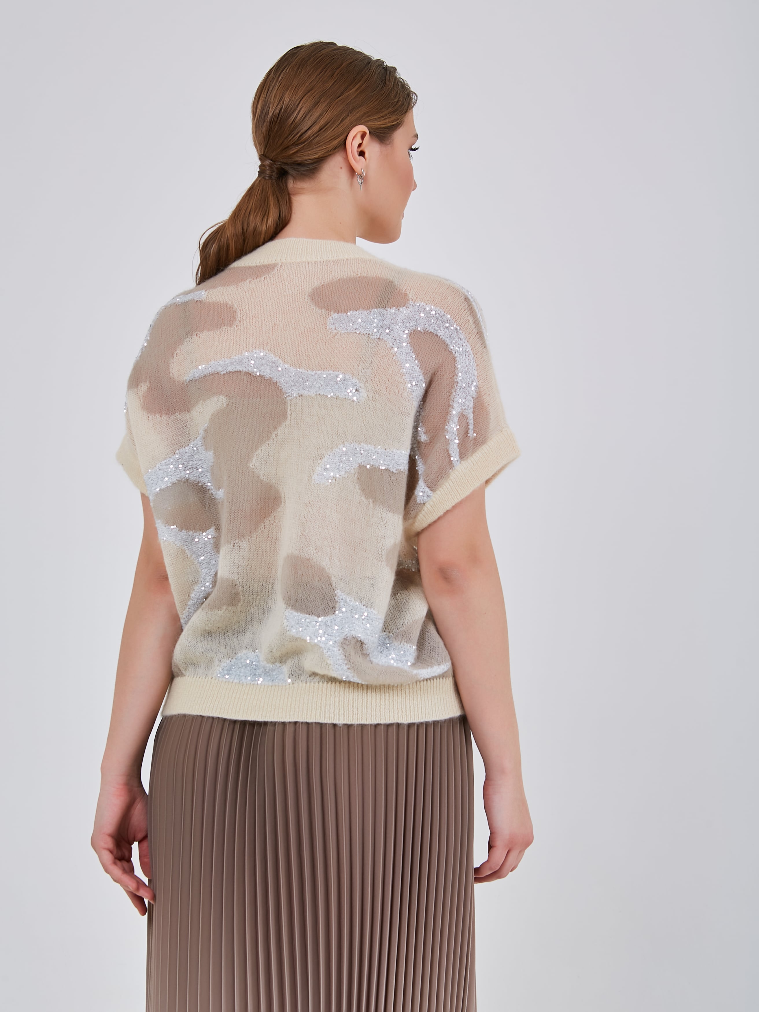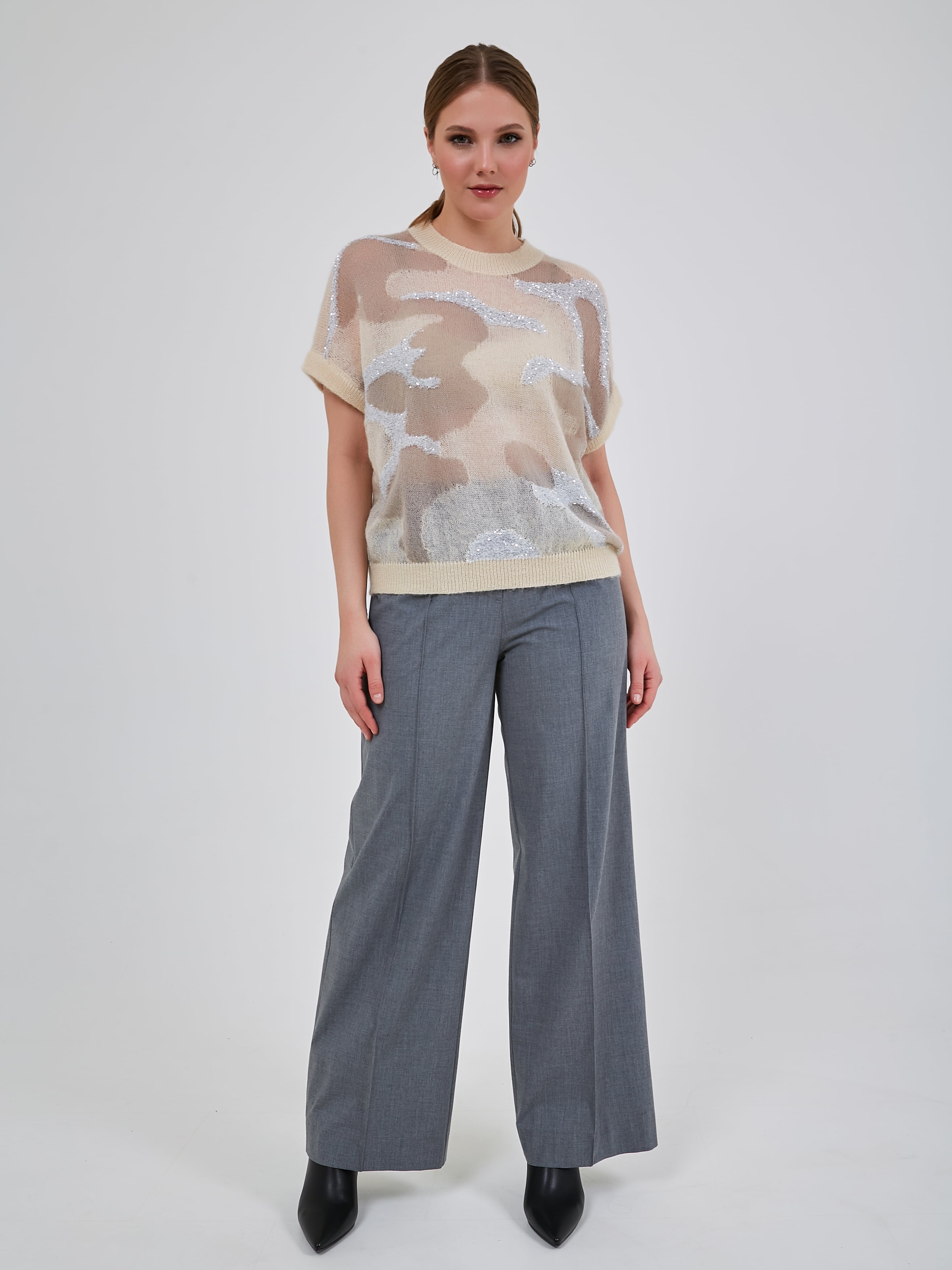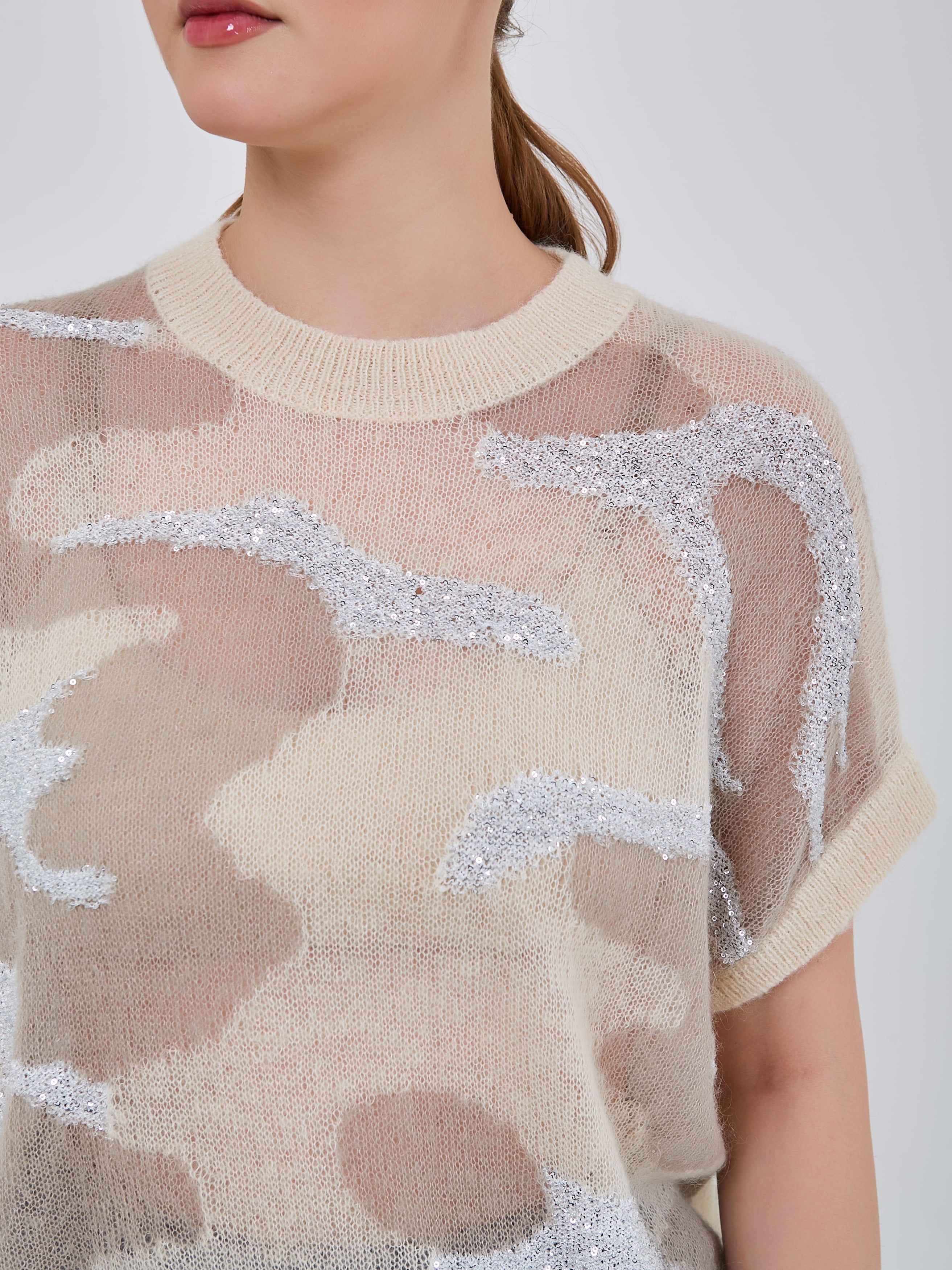 Нарядный джепер с комбинированной вязкой в виде анималистичного узора. Рукав короткий цельнокроенный с узкой эластичной манжетой. Коллекция Осень-Зима 2024-2025. Капсула "Крадущийся тигр, затаившийся дракон".