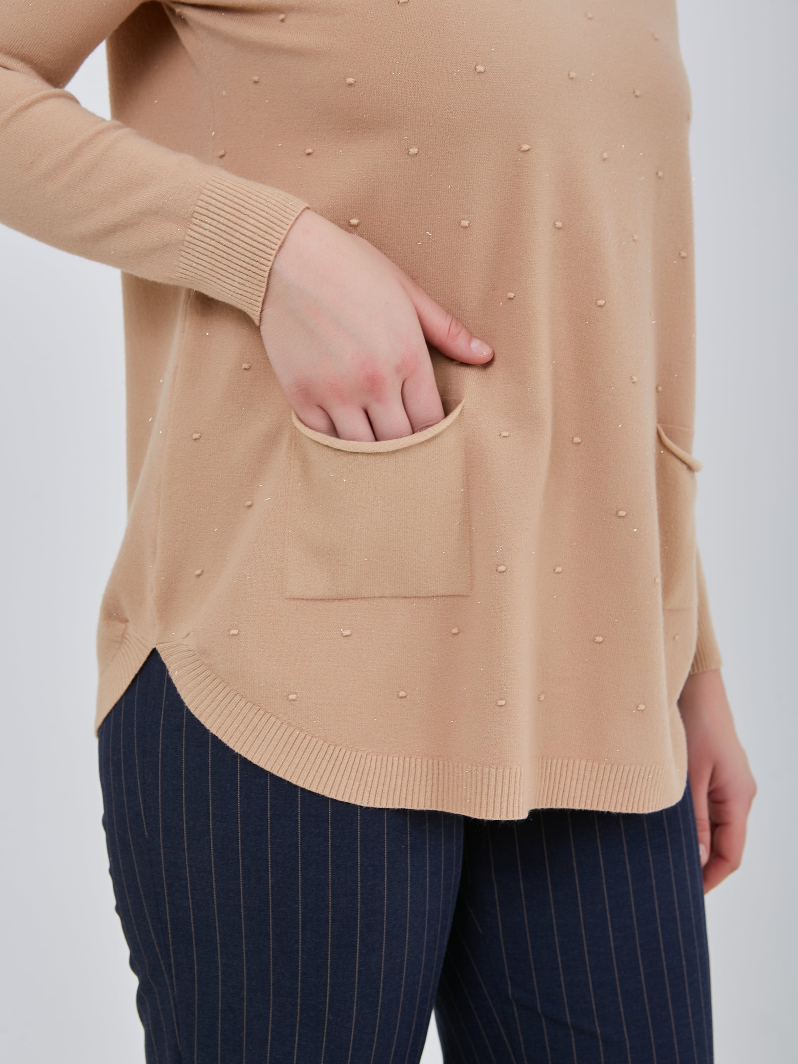 Удлинённый джемпер прямого кроя с небольшими карманами, круглой горловиной и резинками на манжетах.