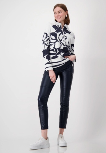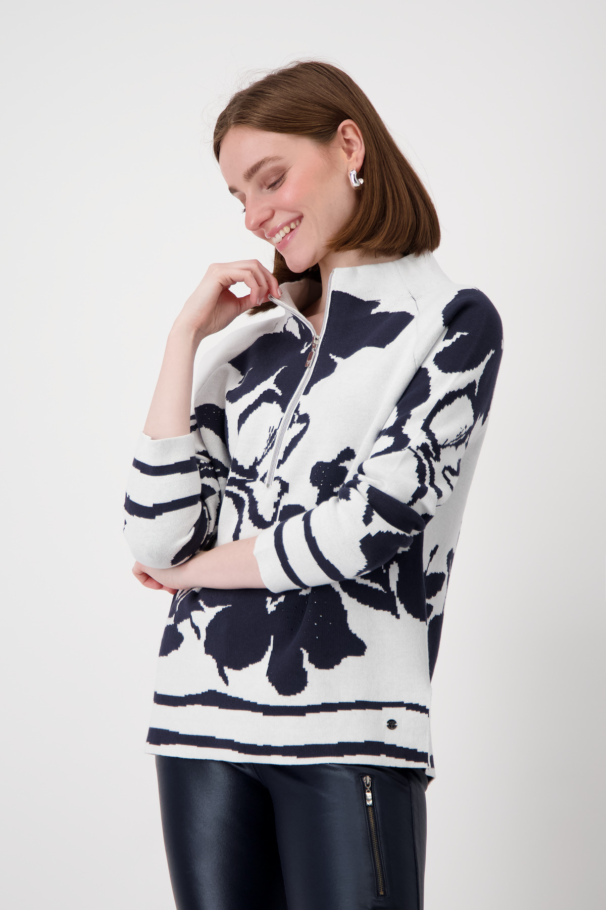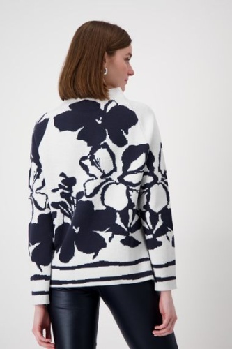 Свитер MONARI из высококачественного хлопка с цветочным узором по всей поверхности, воротником-стойкой на молнии, длинными рукавами реглан и боковыми разрезами.