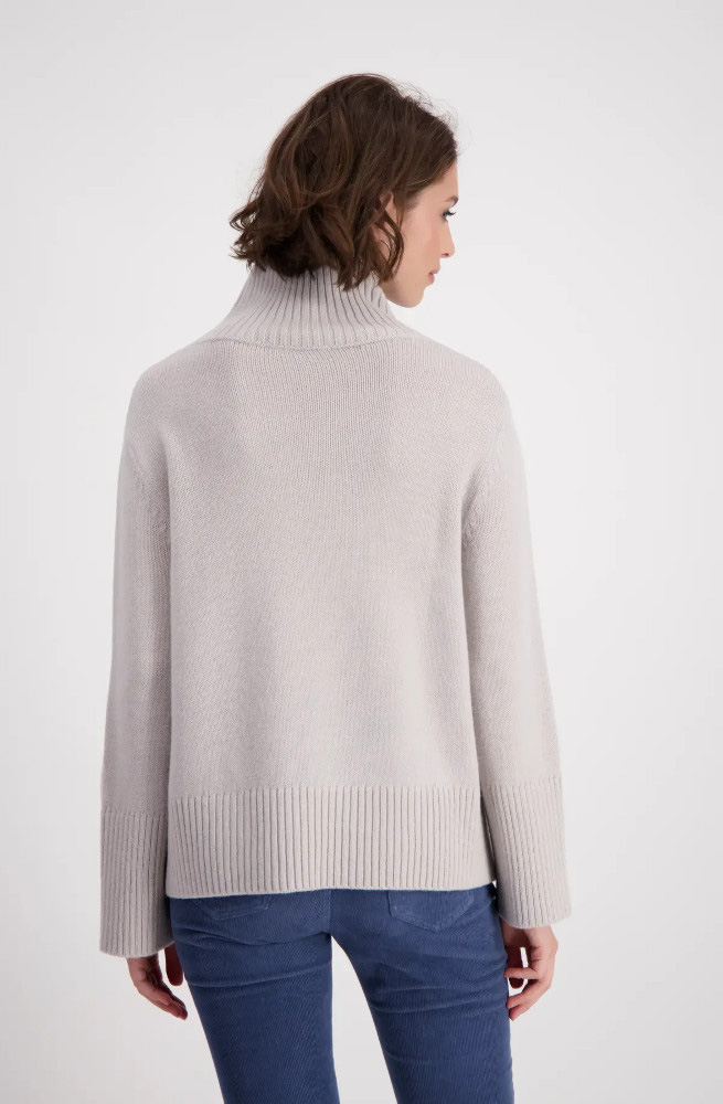 Вязаный свитер MONARI выделяется ребристым воротником-стойкой, широкими манжетами и развитым боковым швом с боковыми разрезами.