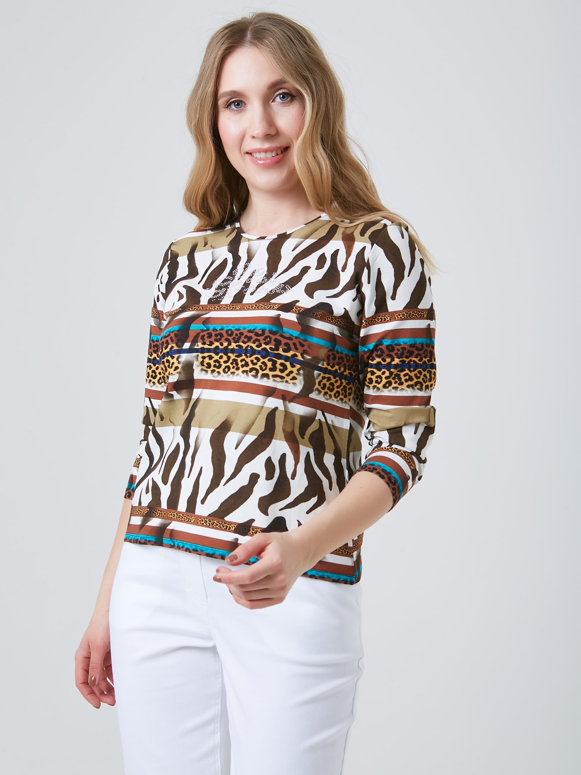Лонгслив с рукавом 3/4, круглым вырезом и нетривиальным принтом собравшим все оттенки сафари. Коллекция Весна-Лето 2025. Капсула "Рио де Жанейро". Параметры модели: 89-70-92, рост 167, размер 44-46