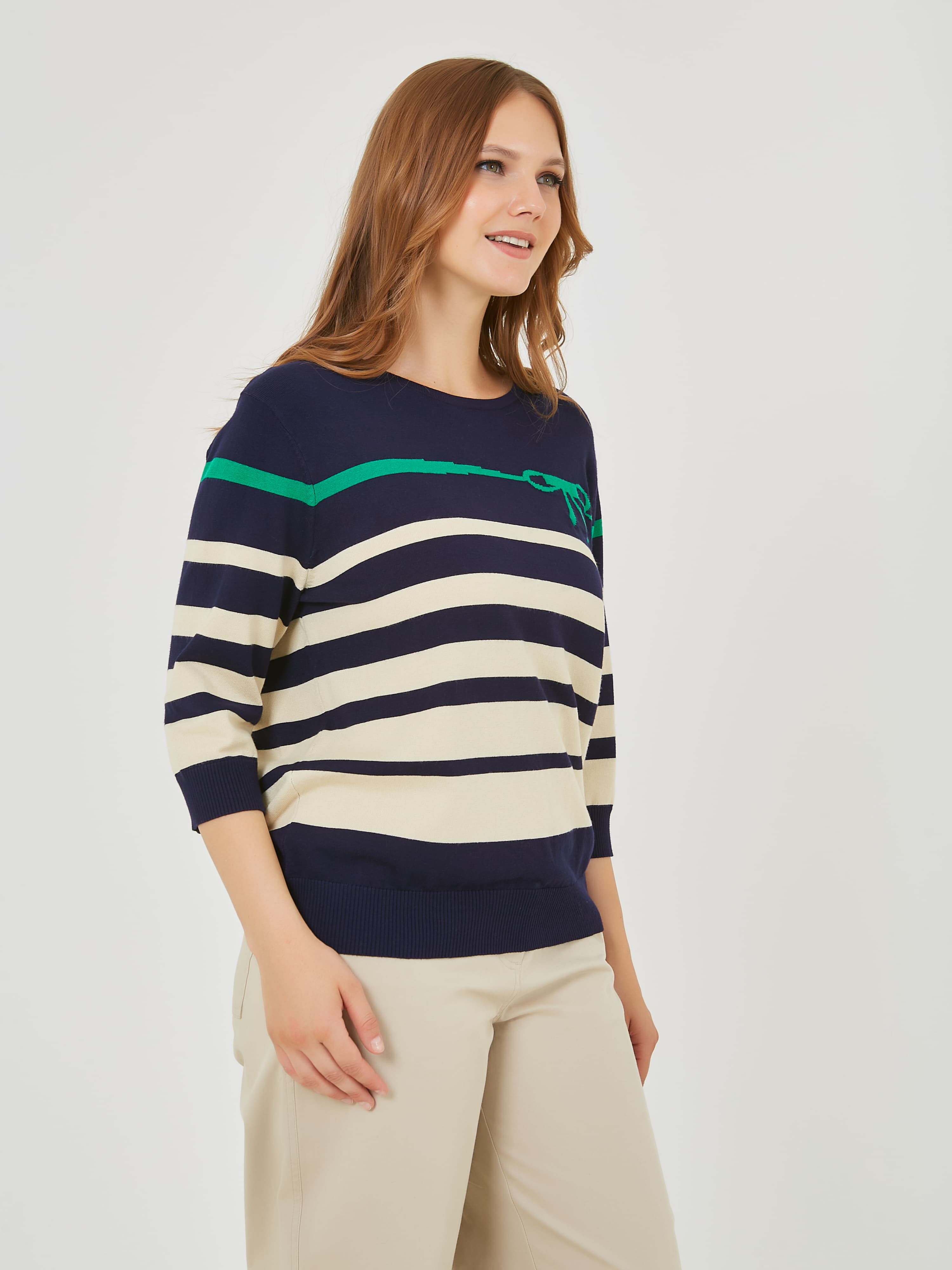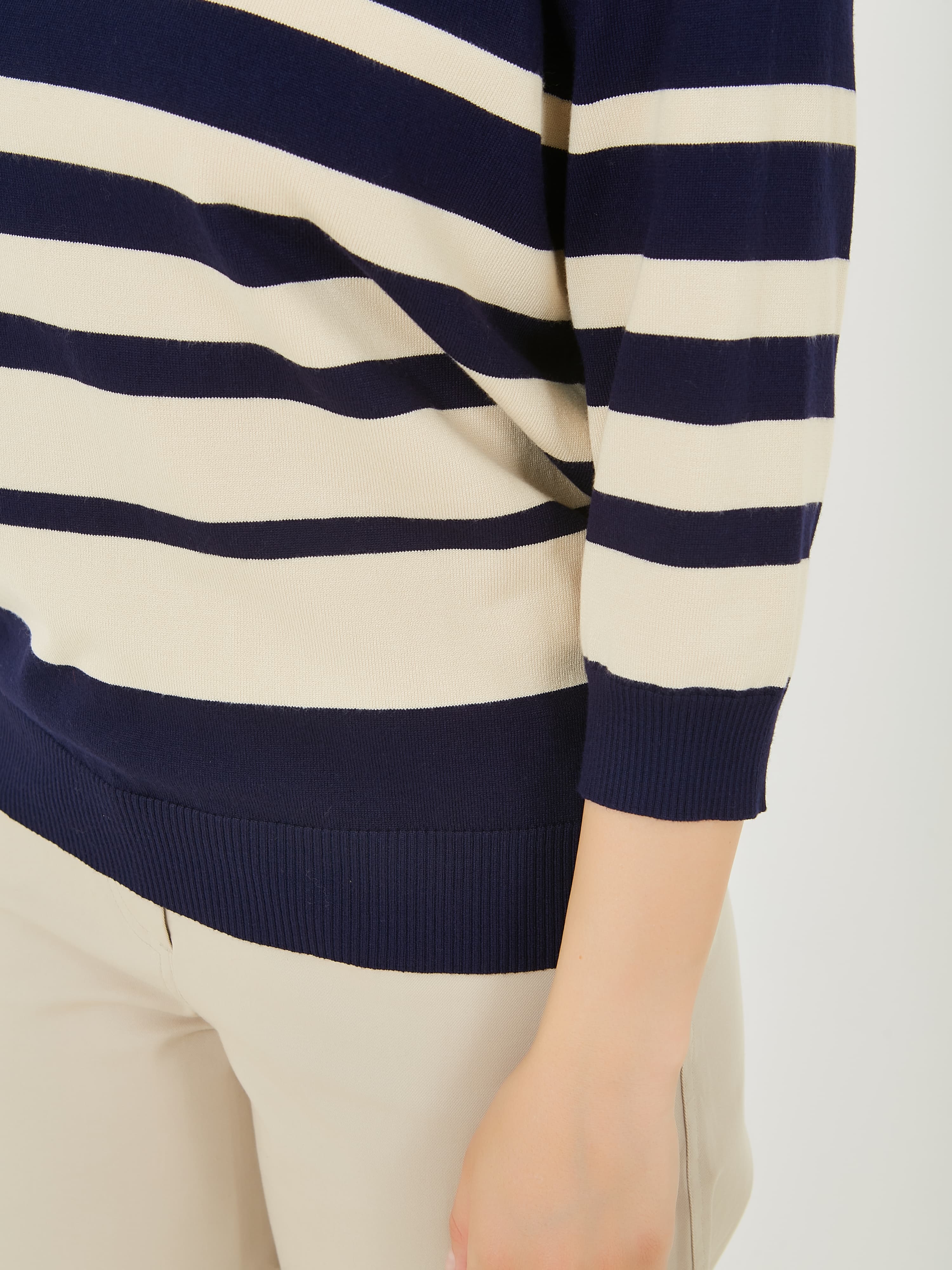 Классический джемпер с полосками различной ширины. Весна-Лето 2025. Капсула "Марракеш". Параметры модели: 95-64-101, рост 175, размер 44-46