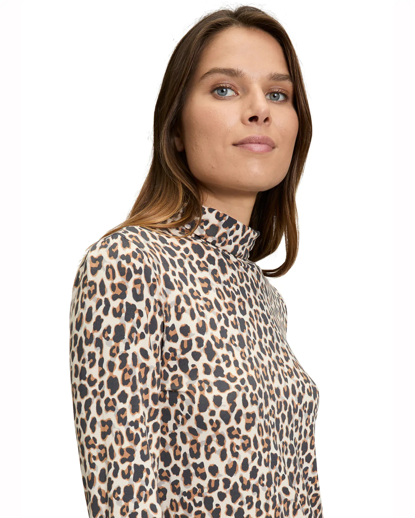 Приталенная водолазка бежевого цвета в леопардовый принт. Модель с воротником-стойкой и длинными рукавами с широкими манжетами.
