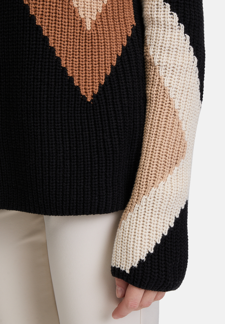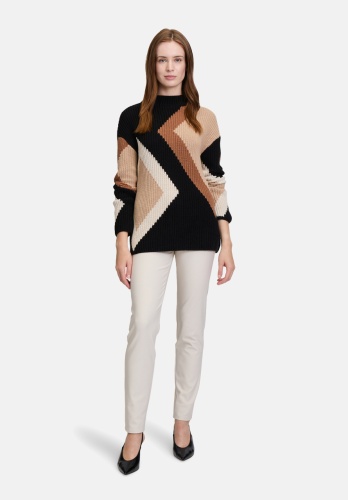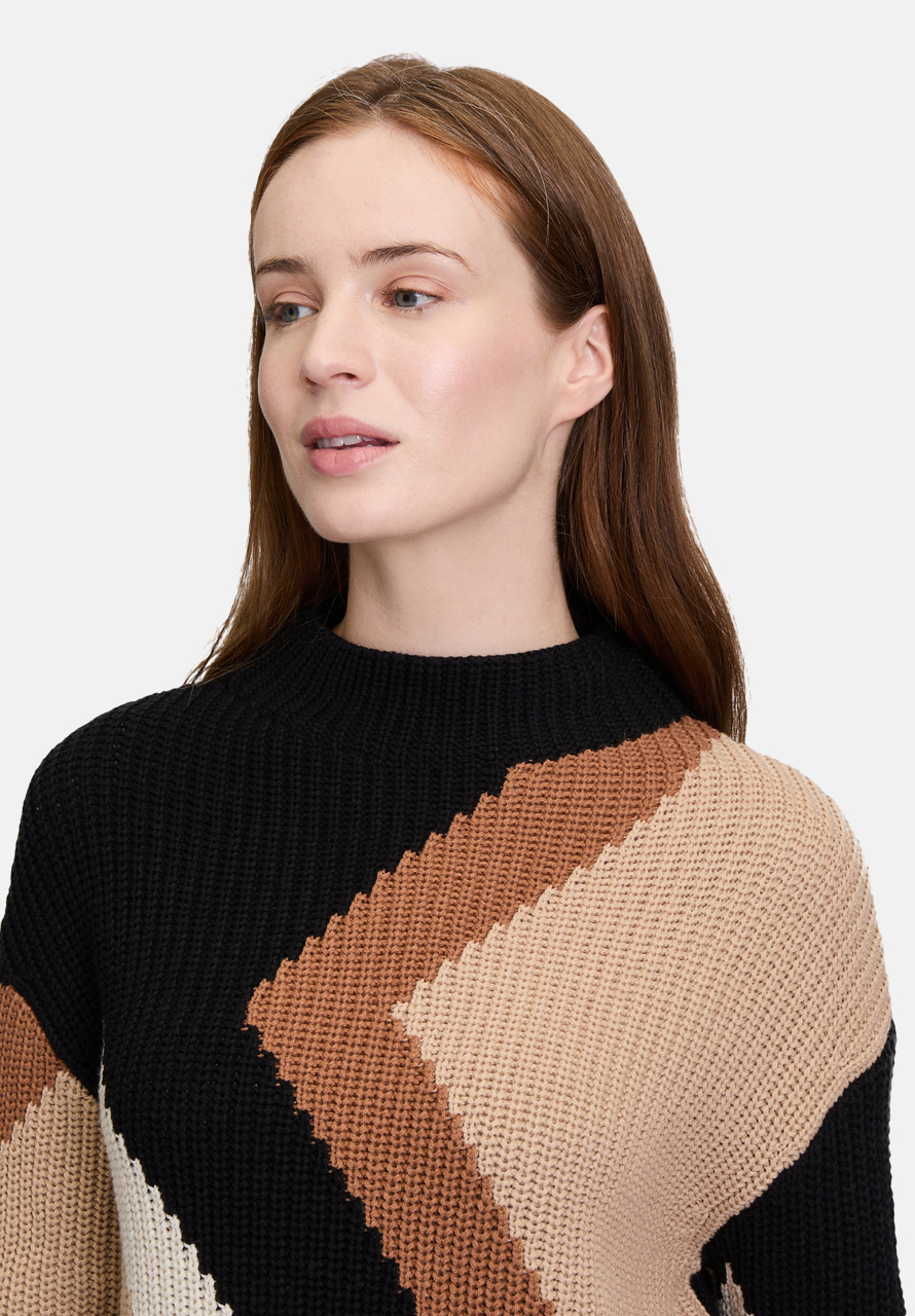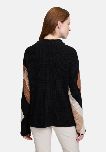 Свитер сочетает в себе высокое качество, комфорт и модный дизайн. Изделие изготовлено из мягкого трикотажного материала и имеет простой графический рисунок, который создает современный и неподвластный времени образ. Воротник-стойка придает свитеру стильный вид и в то же время защищает от холода. Длинные спущенные рукава обеспечивают свободный крой, идеально подходящий для повседневных образов